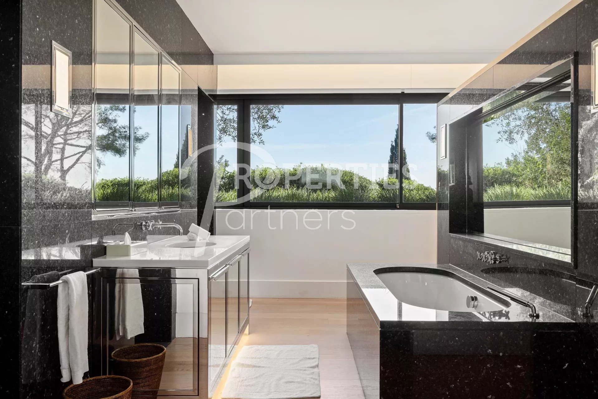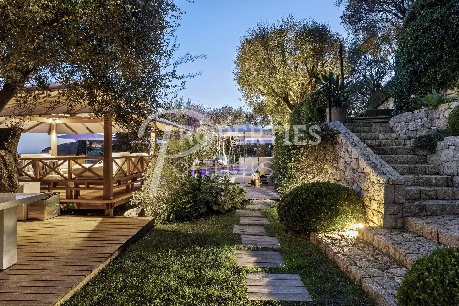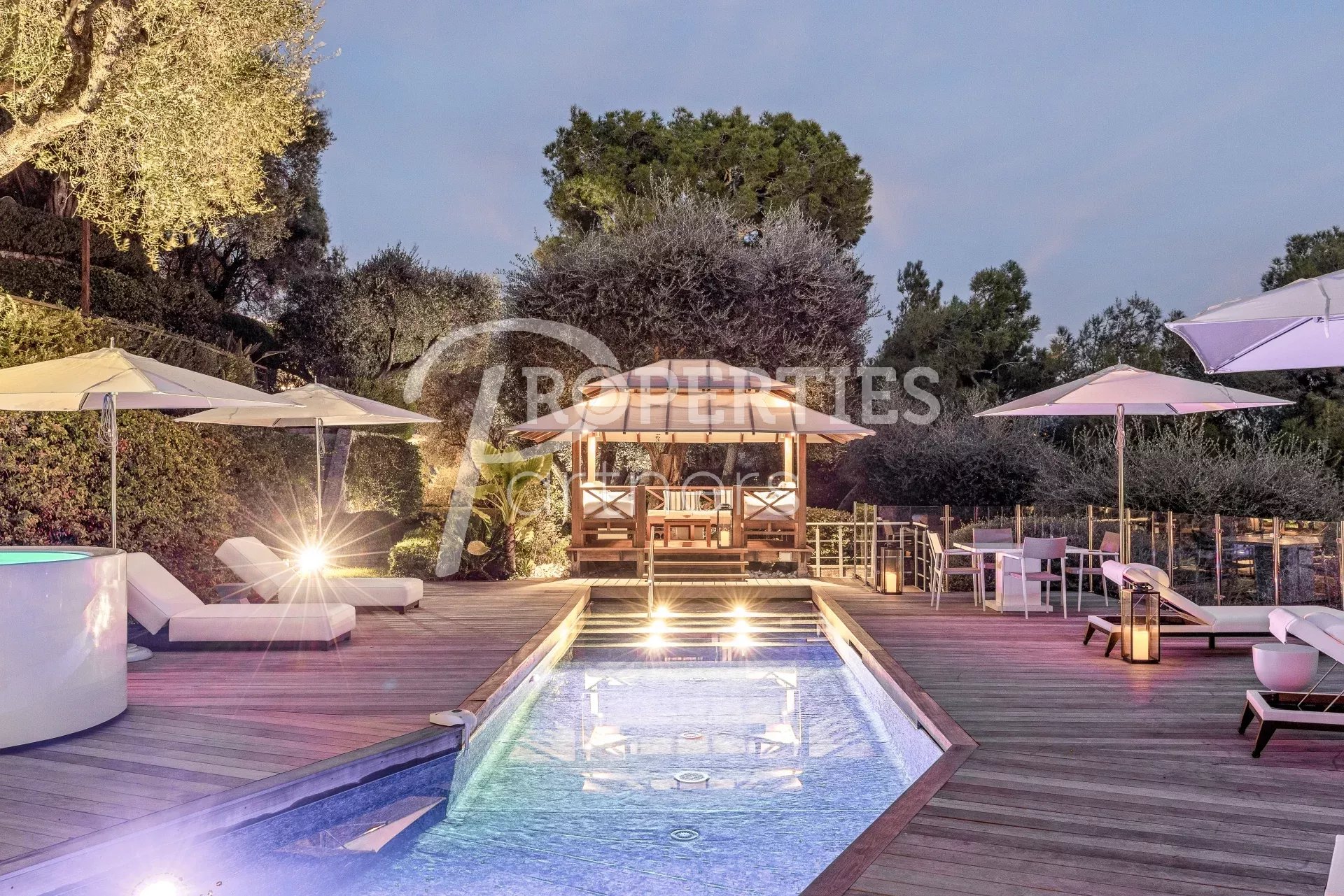 Avec de nombreuses terrasses extérieures et entourée de 4500 m² de jardin impeccablement entretenus et une piscine à débordement qui borde le jardin, la villa comprend 5 niveaux reliés par un escalier en spirale dans un atrium de 25m et un ascenseur en verre.