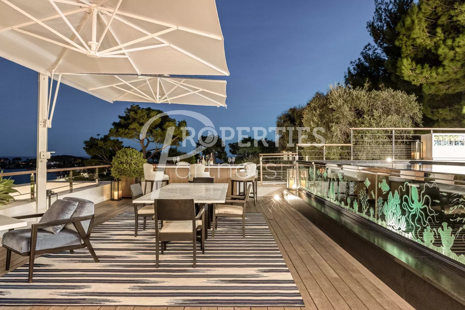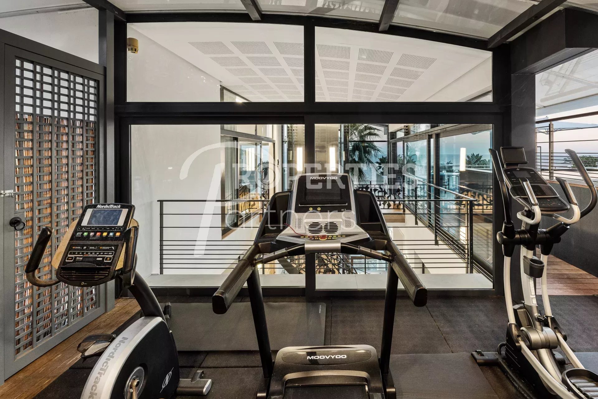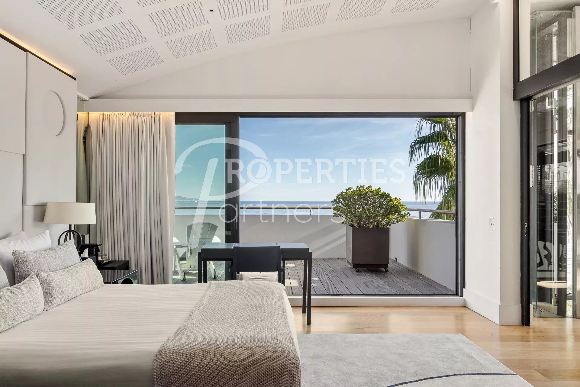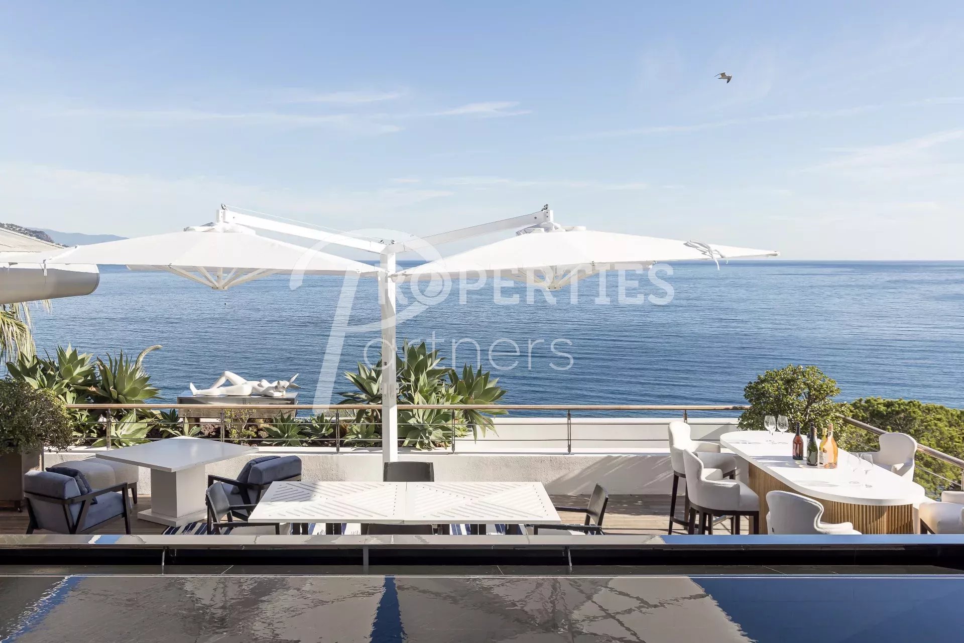 Le toit terrasse offre une belle chambre double avec salle de bains et dressing, une salle de fitness avec hammam, des espaces bain de soleil et massage, une salle à manger extérieure pour 16 convives et une piscine à débordement.