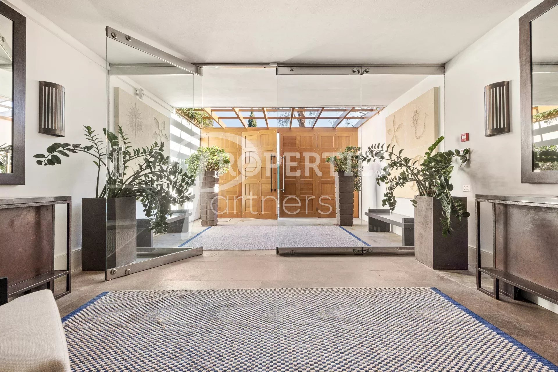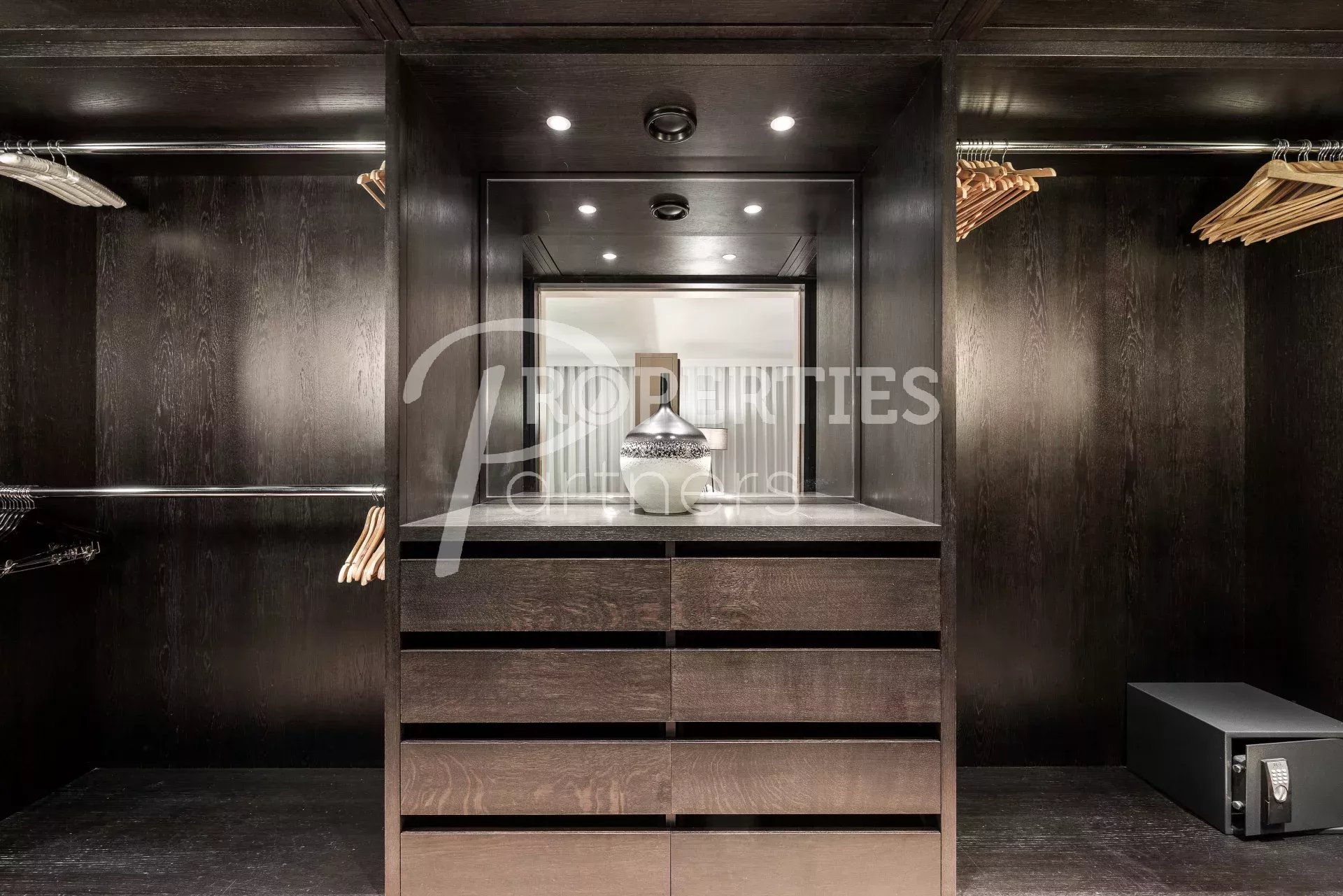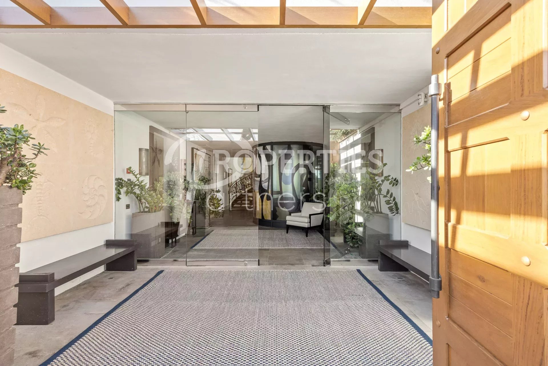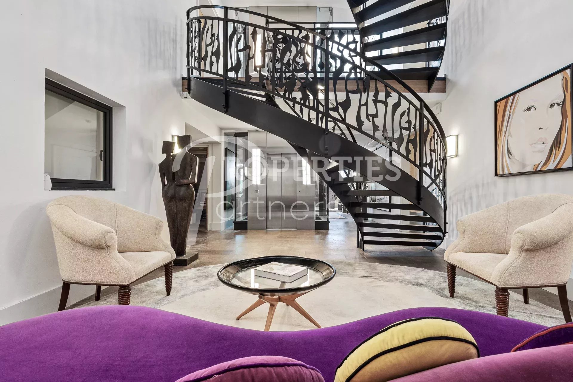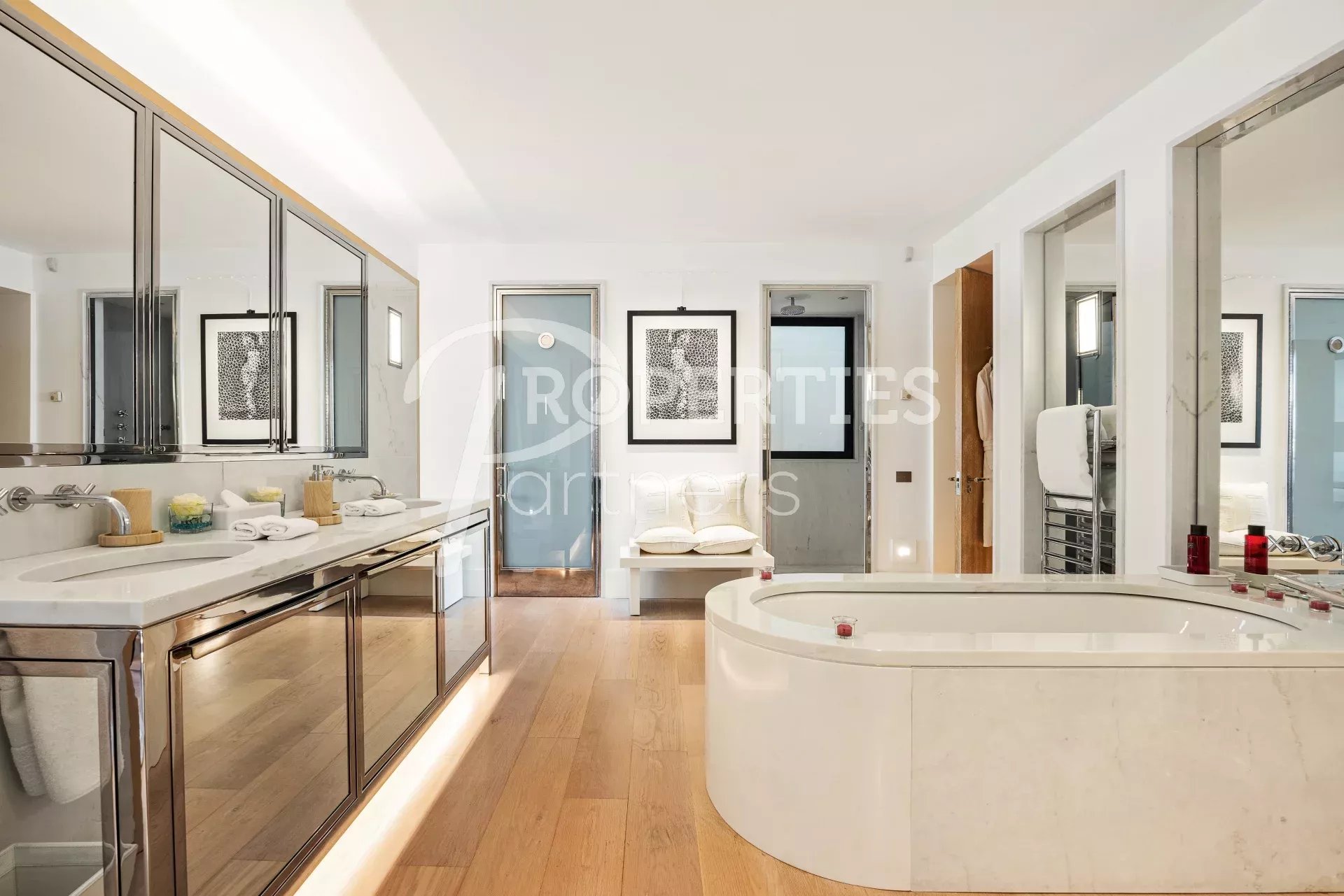 Le toit terrasse offre une belle chambre double avec salle de bains et dressing, une salle de fitness avec hammam, des espaces bain de soleil et massage, une salle à manger extérieure pour 16 convives et une piscine à débordement.