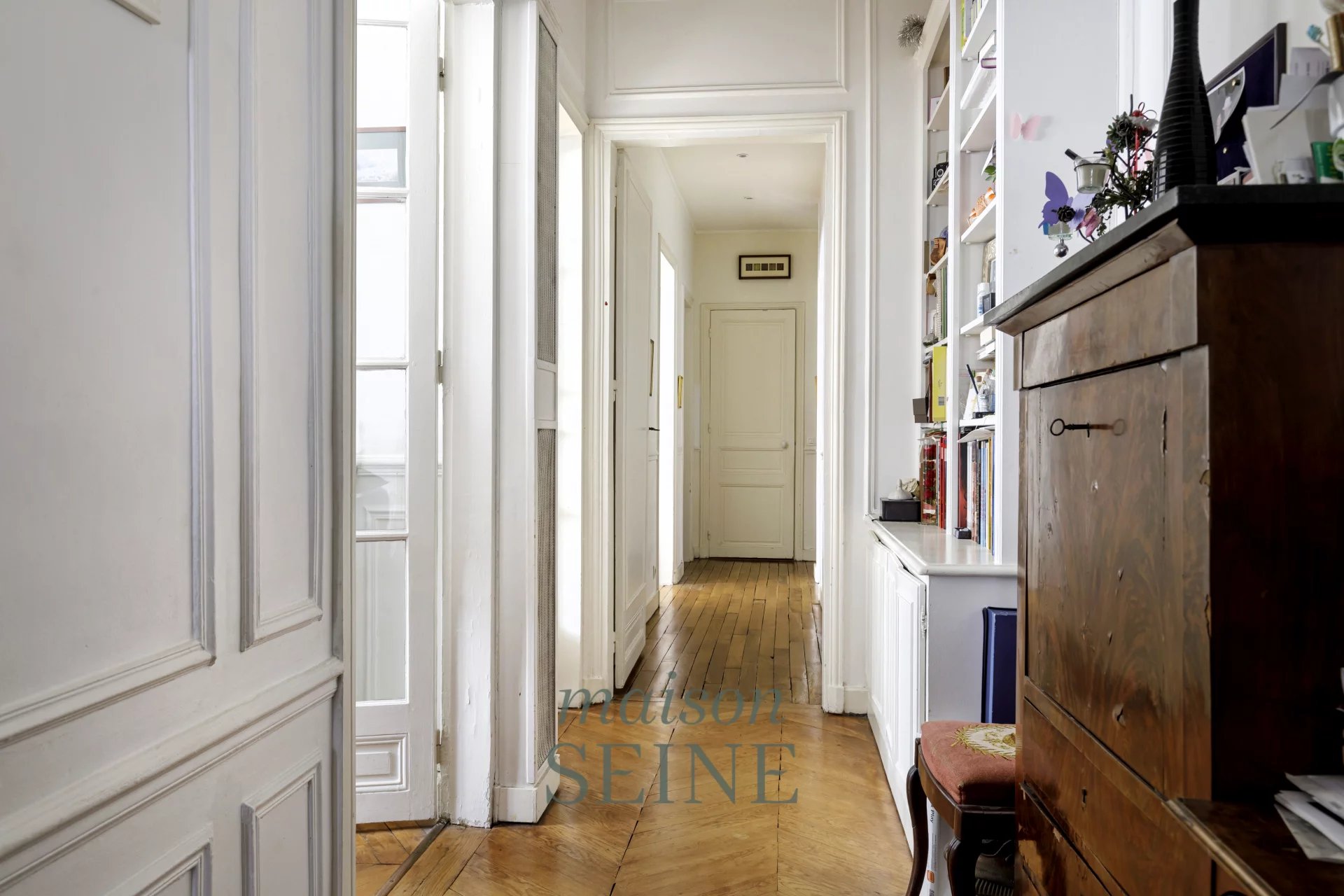 Il comprend une entrée desservant un double séjour avec parquet point de Hongrie, moulures, cheminée, très belle hauteur sous plafond, une cuisine indépendante meublée et équipée, une grande chambre parentale d'angle avec une salle de bain et un espace buanderie, deux autres grandes chambres, une salle de bains, un toilette indépendant.