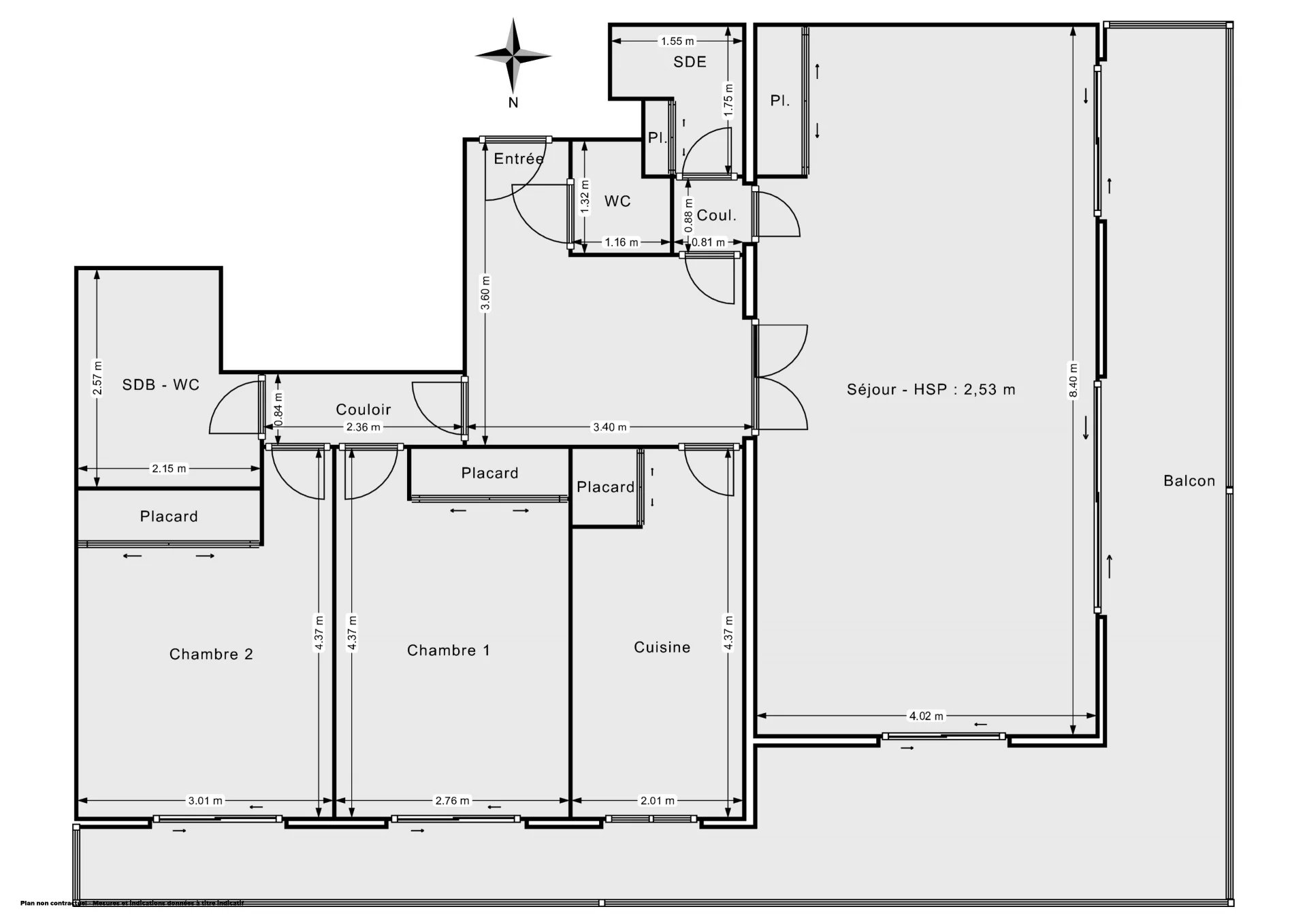 Le plan est composé d’une entrée, d’un grand séjour avec double exposition donnant sur le balcon de plus de 30m², d’une cuisine, de deux chambres bien proportionnées, d’une salle de bain, d’une salle d'eau additionnelle et de WC séparés.