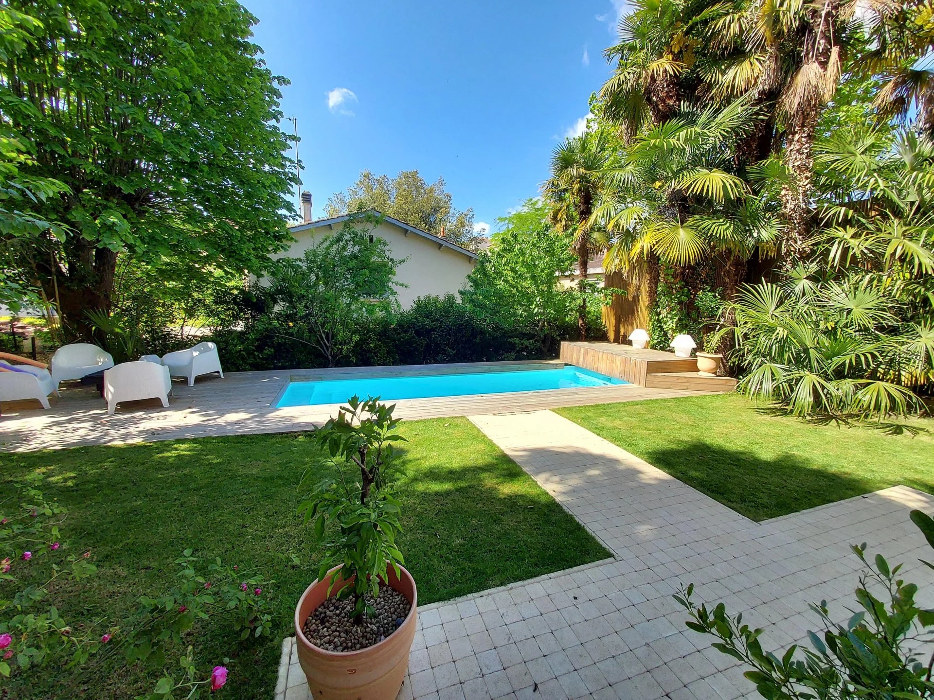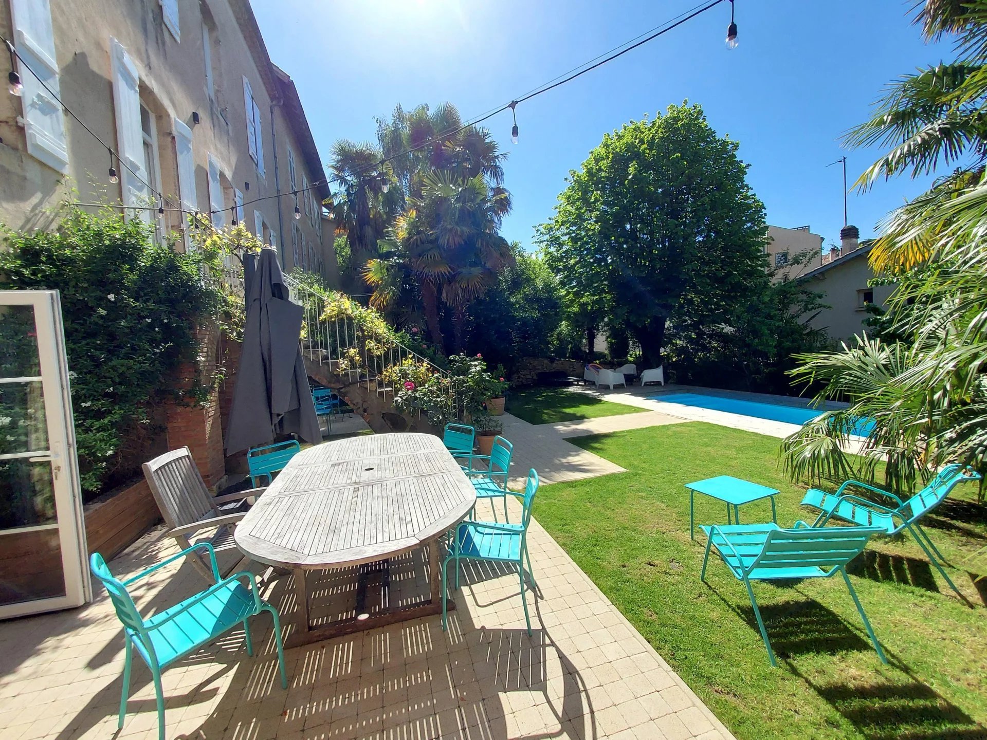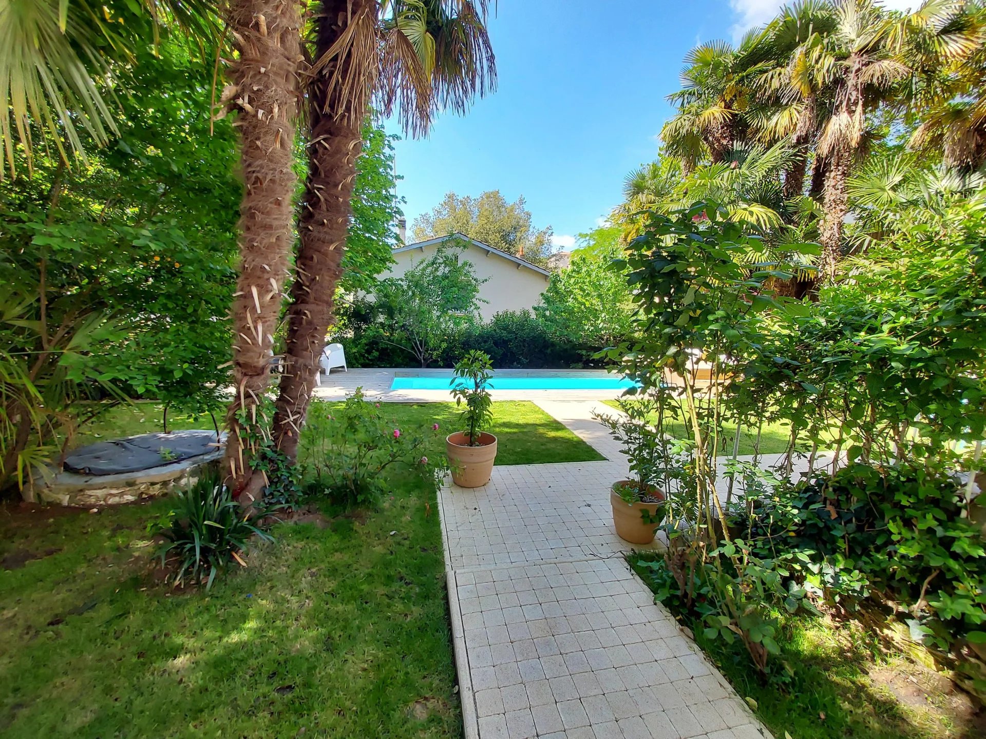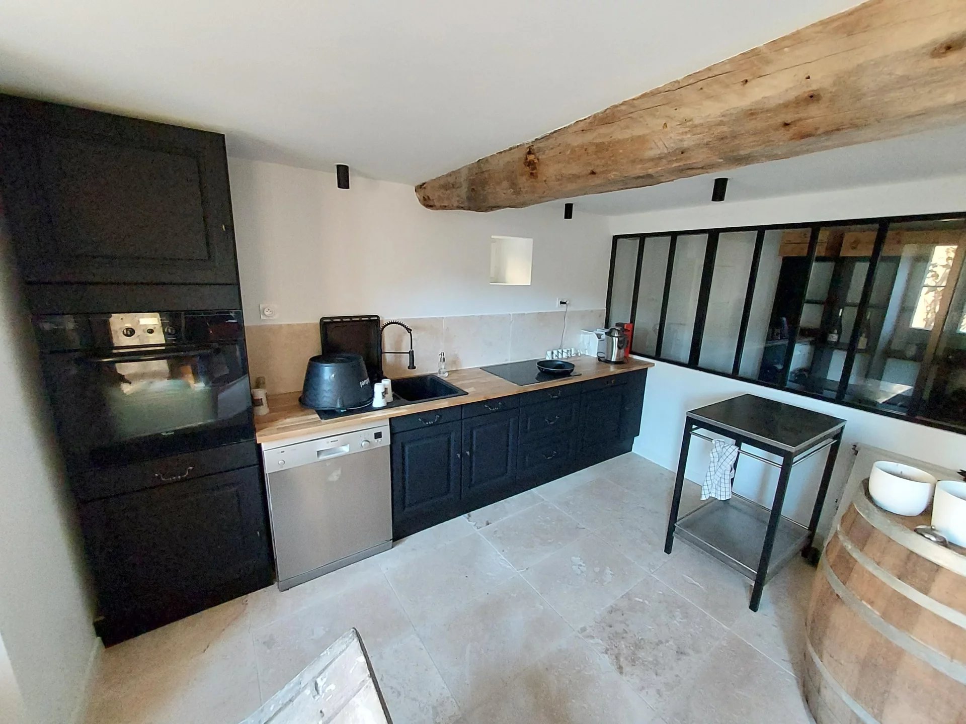 Cuisine d'été avec cave ouvrant sur le jardin arboré et sa piscine. Abri voiture