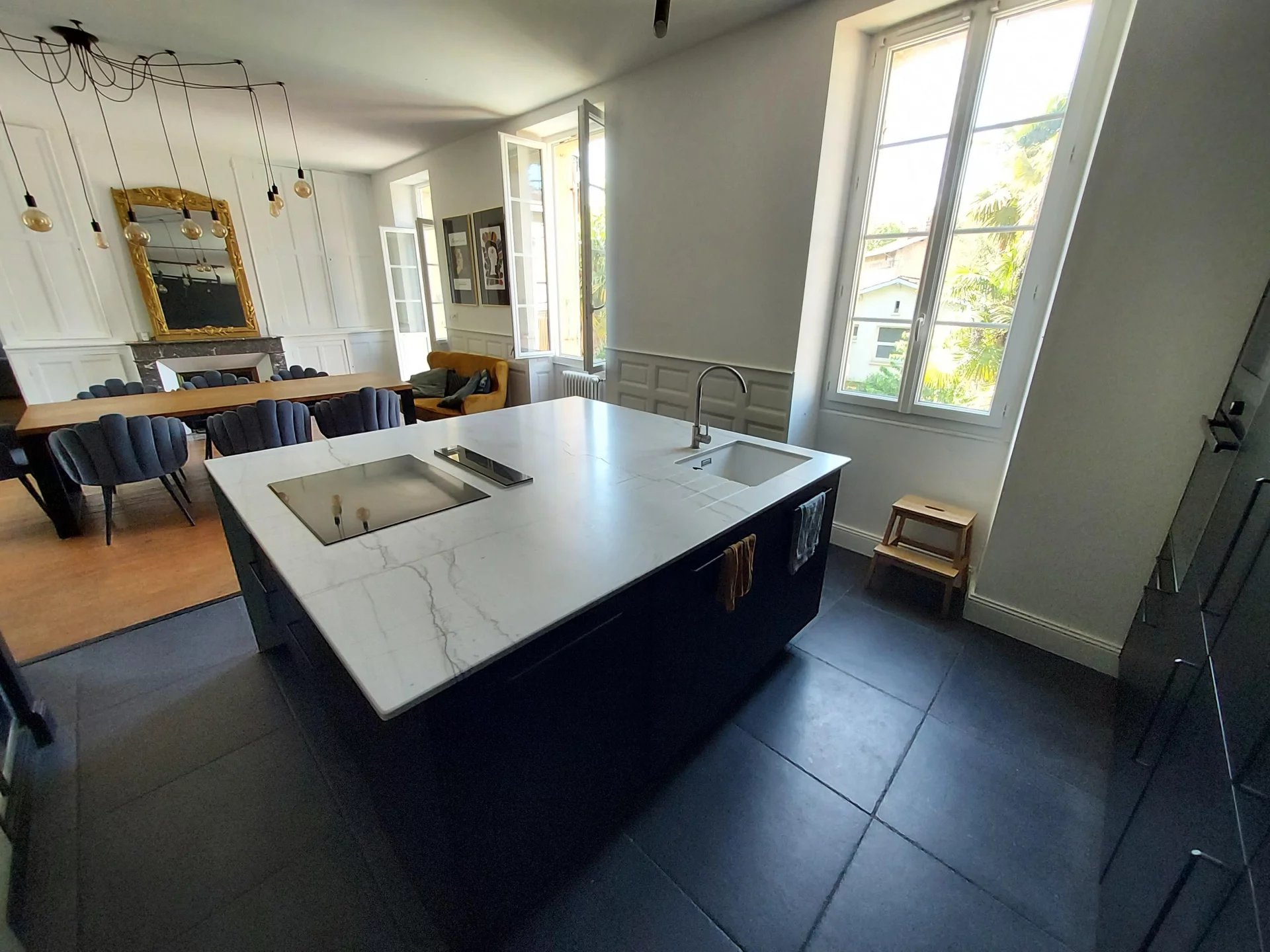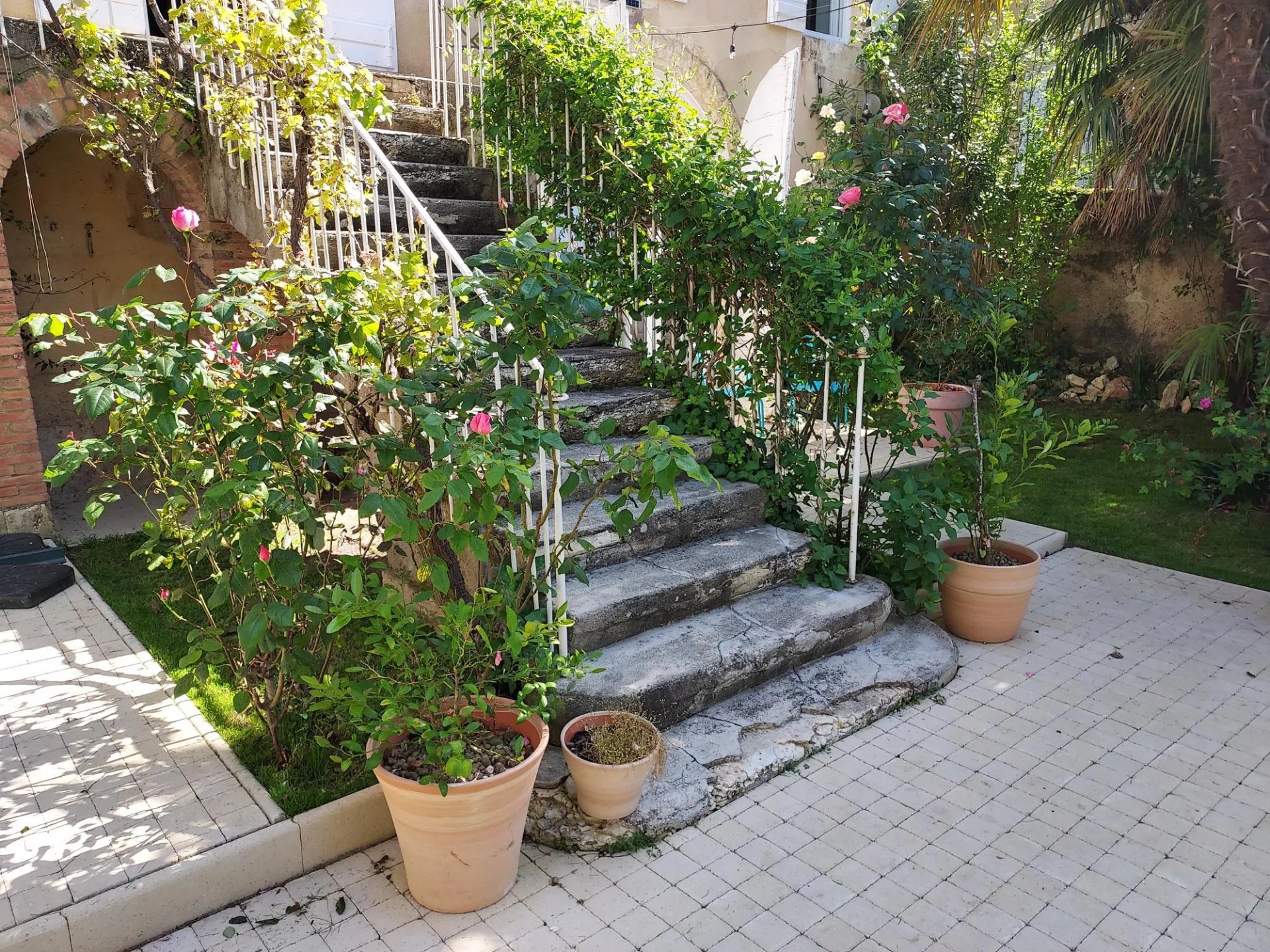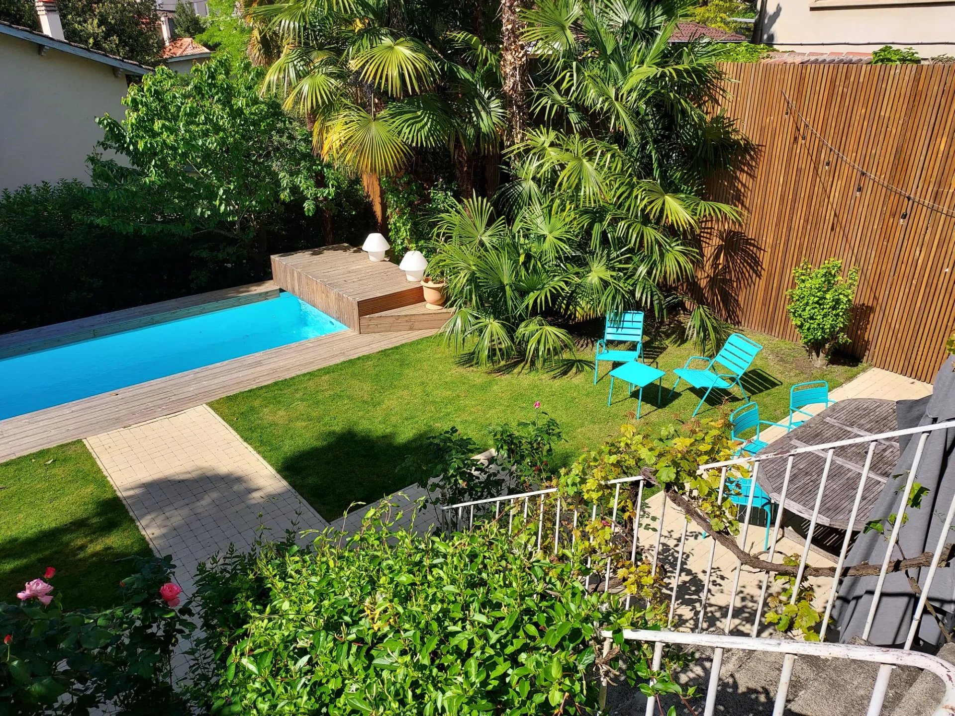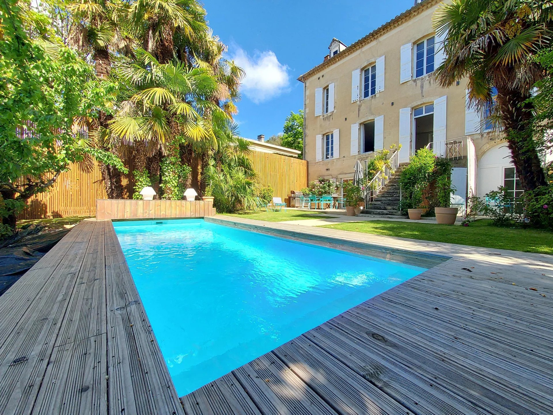 Cuisine d'été avec cave ouvrant sur le jardin arboré et sa piscine. Abri voiture