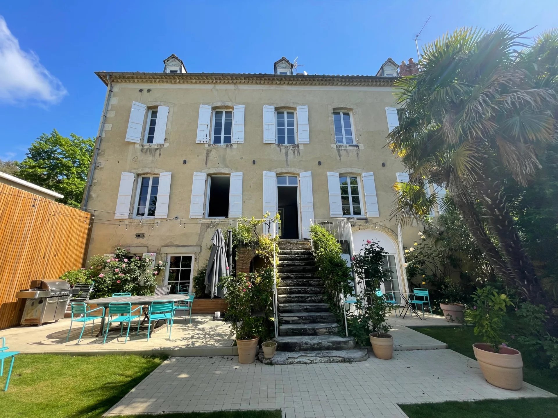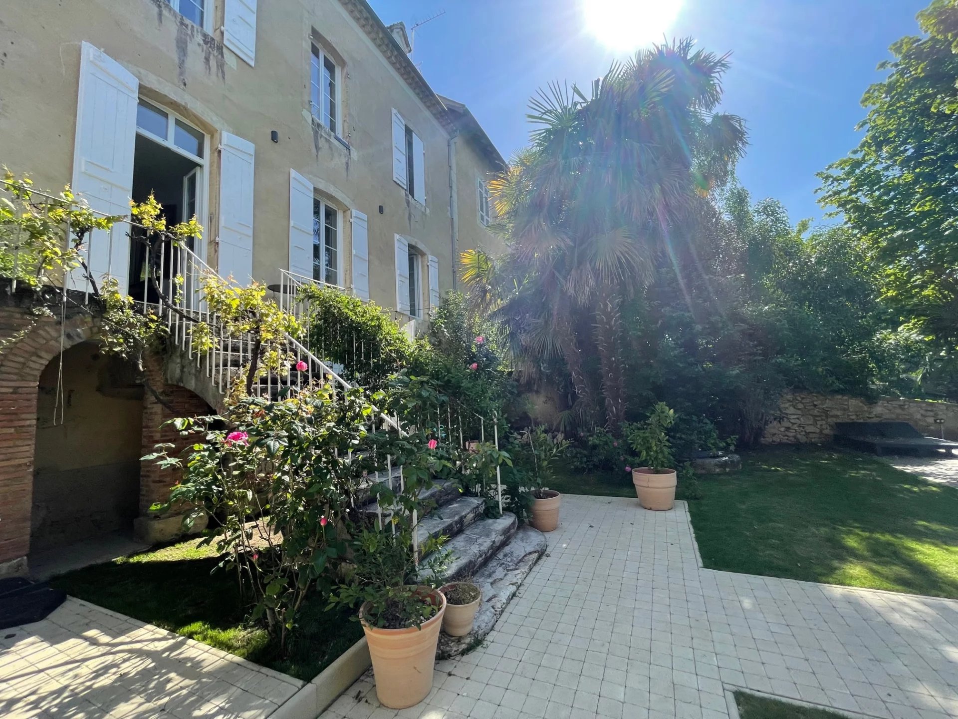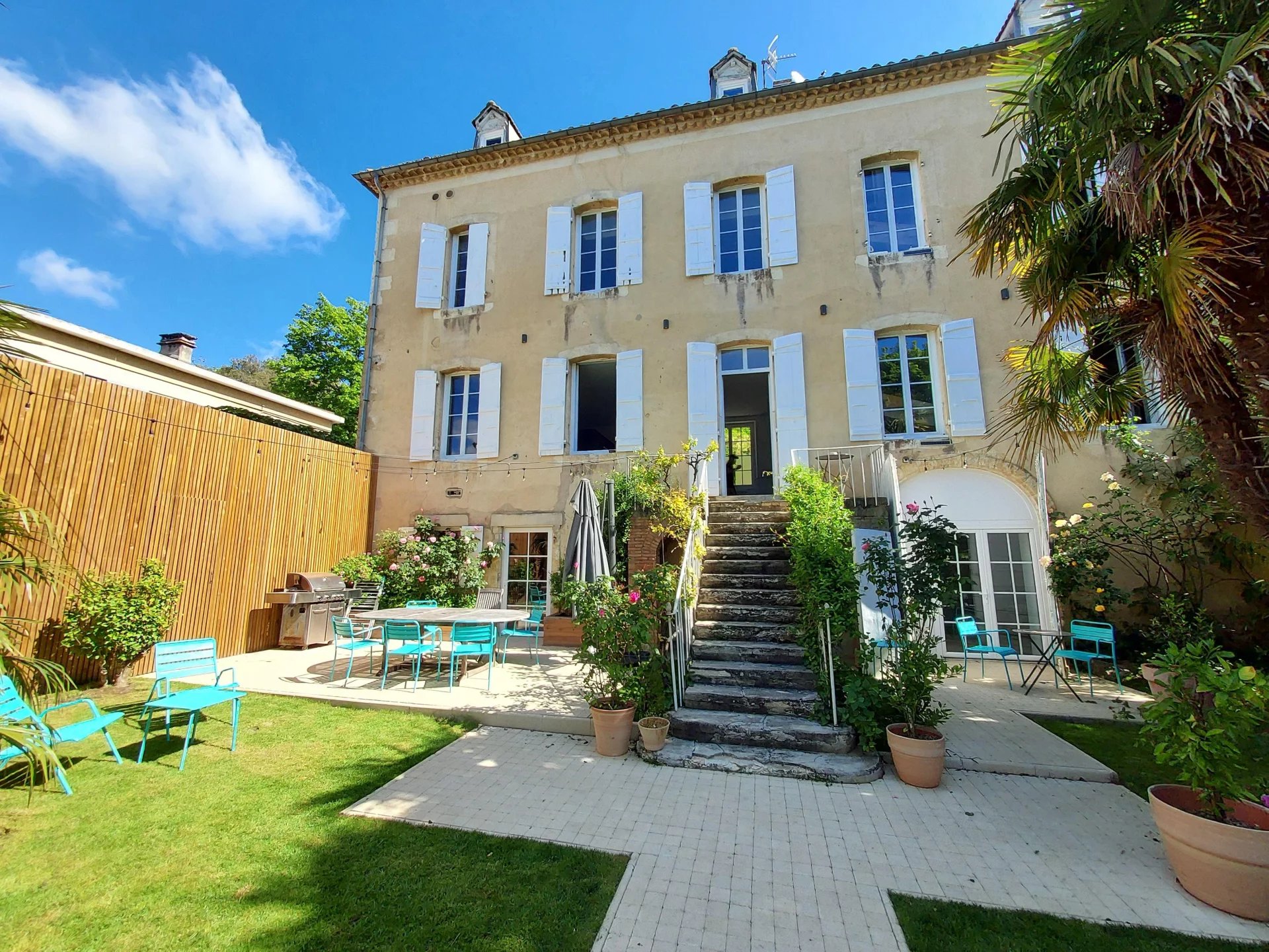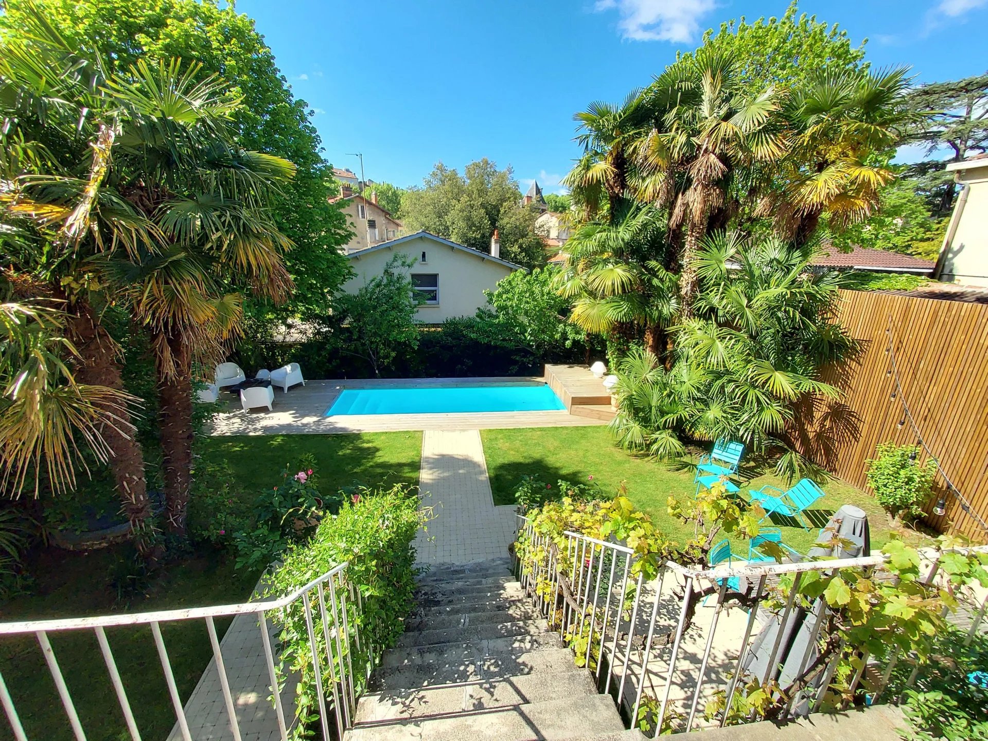 Cuisine d'été avec cave ouvrant sur le jardin arboré et sa piscine. Abri voiture
