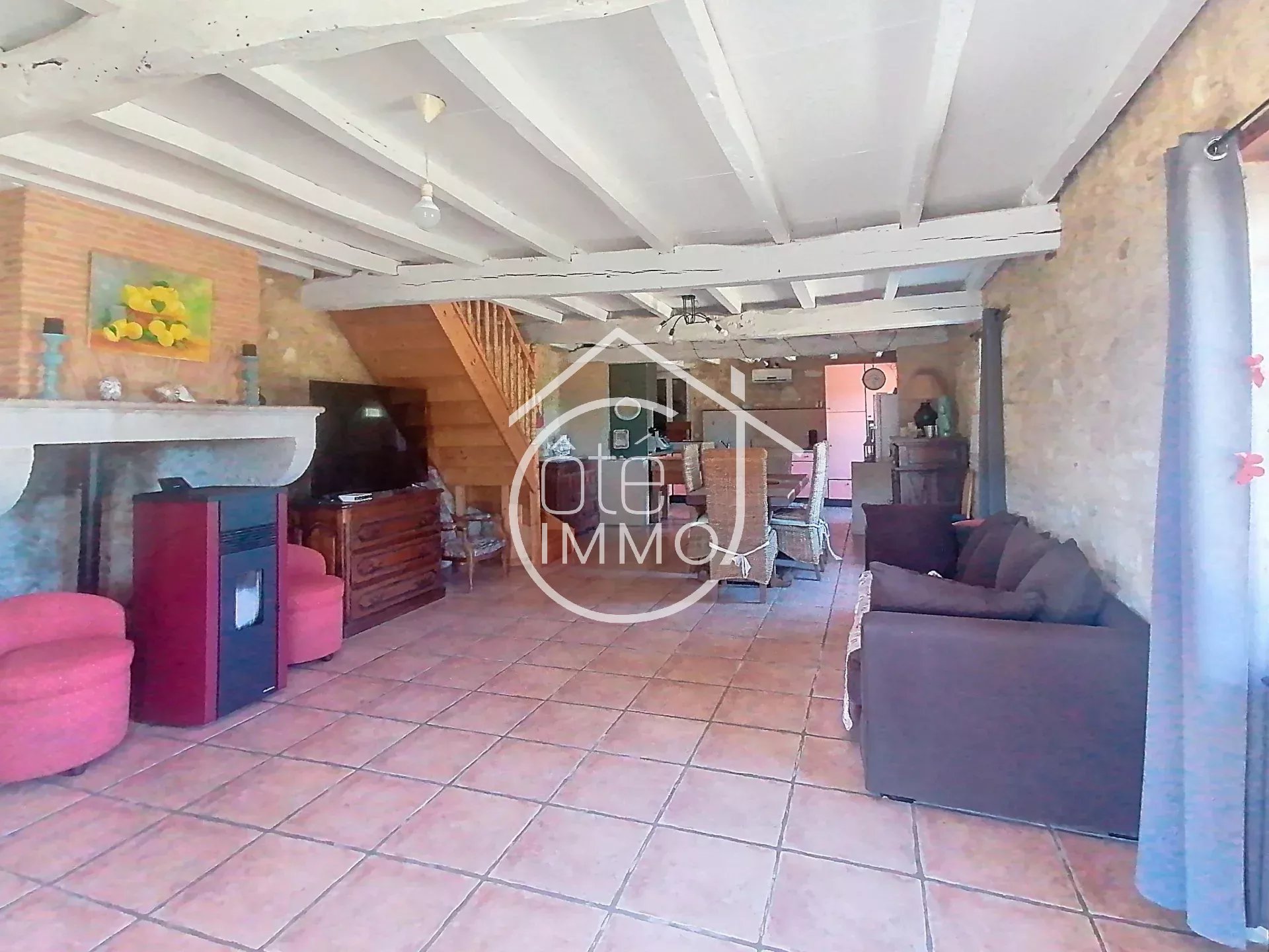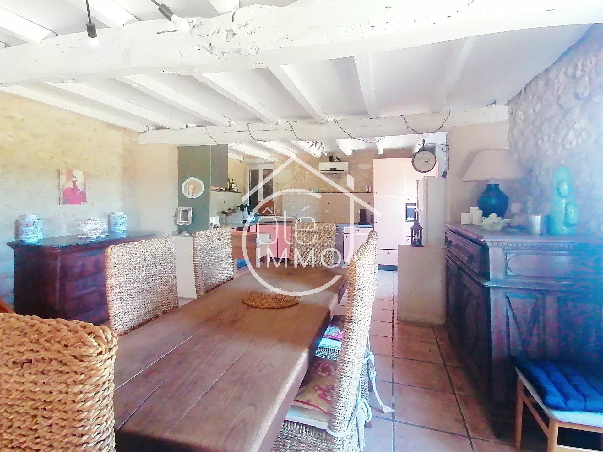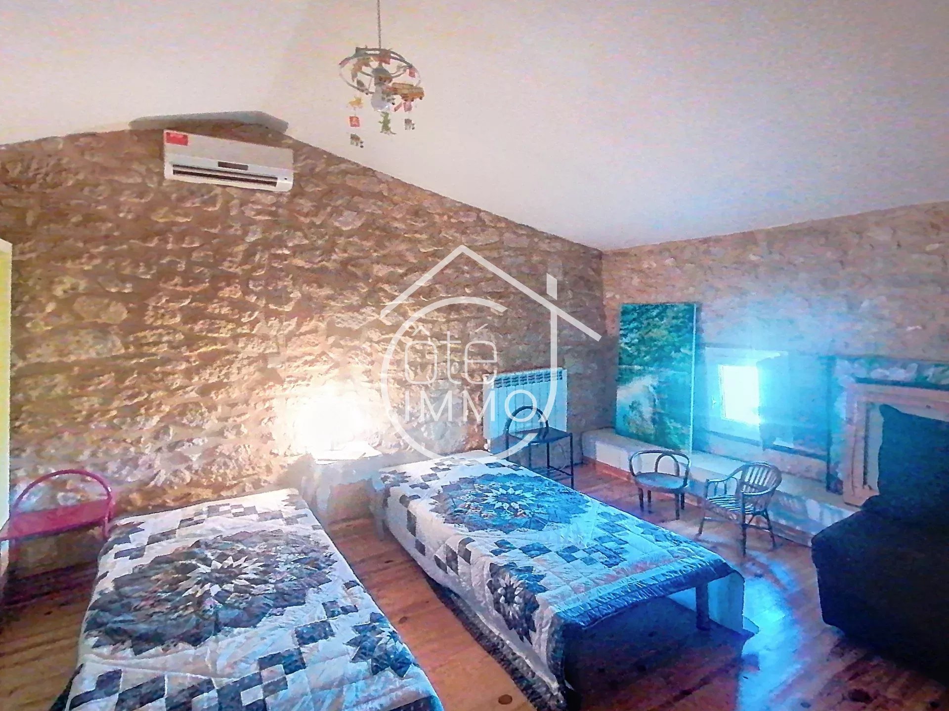 Elle propose une vaste pièce de vie avec cuisine ouverte équipée, 59 m² environ, agrémentée d'un poêle à granulés et d'une clim réversible selon les saisons concernées.