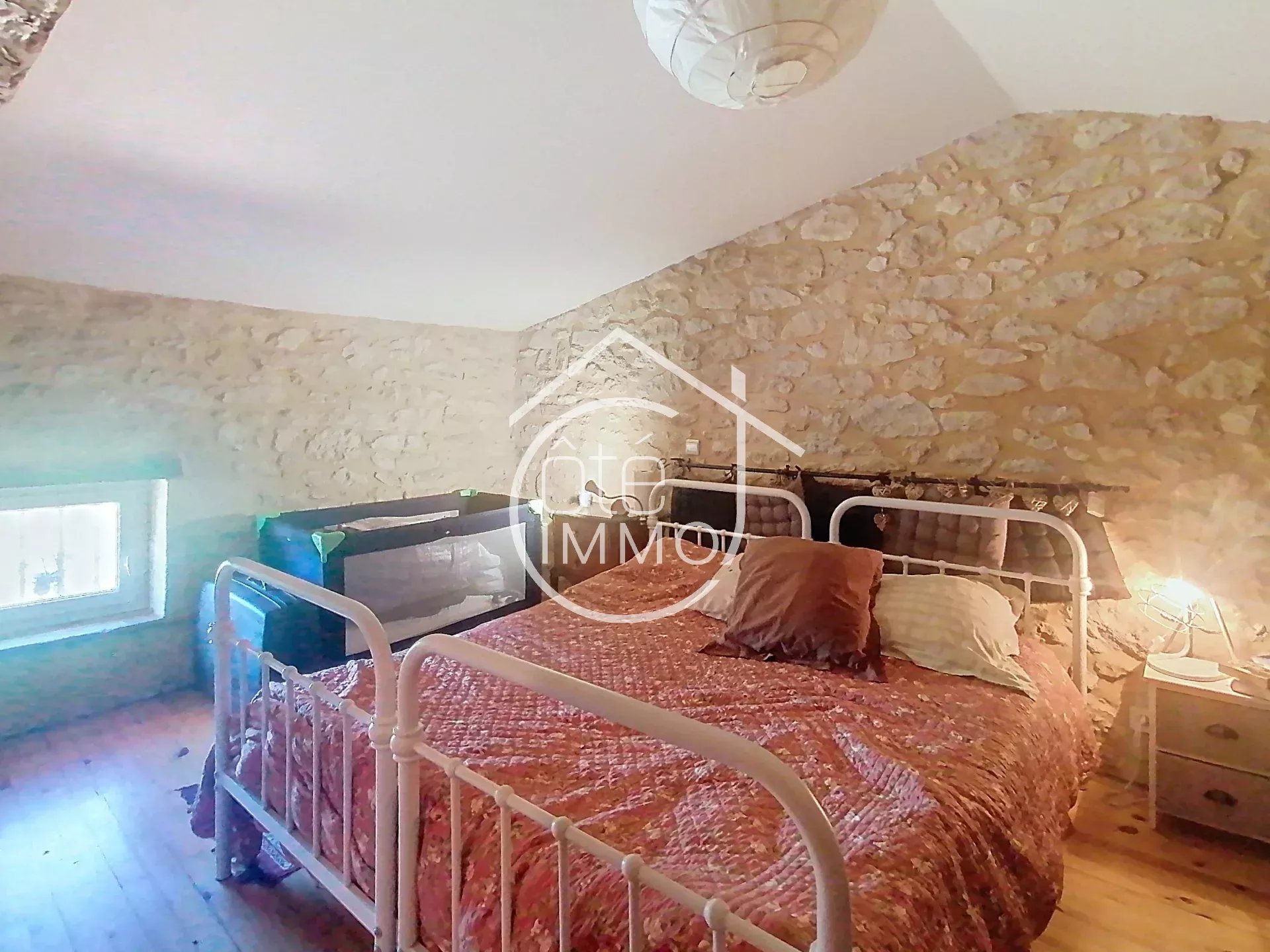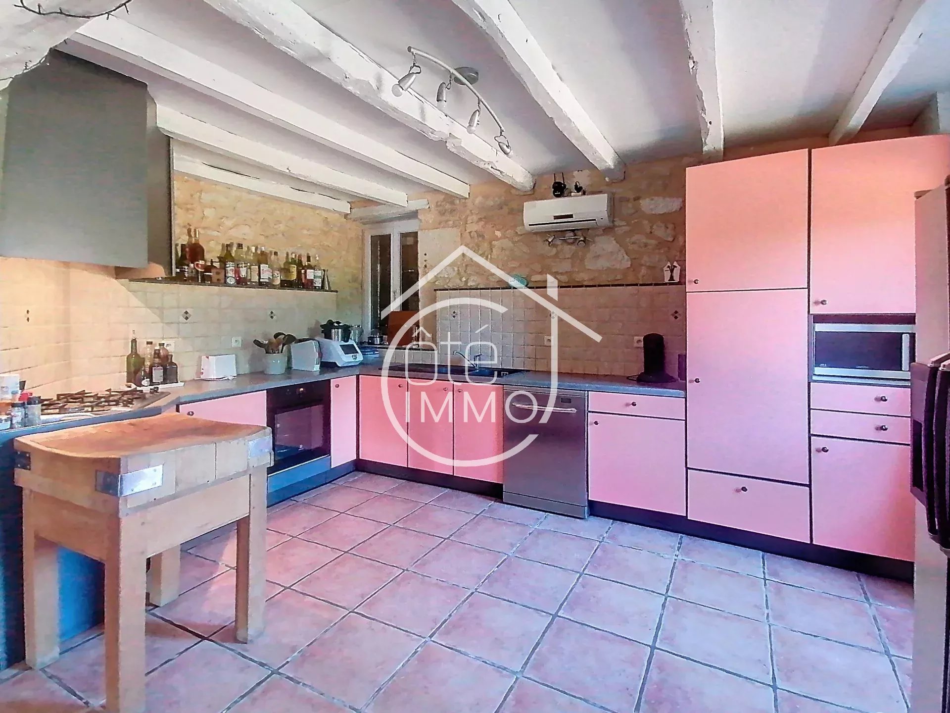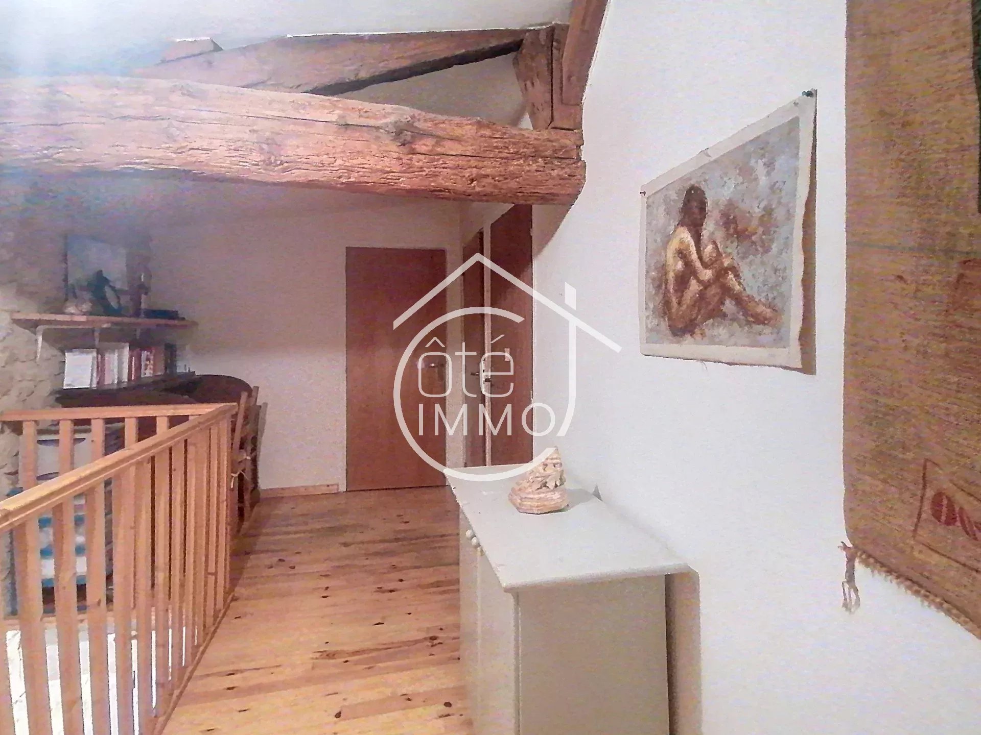 Elle propose une vaste pièce de vie avec cuisine ouverte équipée, 59 m² environ, agrémentée d'un poêle à granulés et d'une clim réversible selon les saisons concernées.