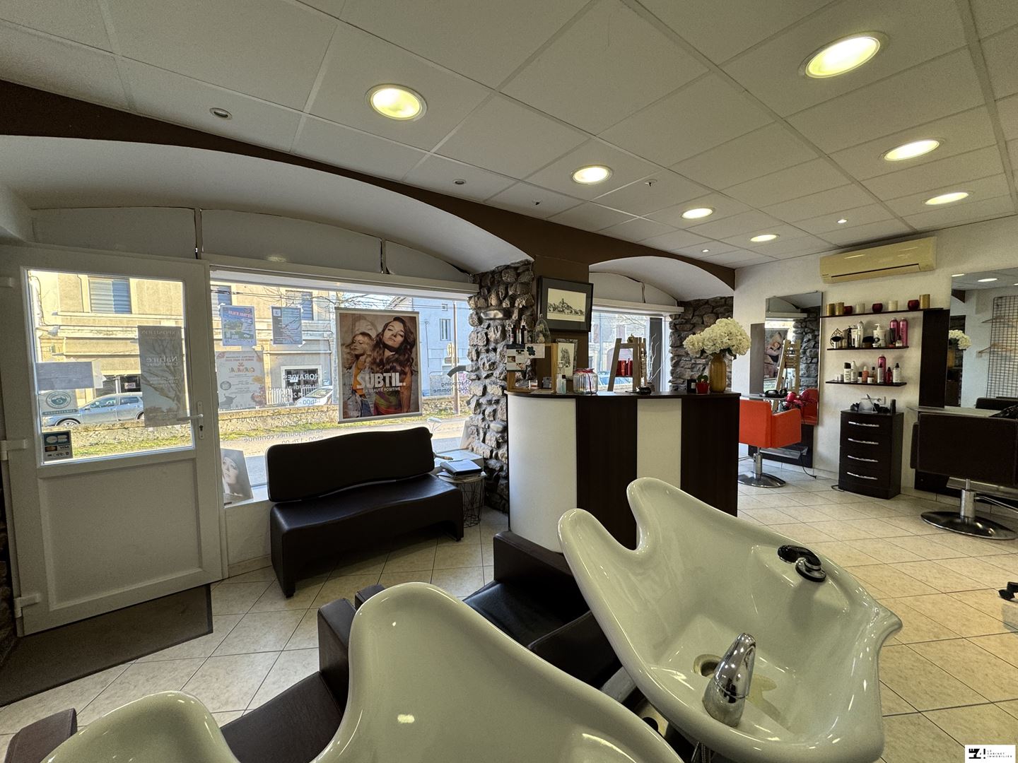 Dune surface optimisée et fonctionnelle, le salon est composé dune belle pièce principale accueillante, comprenant un espace daccueil, deux bacs à shampoing et deux postes de coupe.