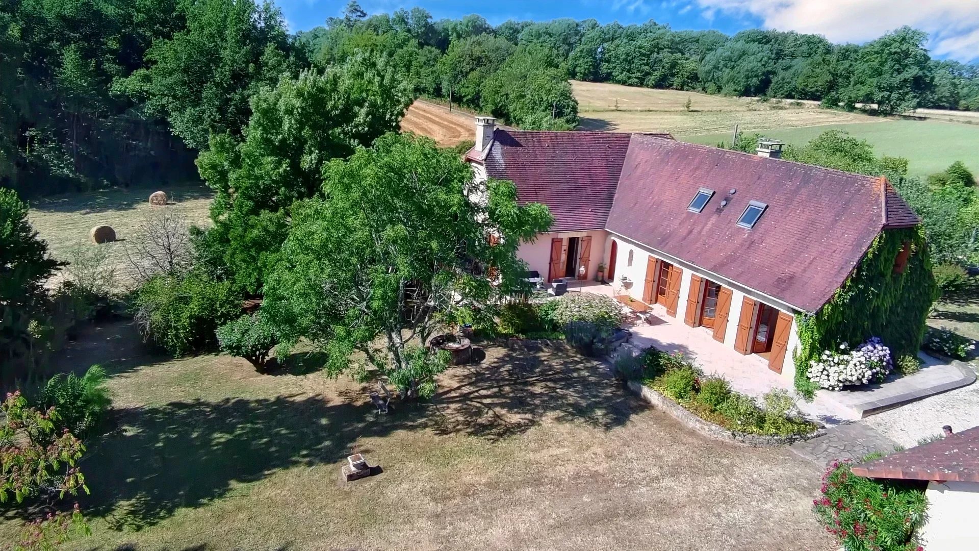 Superbe emplacement au sommet d'une colline avec vue panoramique ! Accès par un chemin privé, cette propriété en pierre de haute qualité datant de 2007 offre un hébergement modulable sur trois niveaux. Entourée de saules pleureurs, d'albizias, de pommiers et de noyers, cette oasis ombragée respire la tranquillité, à seulement 4 km du célèbre bourg d'Excideuil. Le sous-sol de 94m2 comprend une grande cave, une deuxième cuisine, buanderie, plusieurs pièces de rangement et un garage intégré. Le niveau principal est entouré sur trois côtés par une terrasse à balustrades avec accès par plusieurs portes-fenêtres à l'intérieur : idéal pour recevoir ! L'entrée principale mène à un grand salon en mezzanine, une cuisine équipée et un cellier. Un couloir dessert trois chambres et deux salles de bains au rez-de-chaussée. À l'étage, un spacieux palier surplombe le salon et deux autres chambres qui partagent une salle de bains commune. À l'extérieur, vous trouverez un puits, un garage à deux niveaux et une piscine couverte. Jardins matures offrant ombre toute l'année et intimité absolue. Emplacement très recherché ! Prix honoraires inclus : 381 600 € Prix honoraires exclus : 360 000 € Honoraires de 6% TTC à charge acquéreur