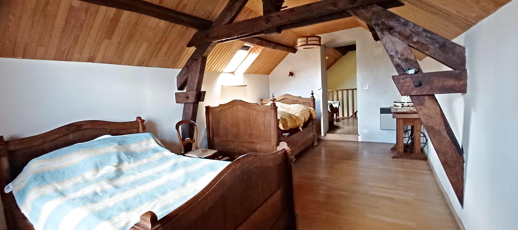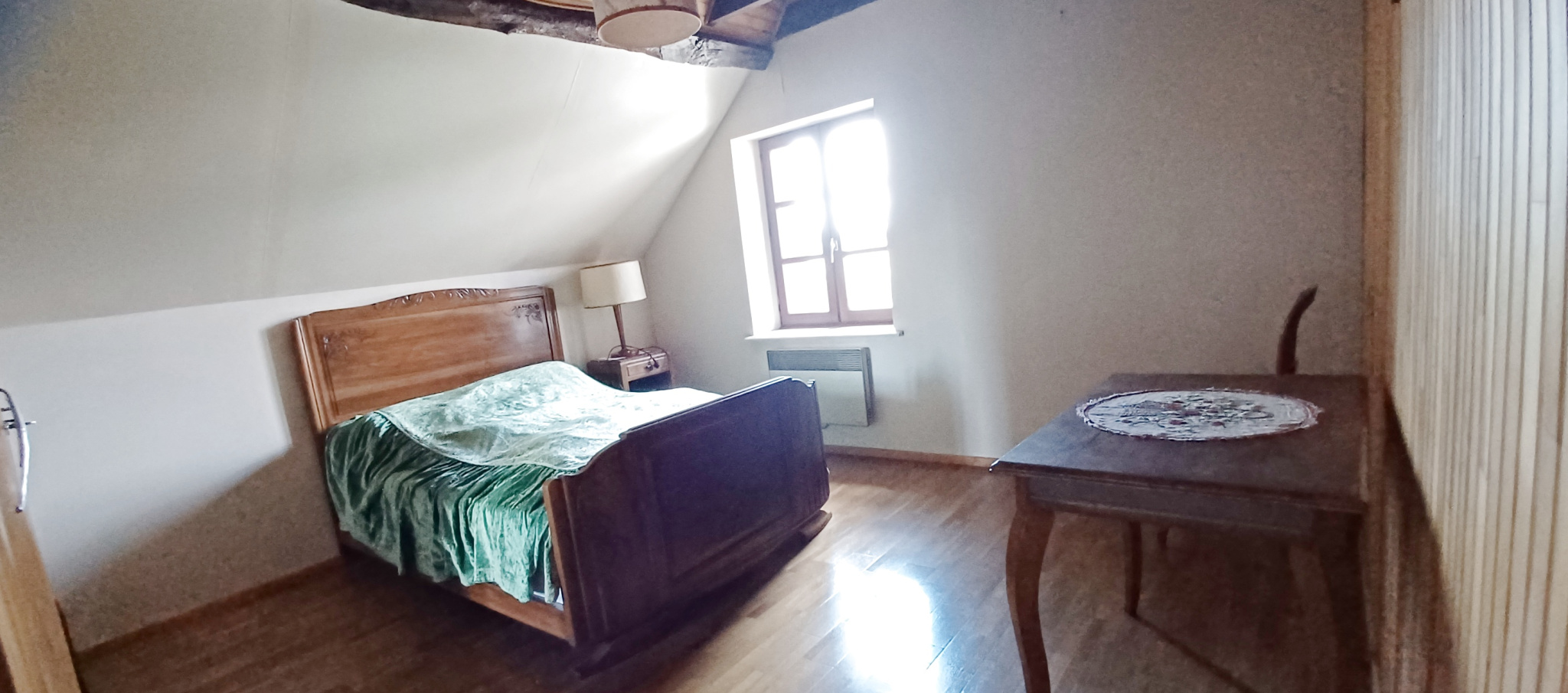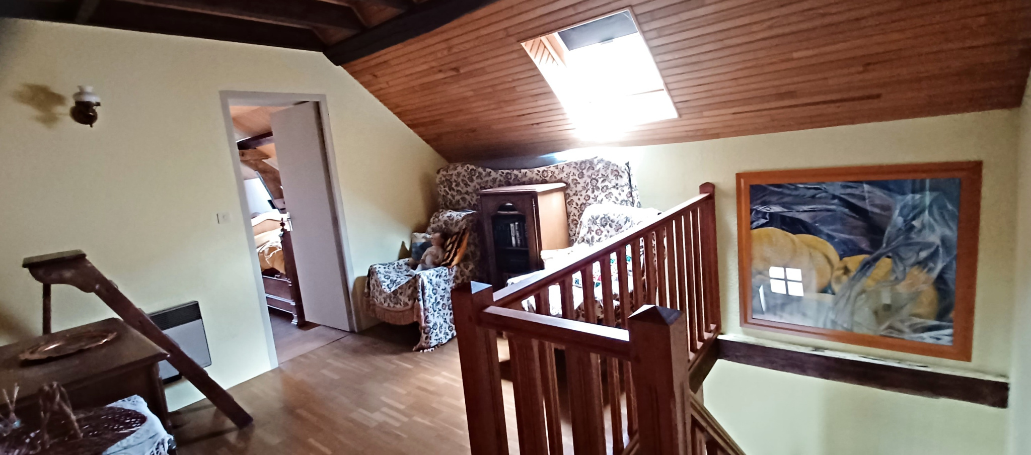 A l'étage palier-bureau desservant 2 grandes chambres sur parquet de chêne. Grenier.Caves