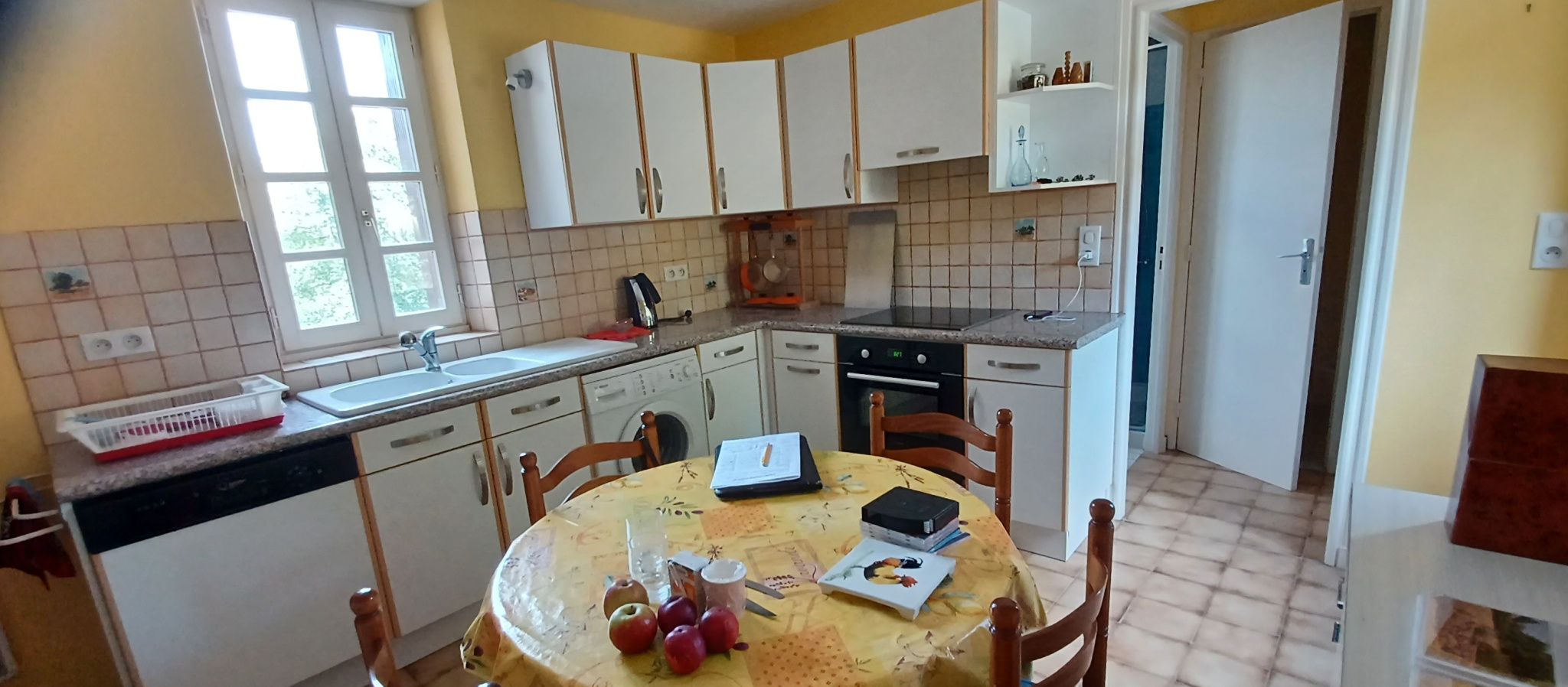 Cuisine aménagée-équipée ouvrant sur terrasse, dégagement, salle d'eau et wc. Salon traversant avec poêle à bois et montée d'escalier.