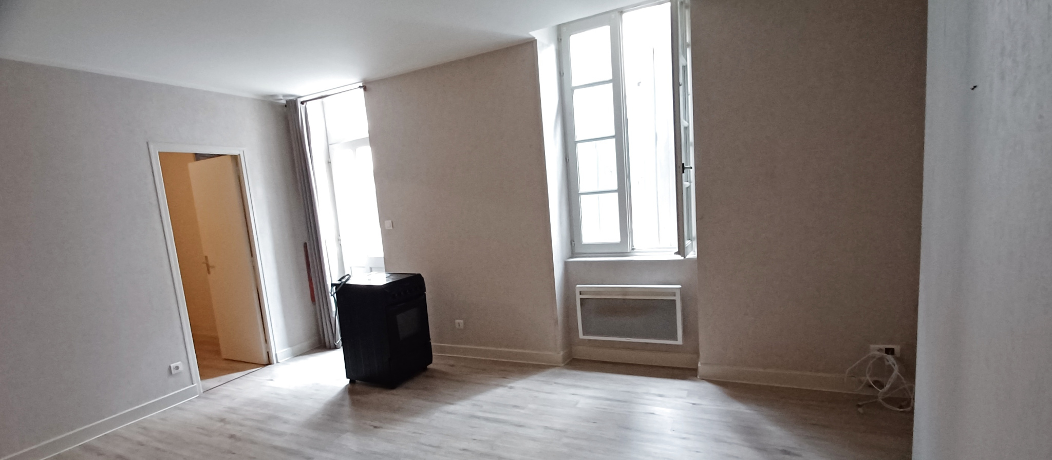 En rez de rue : Appartement (45 m2) à rafraîchir Type F2 avec séjour sur parquet flottant, cuisine simple, chambre et salle d'eau, wc.