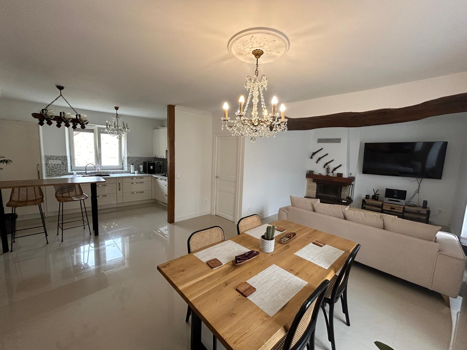 cheminée insert, une cuisine équipée ouverte, deux grandes chambres et une salle de bains avec wc. Un colimacon vous emportera aux combles composées d'une