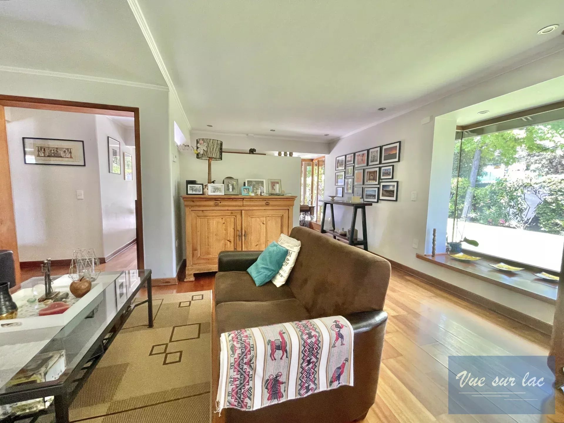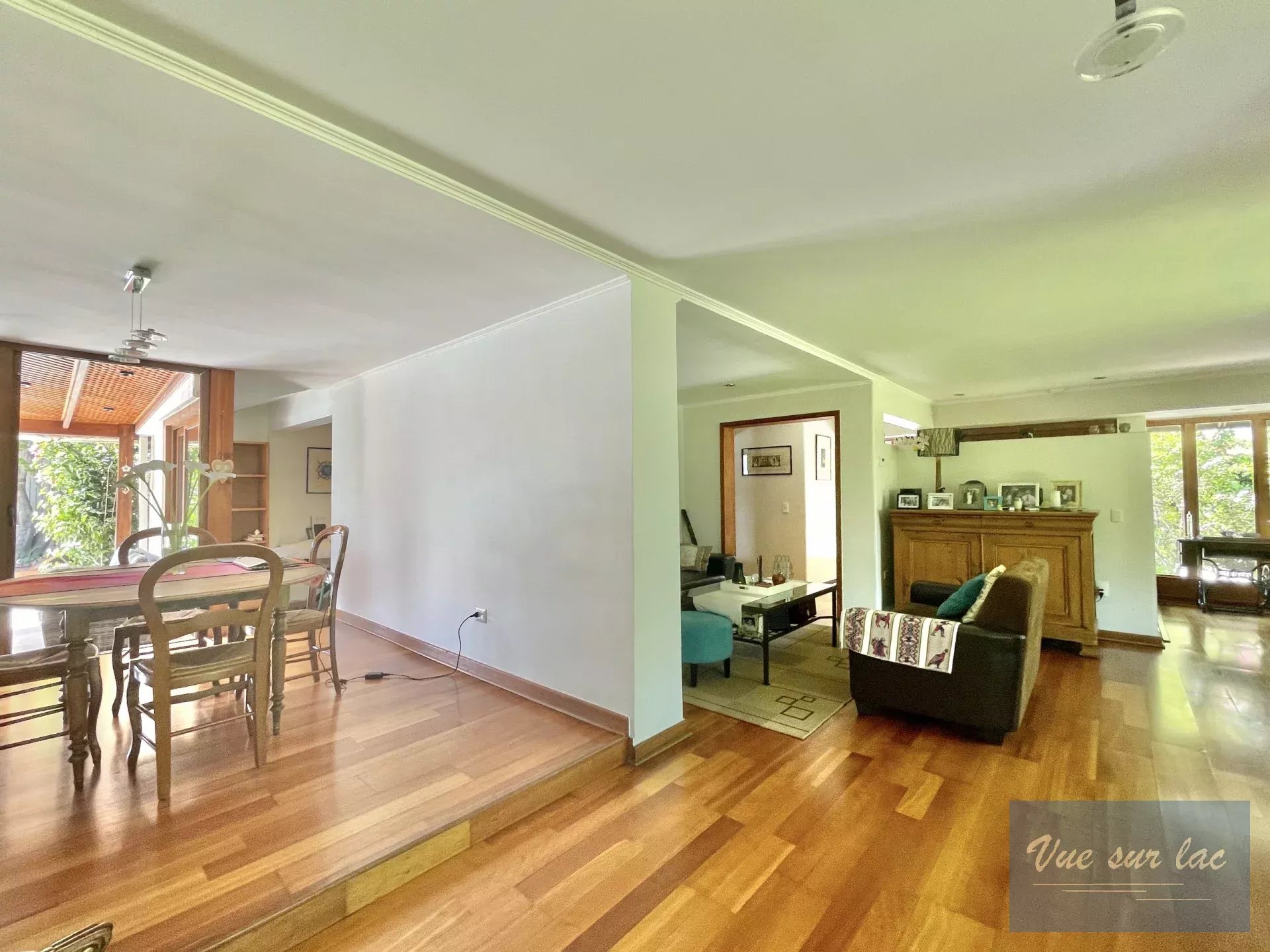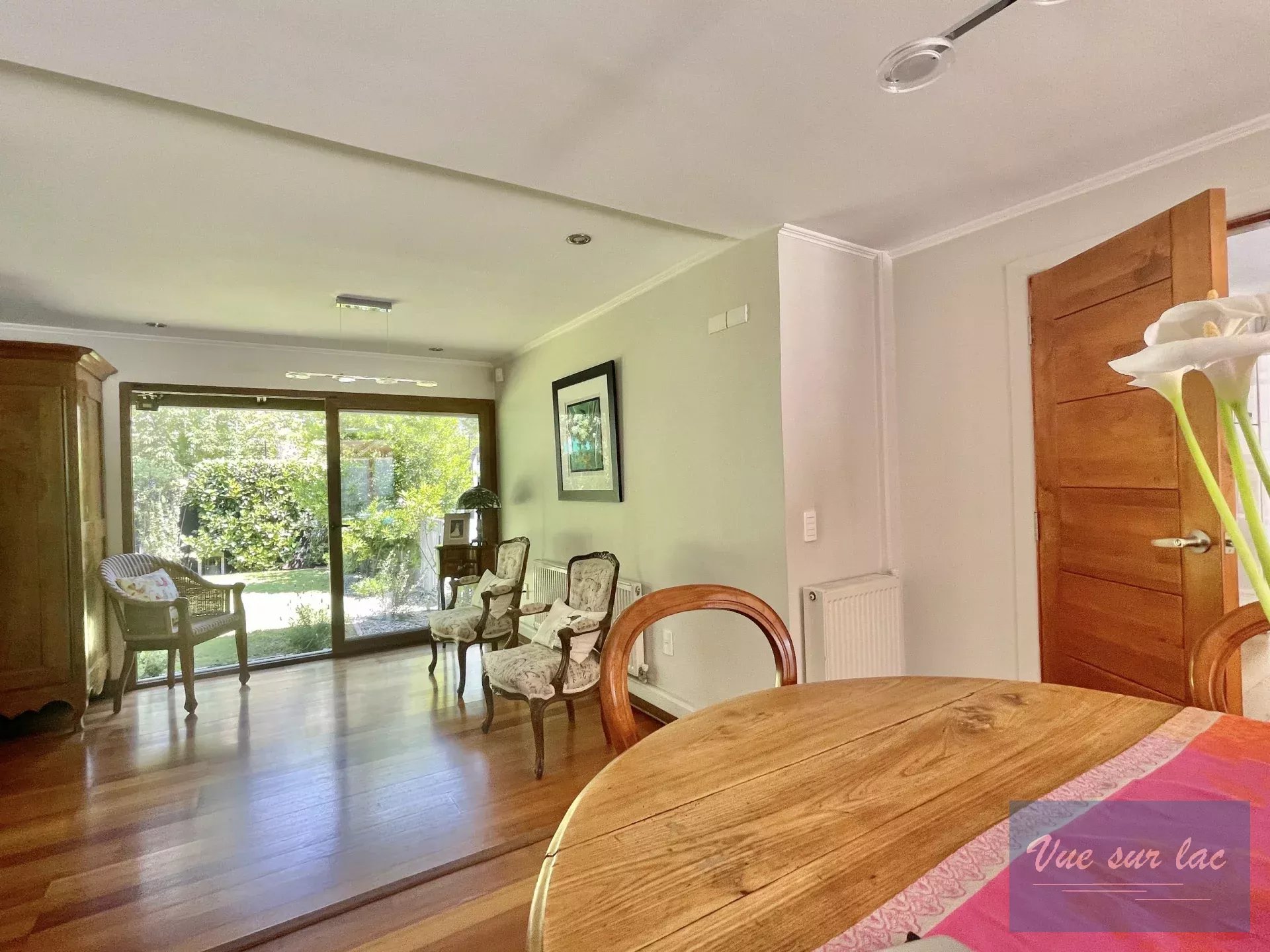 Grand salon avec portes fenêtres donnant sur un beau jardin magnifiquement arboré