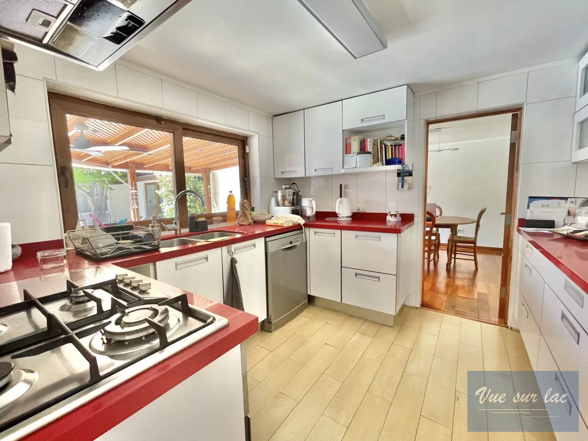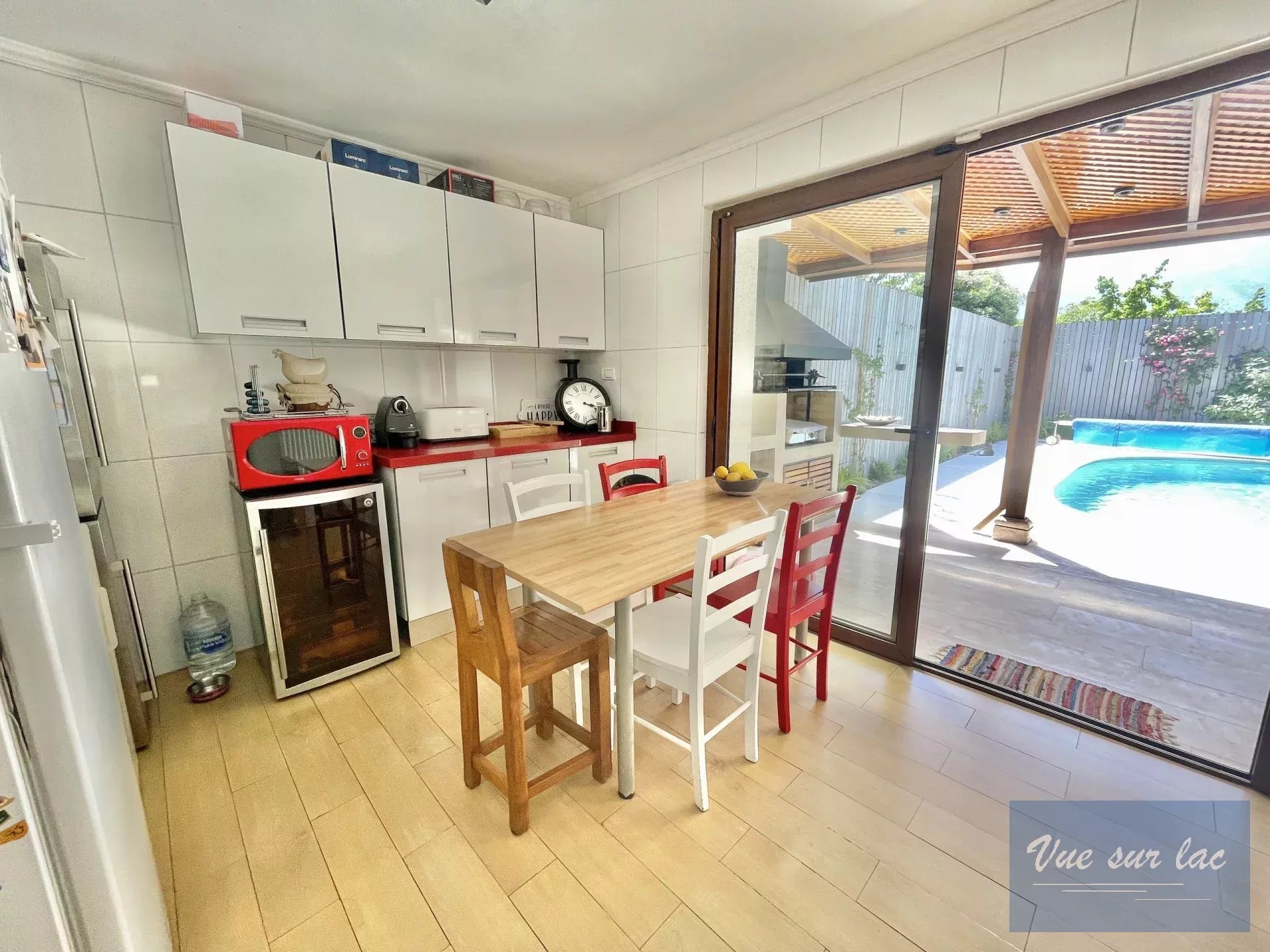 Cuisine fermée et totalement équipée avec une vue et accès à la terrasse de la piscine