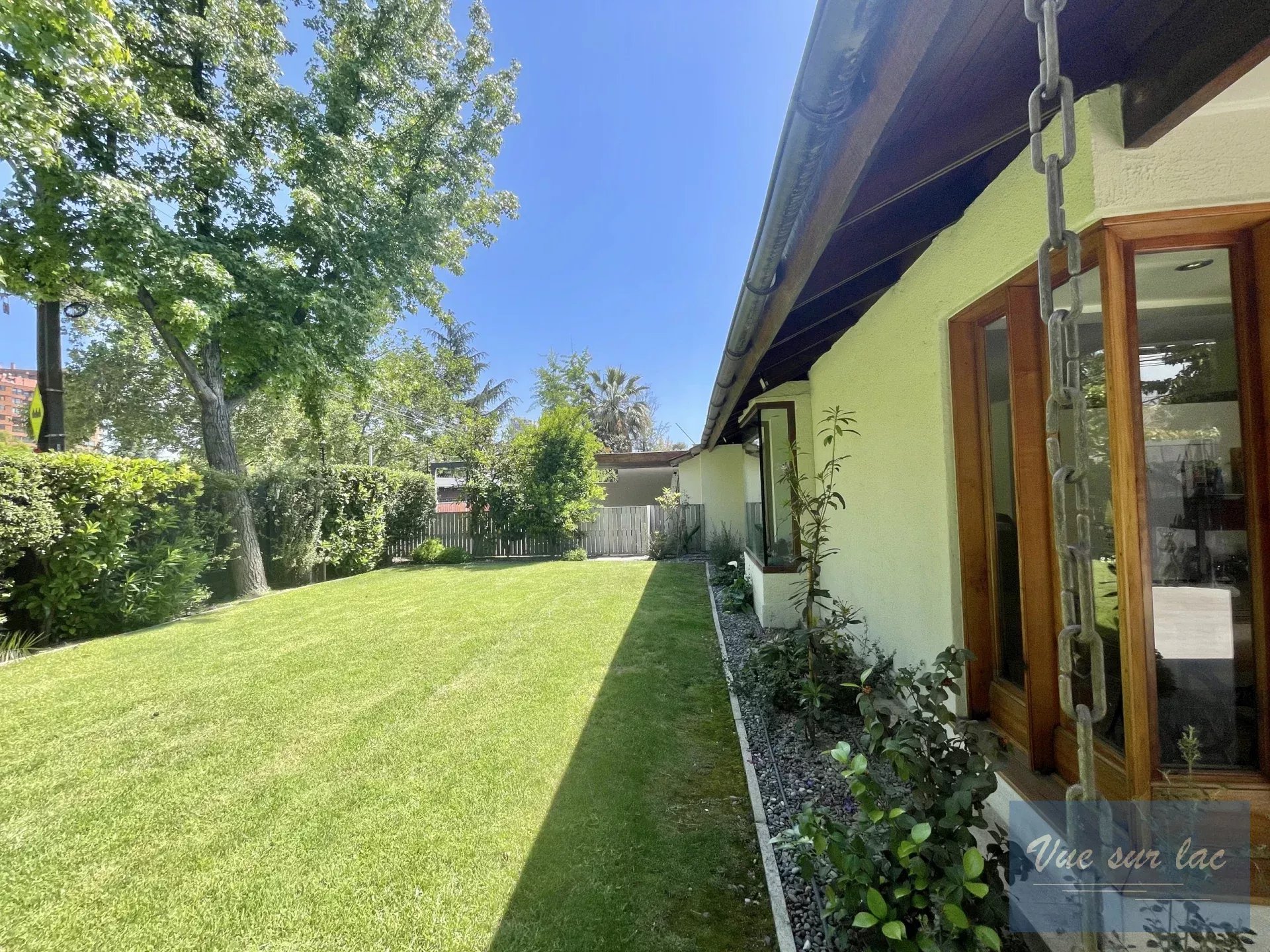 Magnifique jardin longeant le salon, superbement entretenu avec un gazon impeccable et de beaux grands arbres, beaucoup de fleurs