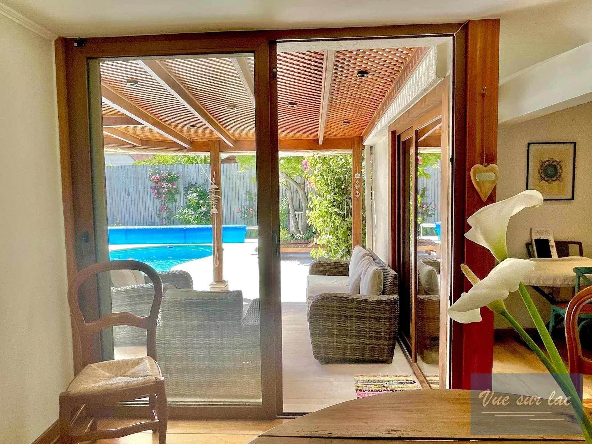 Salle à manger ouverte sur le salon donnant également sur la terrasse côté piscine
