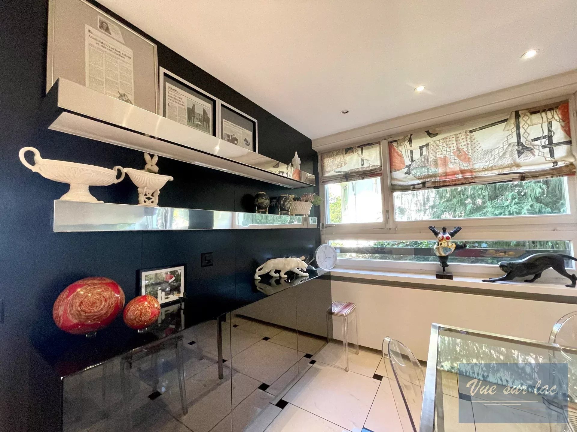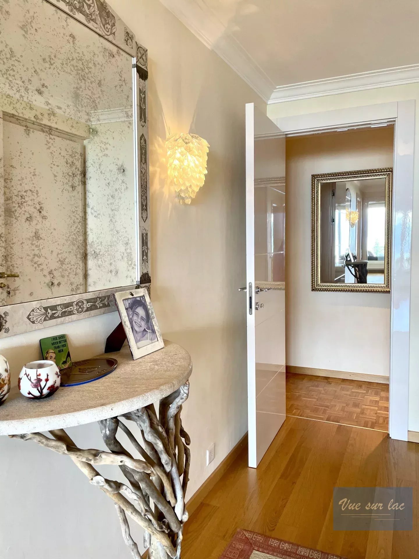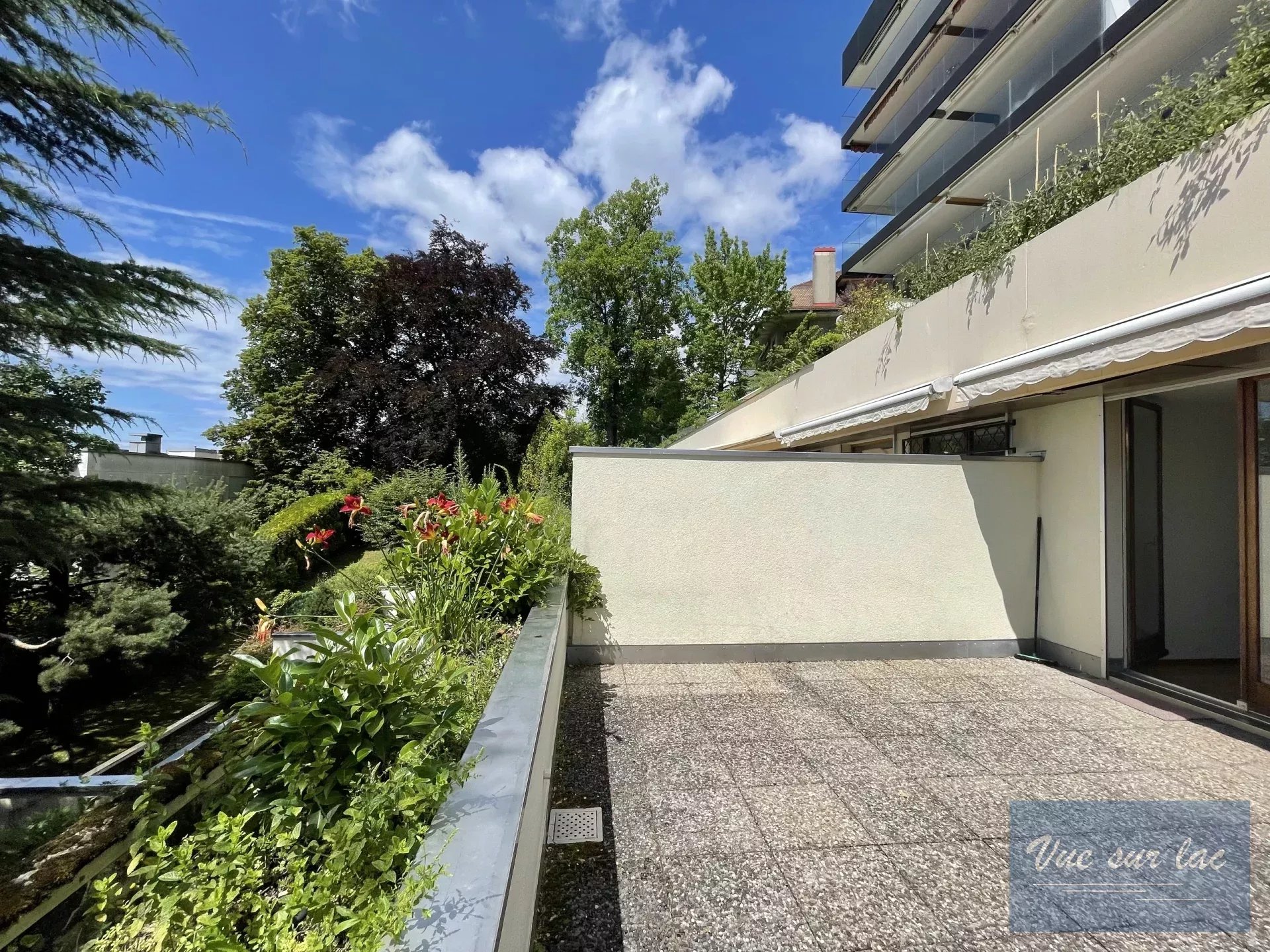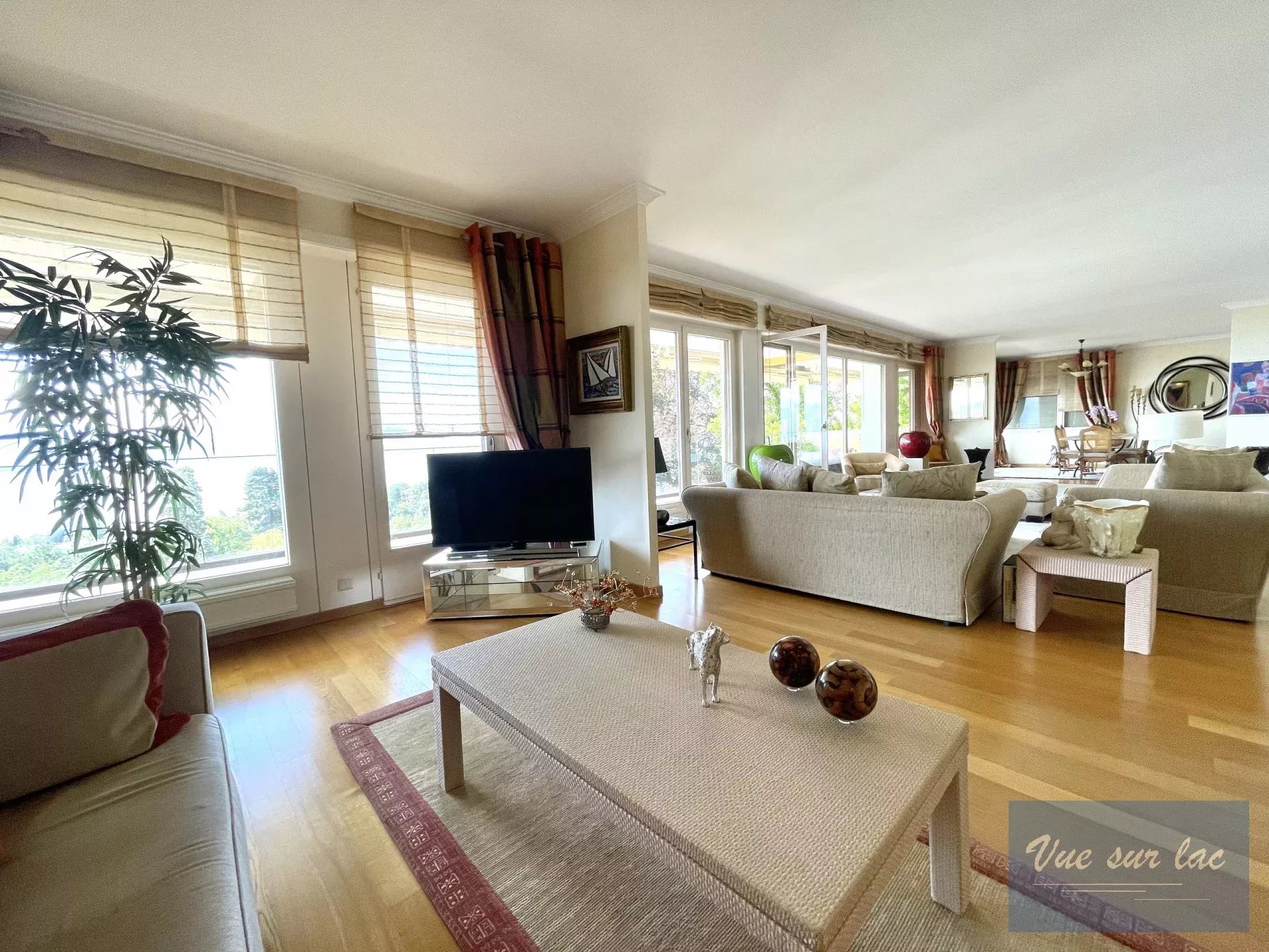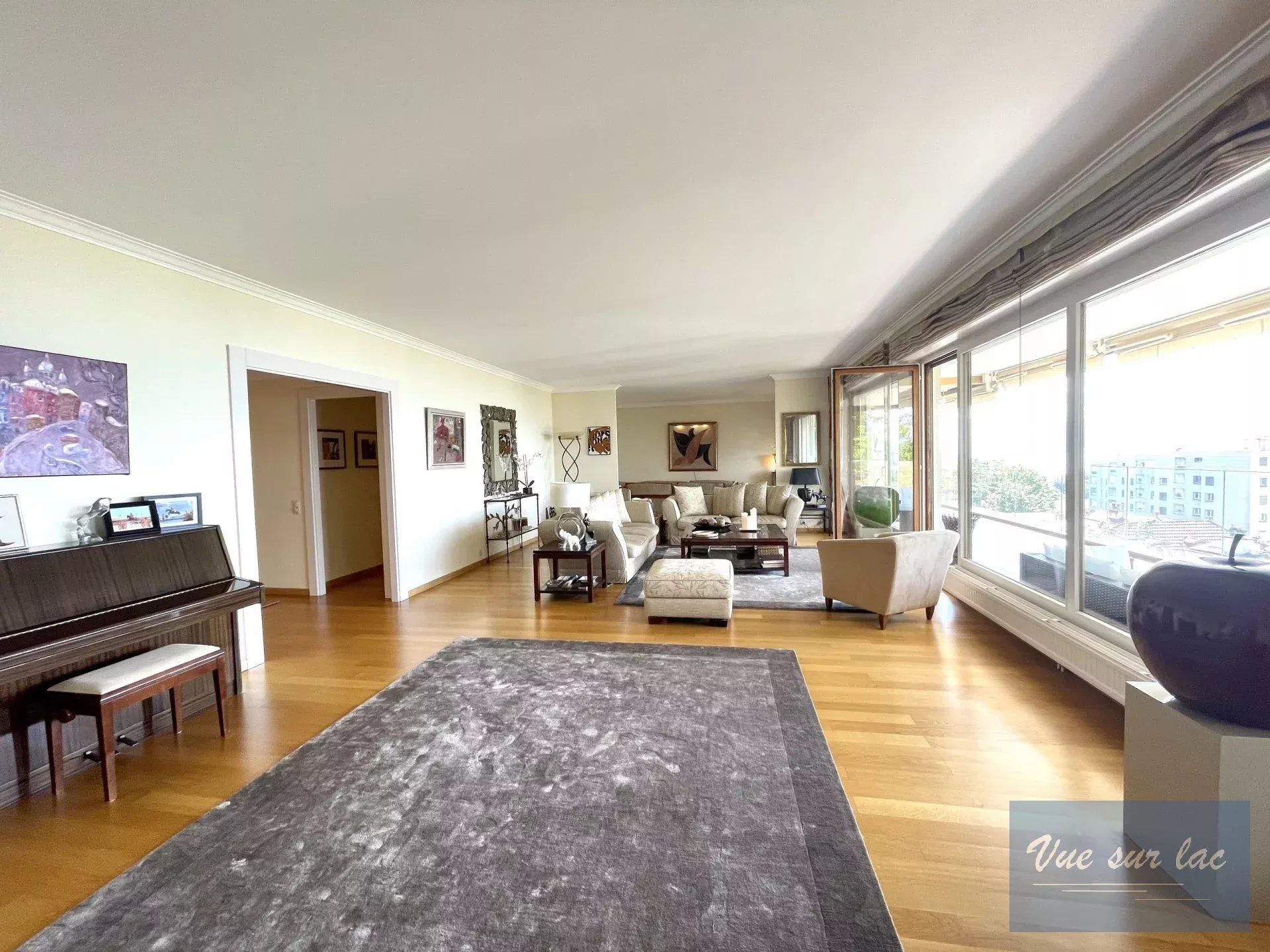 Toutes les pièces de réception s’ouvrent sur une magnifique et profonde terrasse faisant toute la longueur de l’appartement. La vue est totale sur le lac et les montagnes et au premier plan de grands espaces verts nous font oublier que nous sommes en plein coeur de la ville.