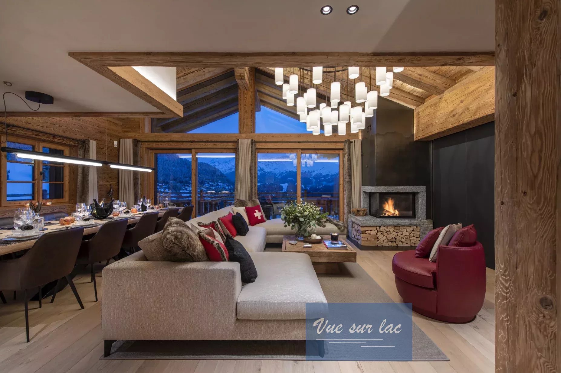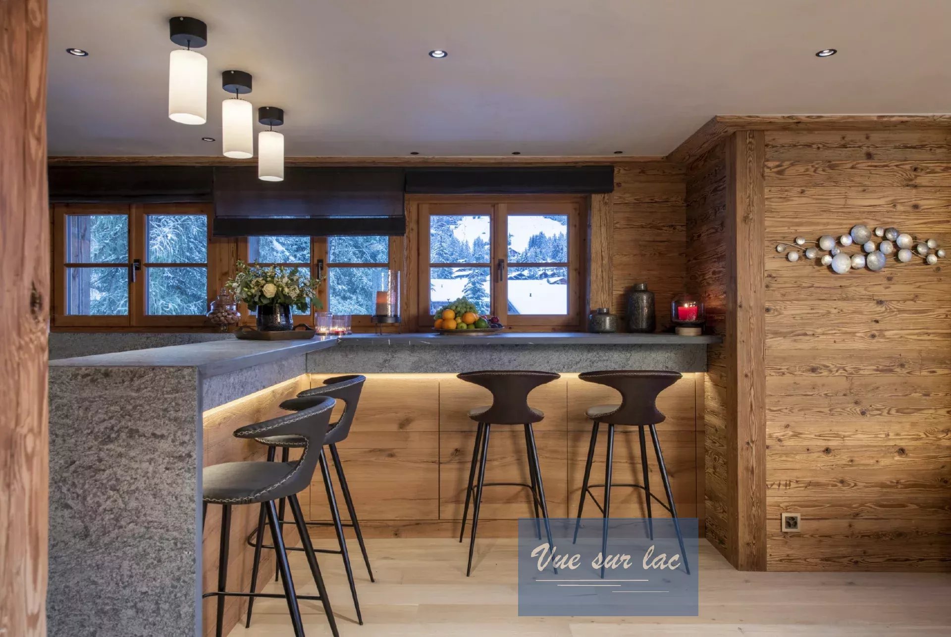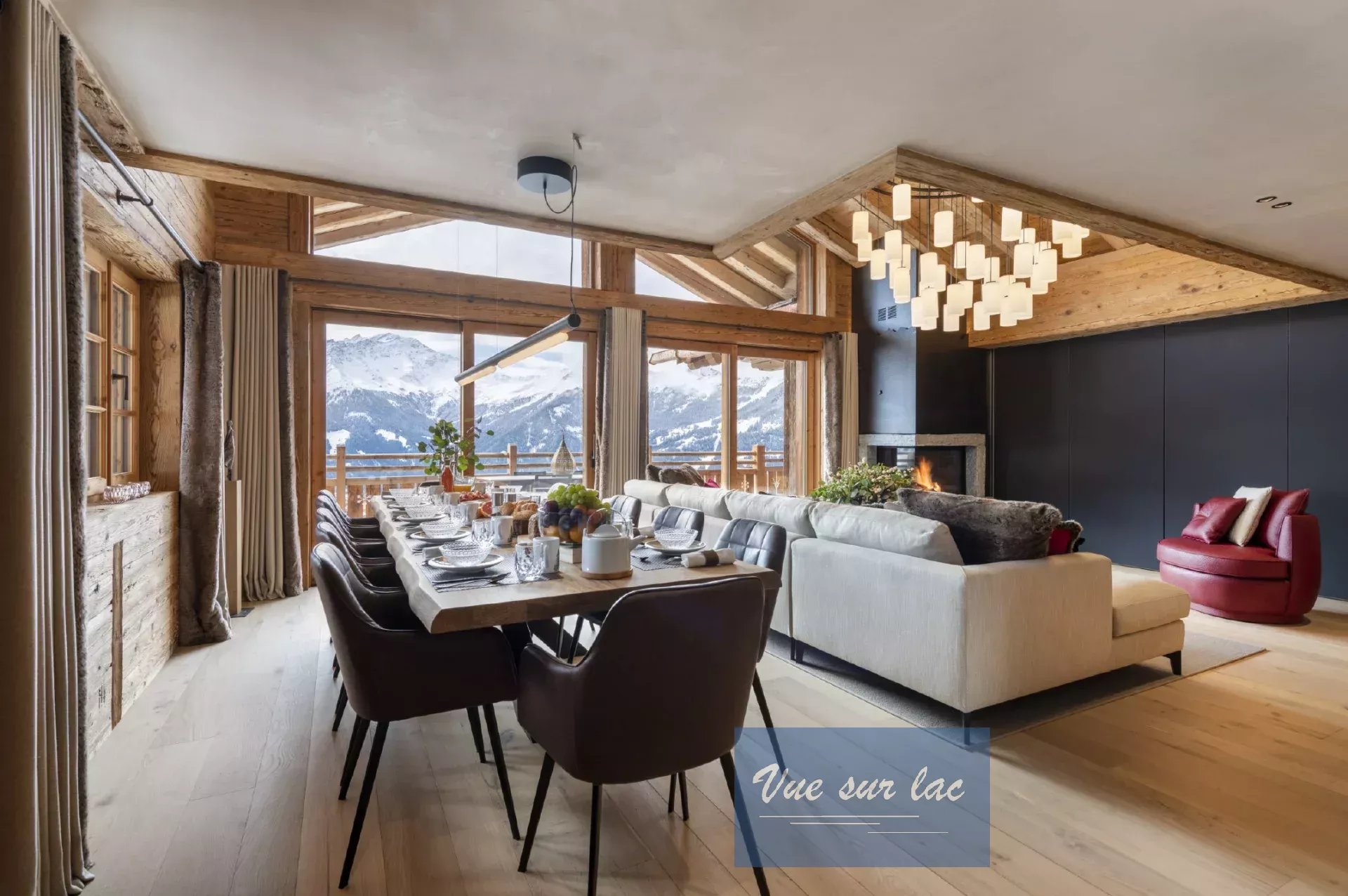 Le salon principal, doté d'une majestueuse cheminée en pierre, forme le cœur du chalet. Cet espace invite à la détente et à la convivialité, avec des baies vitrées qui inondent la pièce de lumière naturelle tout en offrant une vue imprenable sur les sommets enneigés environnants. La cuisine équipée, ouverte sur une vaste salle à manger, est un lieu privilégié pour les gourmets souhaitant vivre une expérience culinaire inégalée.