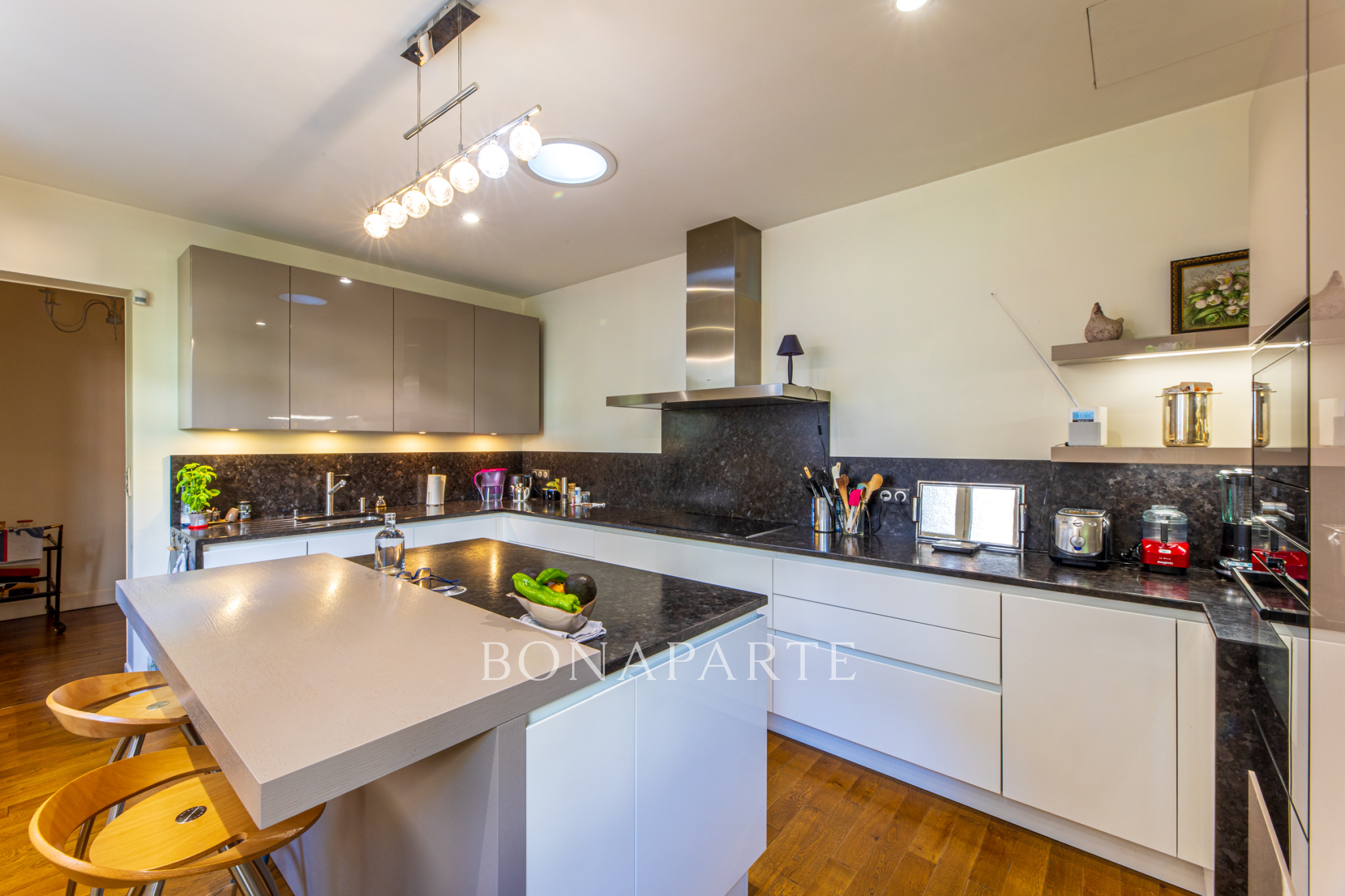 Édifiée sur trois niveaux, la maison s'ouvre au rez-de-jardin sur une majestueuse entrée qui mène, d'un côté, à un salon baigné de lumière donnant sur le jardin et une bibliothèque, et de l'autre, à une grande salle à manger ouverte sur l'extérieur, ainsi qu'à une cuisine design parfaitement équipée.