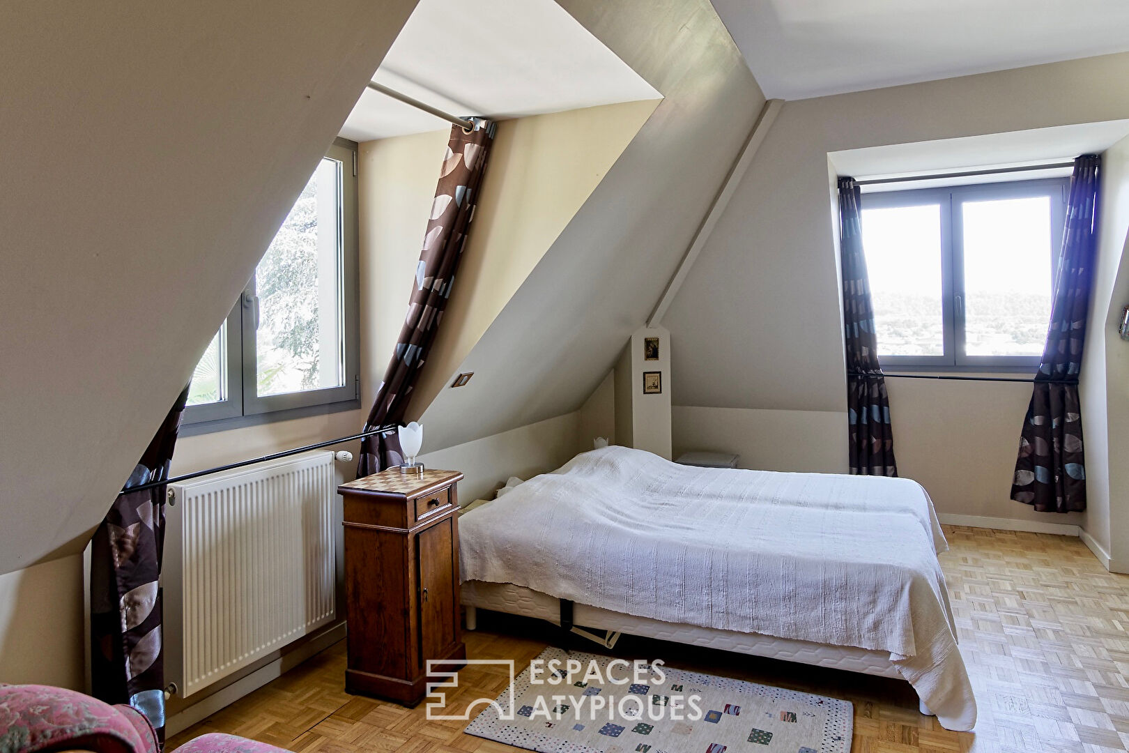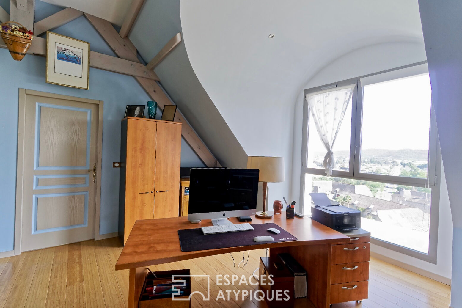 Dominant le paysage avec une vue à couper le souffle, cette villa des années 70 a bénéficié d'une rénovation radicale et élégante en 2014. Déployant environ 241 m² habitables sur une parcelle spectaculaire de plus de 6 500 m², cette propriété se définit par son architecture audacieuse et sa proximité immédiate avec la cité historique. Véritable balcon sur la nature, elle offre un cadre de vie où le luxe contemporain dialogue avec un environnement boisé, à seulement 15 minutes de Pau. L'espace de vie principal, baigné d'une lumière naturelle constante grâce à une orientation plein sud, s'organise autour d'un vaste séjour convivial. Les baies vitrées en aluminium anthracite encadrent le panorama comme des tableaux vivants, tandis qu'un poêle à bois réchauffe l'atmosphère. La cuisine contemporaine, aux lignes épurées et entièrement équipée, s'ouvre sur cet ensemble fluide. Un escalier sculptural en métal, véritable colonne vertébrale de la maison, mène à une passerelle en verre aérienne desservant l'étage. Ce niveau accueille deux chambres spacieuses, un bureau et une salle d'eau moderne. En rez-de-jardin, un appartement de deux pièces totalement indépendant offre une flexibilité rare, idéale pour recevoir ou pour l'exercice d'une profession libérale. L'extérieur est à la mesure de la maison : un parc arboré en pente qui garantit une intimité absolue et une perspective imprenable sur l'horizon. Entre garage, buanderie et espaces de rangement, 77 m² de surfaces annexes viennent parfaire la fonctionnalité de ce bien d'exception. A deux pas des commerces, des écoles et des lycées, cette villa incarne une opportunité rare de conjuguer vie citadine et retraite paisible. Cette villa est une signature de l'immobilier de prestige, où chaque détail architectural, de la transparence du verre à la force du métal, souligne son caractère atypique. CLASSE ÉNERGIE : C / CLASSE CLIMAT : C Montant moyen estimé des dépenses annuelles d'énergie pour un usage standard, établi à partir des prix de l'énergie de l'année 2021 entre 2210 et 3050 euros. Contact David DUCOS au 06.12.96.60.54 RSAC : 424 848 216 - PAU David Ducos (EI) Agent Commercial - Numéro RSAC : 424 848 216 - PAU.