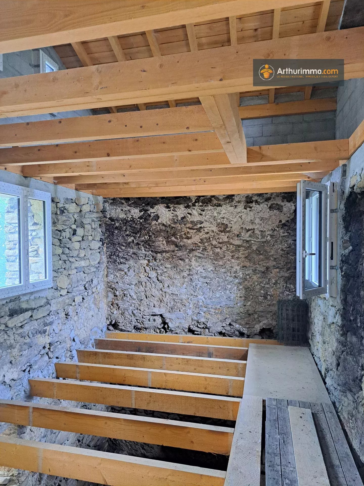 Tout le gros oeuvre est fait : Toiture, murs, fenêtres doubles vitrages, Poutres pour plancher, assainissement aux normes... L'intérieur reste à faire selon vos envies !