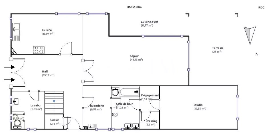 Le séjour, véritable cœur de la maison, est sublimé par une majestueuse cheminée en pierre qui invite à de douces soirées en famille ou entre amis.