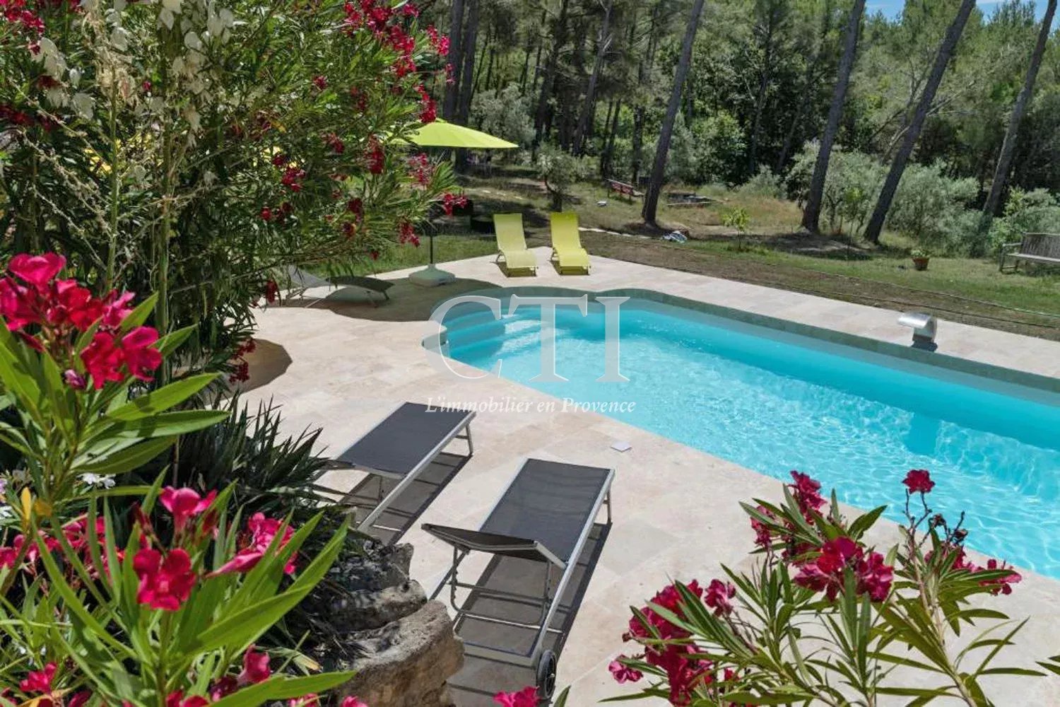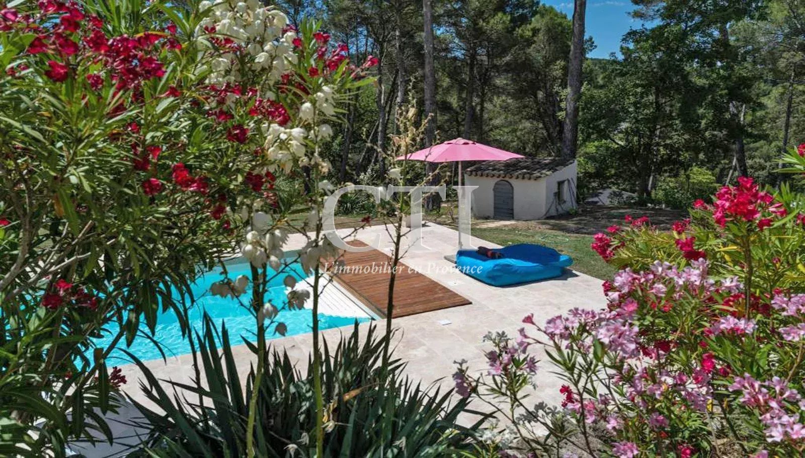 La propriété est enveloppée par une végétation luxuriante qu'offre son terrain dominant de 7 166 m² entièrement clos avec son espace piscine et ses plages en travertin.