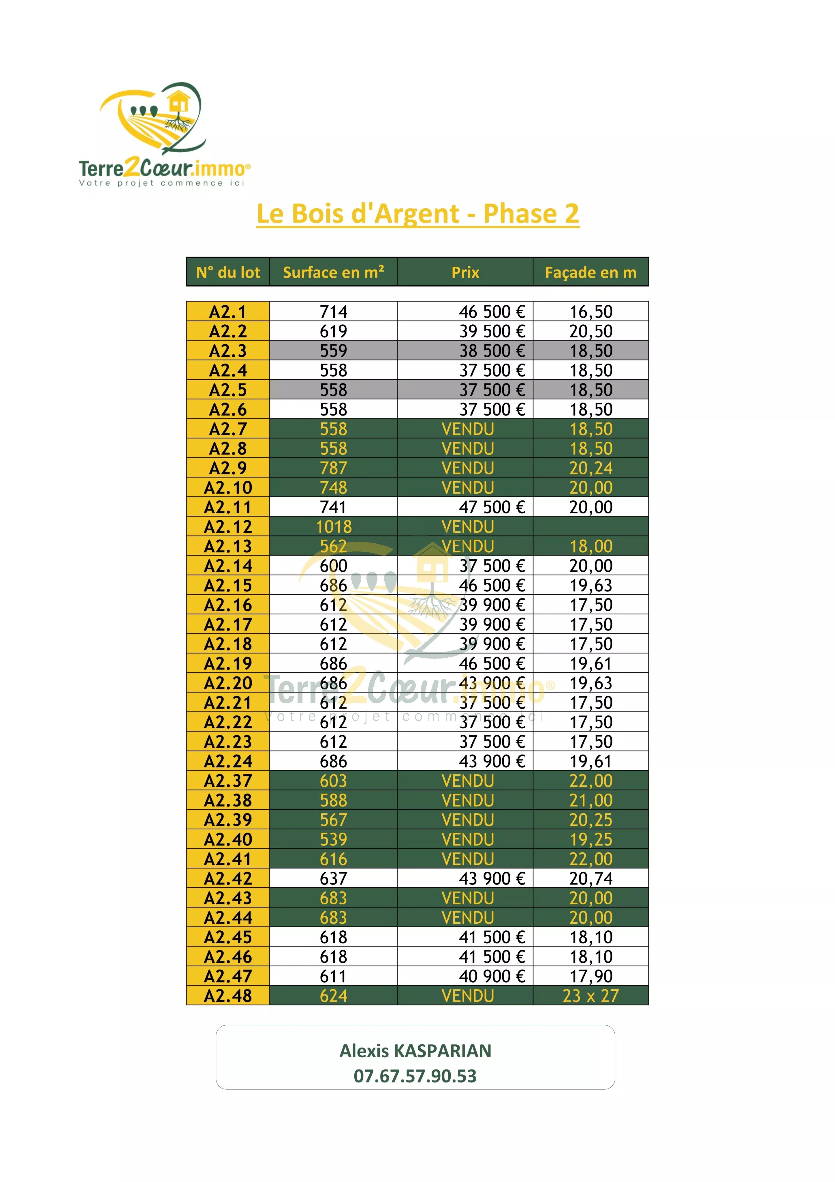 🌳 À vendre – Terrains à bâtir viabilisés à Saint-Florent-sur-Cher – ZAC du Bois d’Argent 🌳 📍 À l’entrée de la ville, côté Bourges – Environnement agréable et toutes commodités à proximité ! Vous rêvez de construire dans un secteur calme, pratique et en plein développement ? Bienvenue à la ZAC du Bois d’Argent, un nouveau quartier résidentiel à Saint-Florent-sur-Cher, situé à l’entrée de la commune côté Bourges ! 🏡 Parcelles disponibles de 558 m² à 1 018 m² 💰 Prix attractifs de 37 500 € à 54 900 € – voir grille tarifaire en annexe 🎯 Des surfaces idéales pour tous types de projets : résidence principale, secondaire ou investissement ✅ Terrains entièrement viabilisés : eau, électricité, gaz, fibre optique, tout-à-l’égout ✅ Bornés – Étude de sol G1 réalisée ✅ Libre constructeur : concevez le projet qui vous ressemble ! 📍 Localisation privilégiée : Entrée de ville côté Bourges Proche de toutes les commodités : écoles, commerces, transports, services Accès rapide à Bourges et aux axes majeurs 🎁 Avantages financiers sur l’ensemble des terrains – une belle opportunité à ne pas manquer ! 📞 Pour recevoir la grille des prix, un plan de la ZAC ou organiser une visite, contactez Alexis, votre conseiller foncier. 🌟 ZAC du Bois d’Argent – Un quartier paisible, bien desservi, prêt à accueillir votre future maison ! 💼 Honoraires à la charge du vendeur 🔎 Informations complémentaires Les risques auxquels ce bien est exposé sont disponibles sur le site Géorisques : www.georisques.gouv.fr Selon l'article L.561-5 du Code monétaire et financier, pour l'organisation de la visite, la présentation d'une pièce d'identité pourra être demandée 🏢 Mentions légales Cette annonce a été rédigée sous la responsabilité éditoriale de Alexis KASPARIAN, Agent Immobilier, immatriculé au R.C.S. de Bourges sous le numéro 999 156 318, agissant pour le compte de : SAS PAMPA IMMO - 31 Route des Clous 18110 VASSELAY - SIRET : 952 914 703 00014 - Capital social : 2 500 € Titulaire de la carte professionnelle Transactions sur immeubles et fonds de commerce (T) n° CPI18012023000000006 délivrée par la CCI du Cher Assurance responsabilité civile professionnelle : GALIAN-SMABTP – Contrat n° RCP_01_510576Y 👤 Responsable de l’annonce Alexis KASPARIAN - Agent Immobilier SAS AK IMMO – R.C.S. Bourges 999 156 318 Terre2Coeur .immo