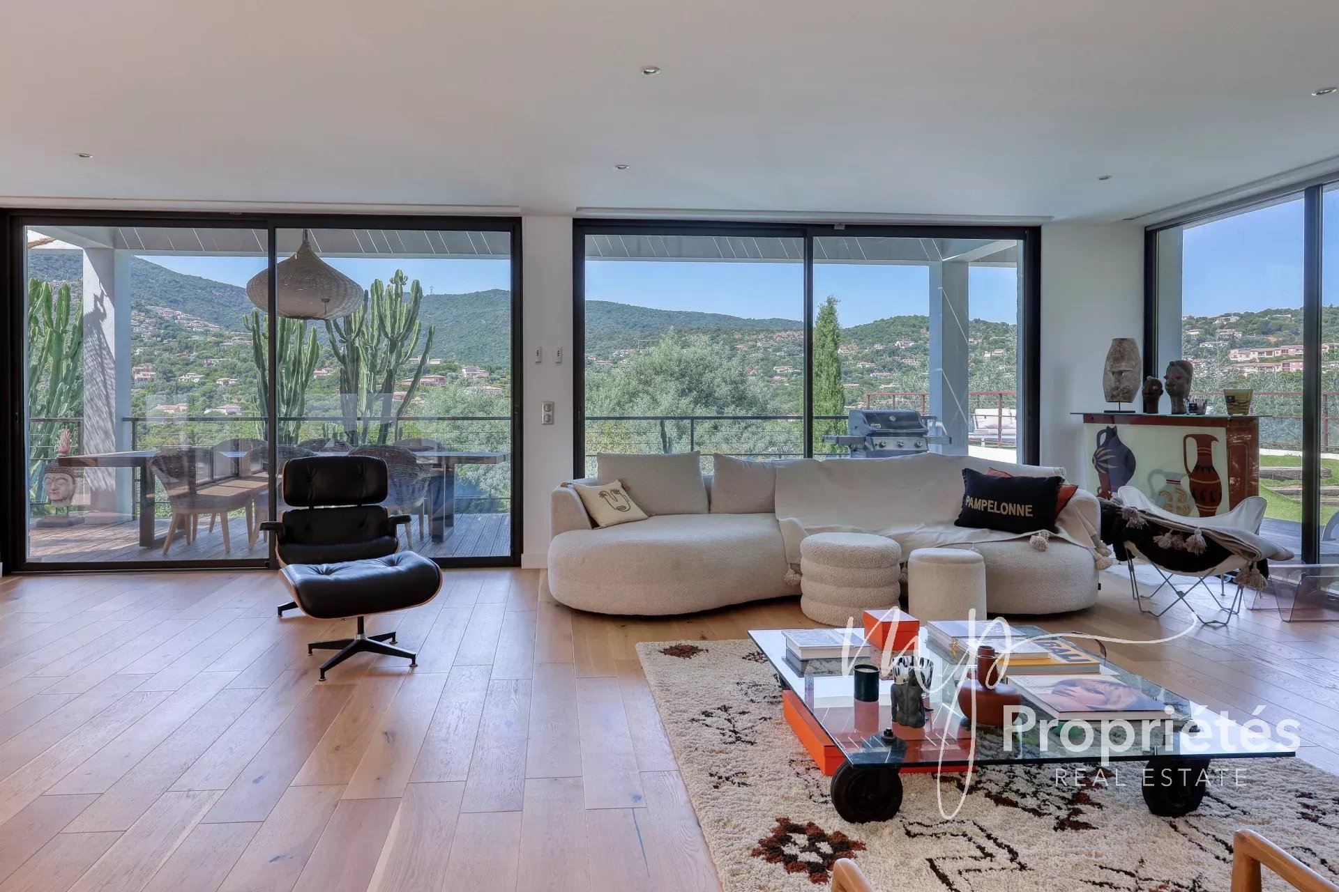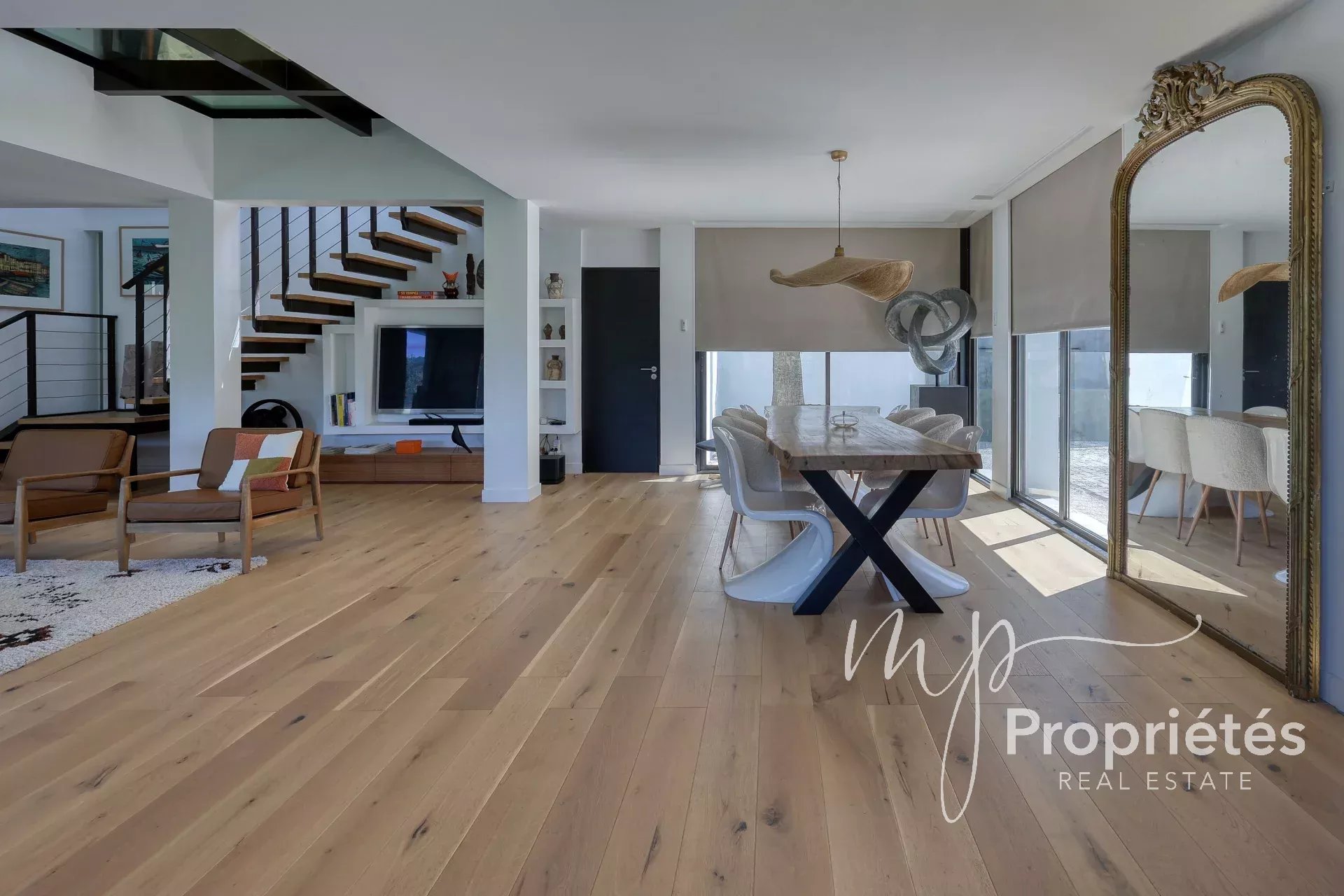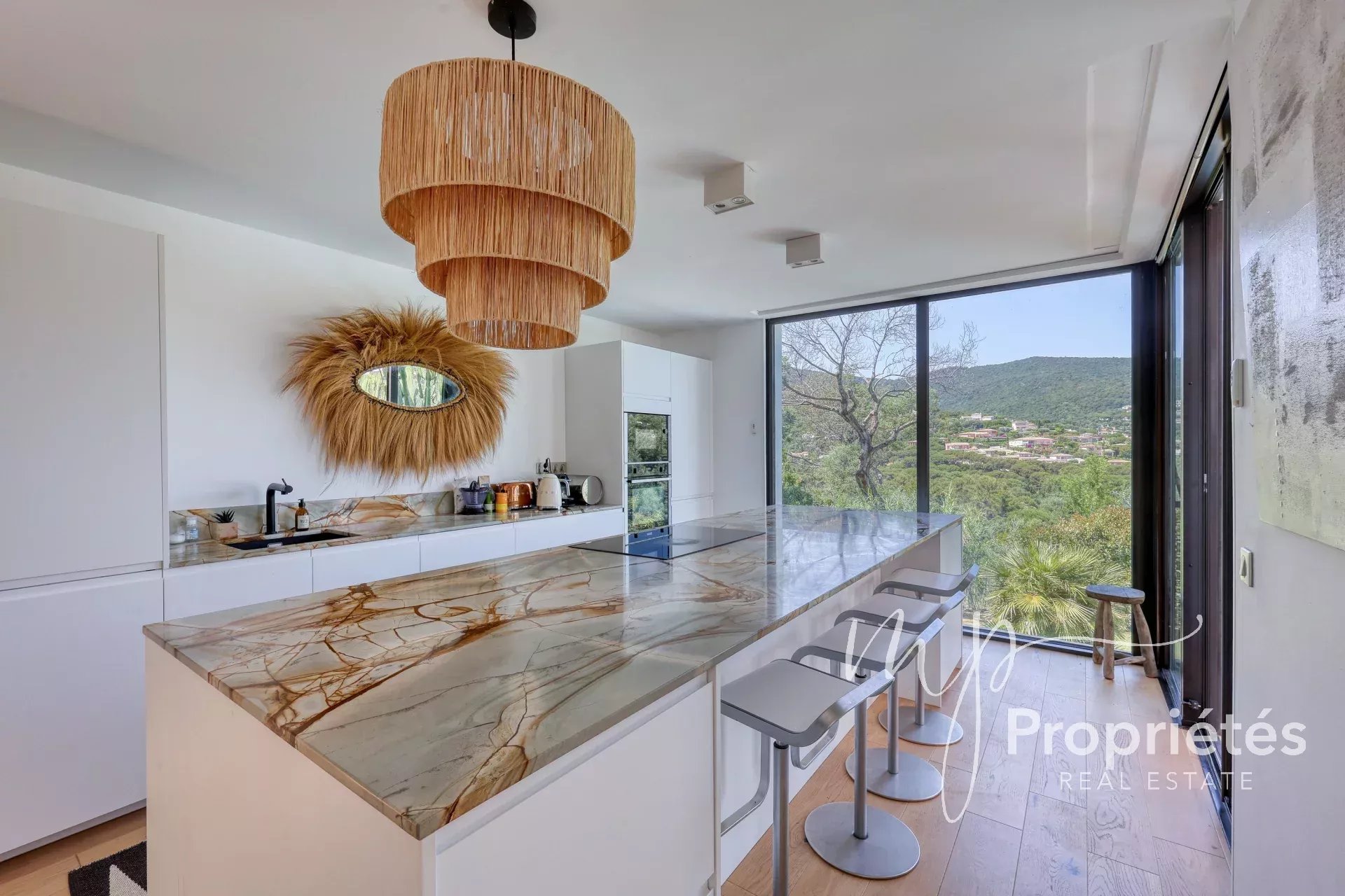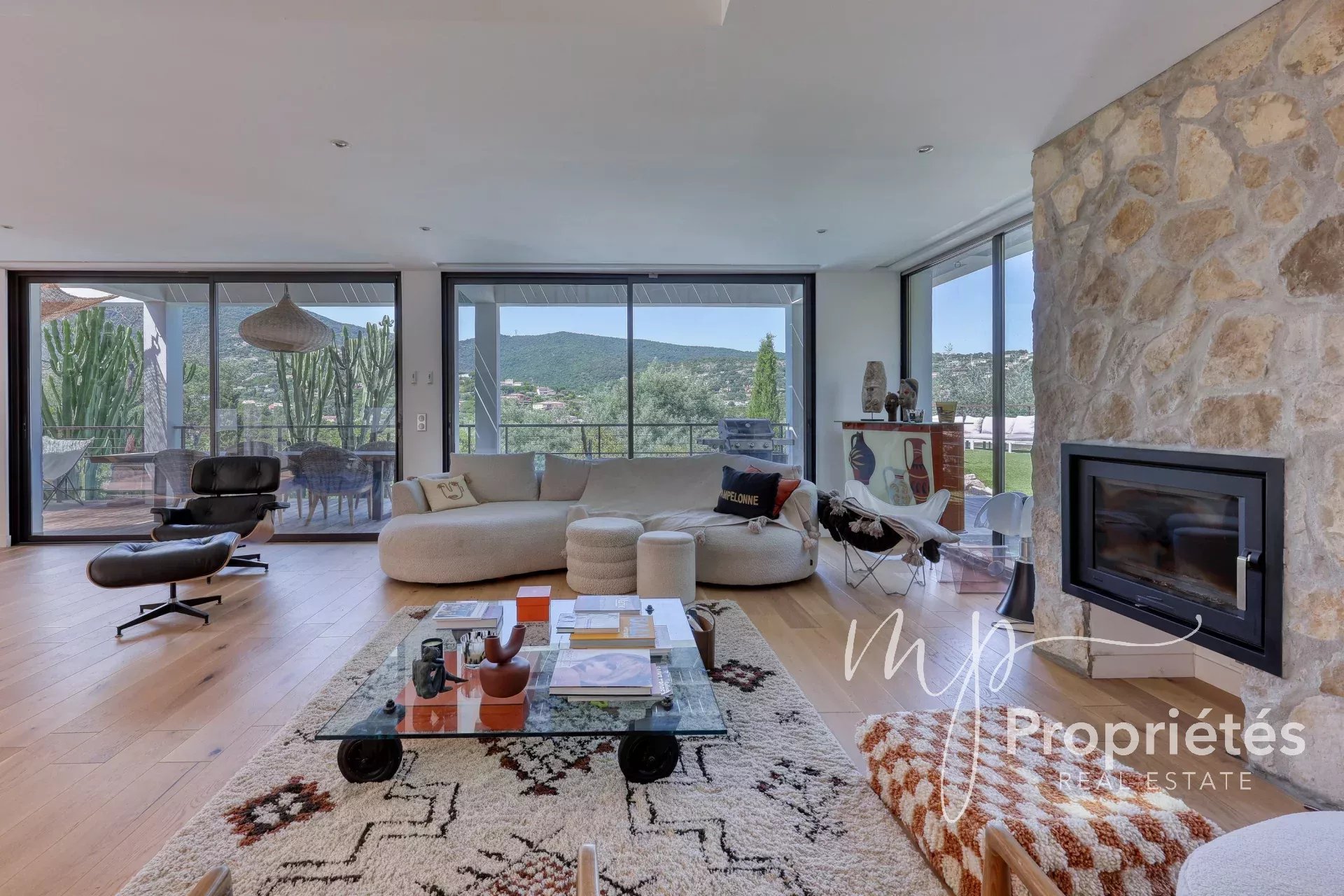 La villa dispose d’un vaste séjour-salle à manger de 65 m² avec cheminée et grandes baies vitrées, d’une cuisine entièrement équipée ouverte sur des terrasses ensoleillées, ainsi que d’une pièce polyvalente pouvant servir de bureau, rangement ou dressing.