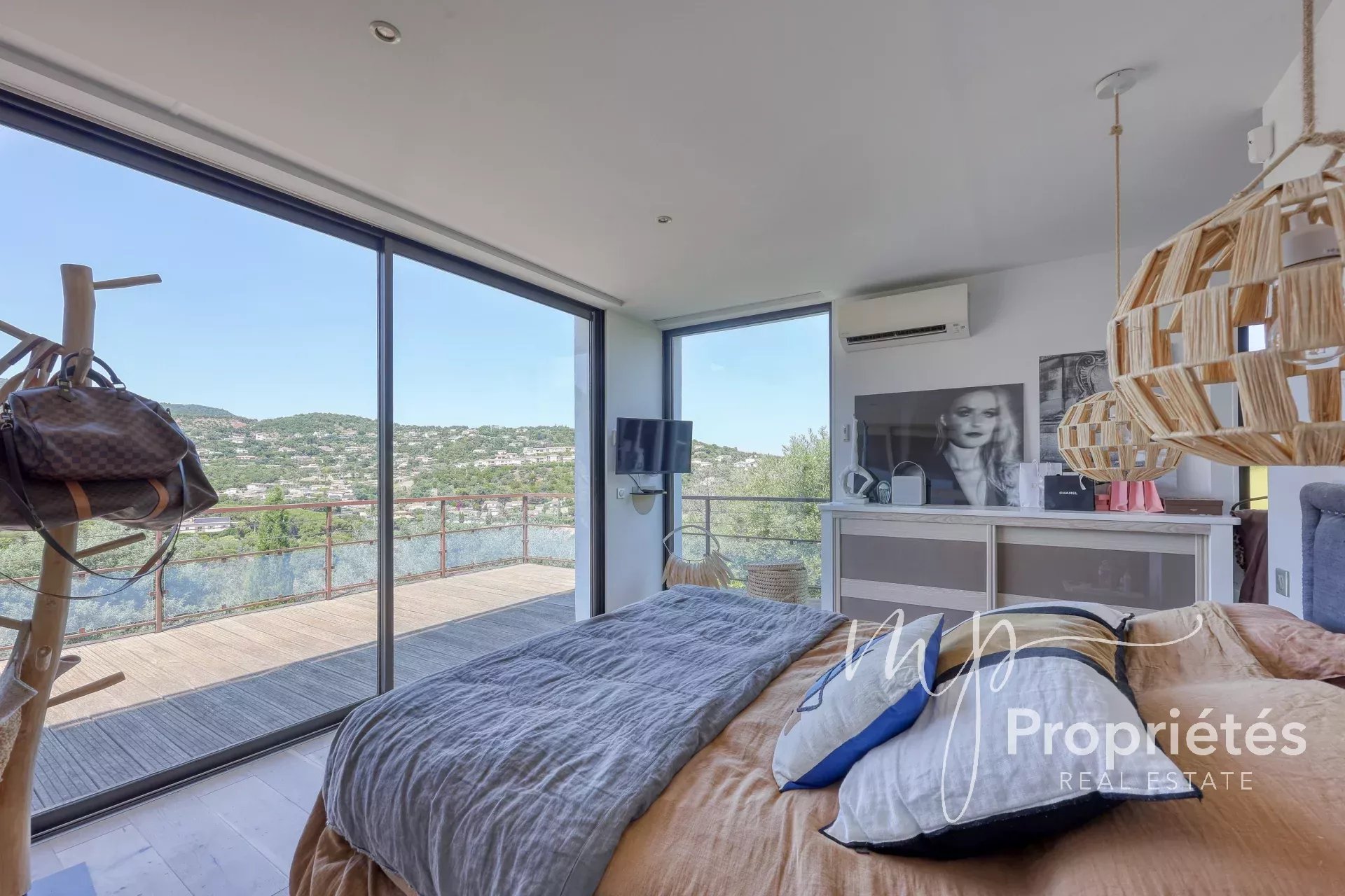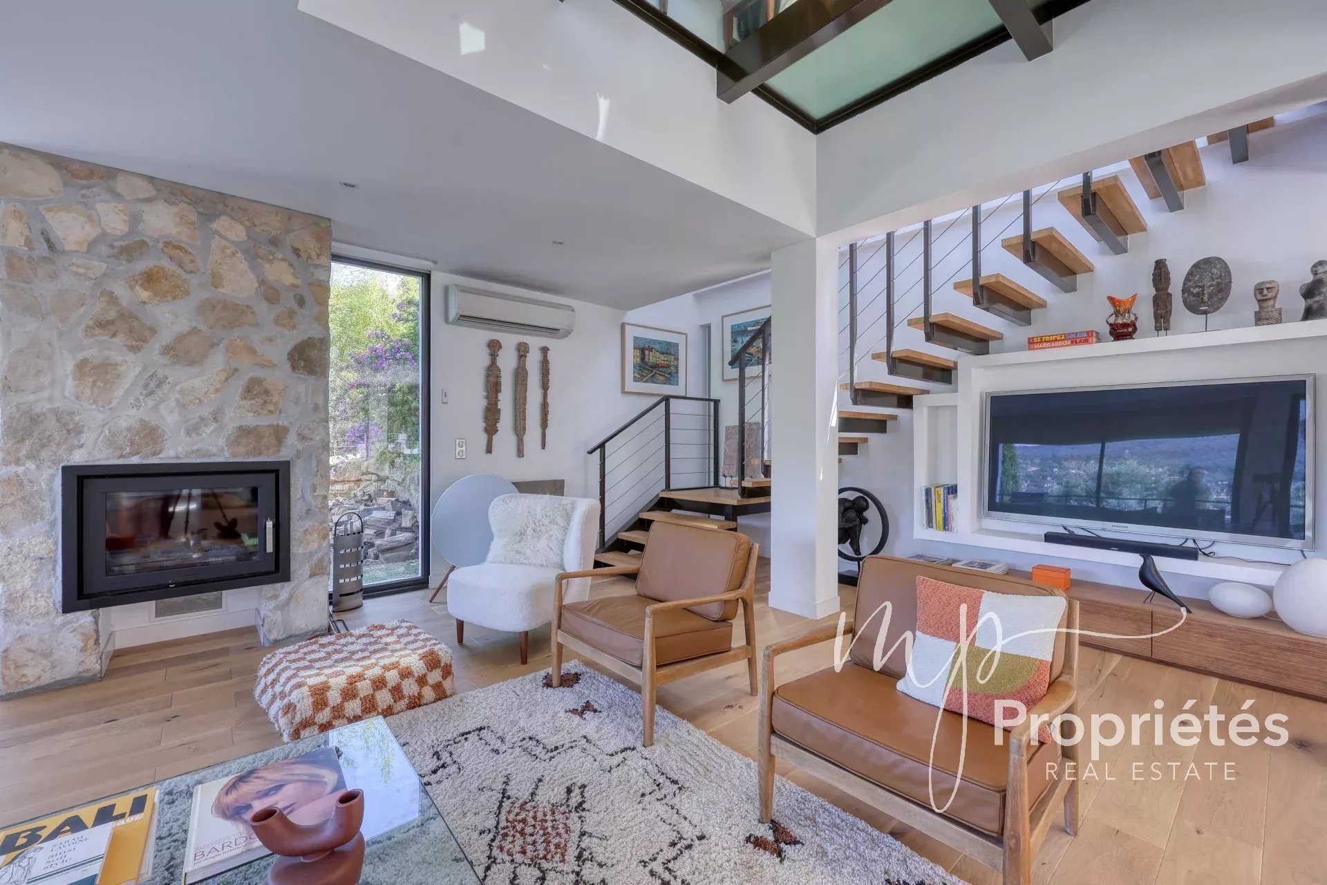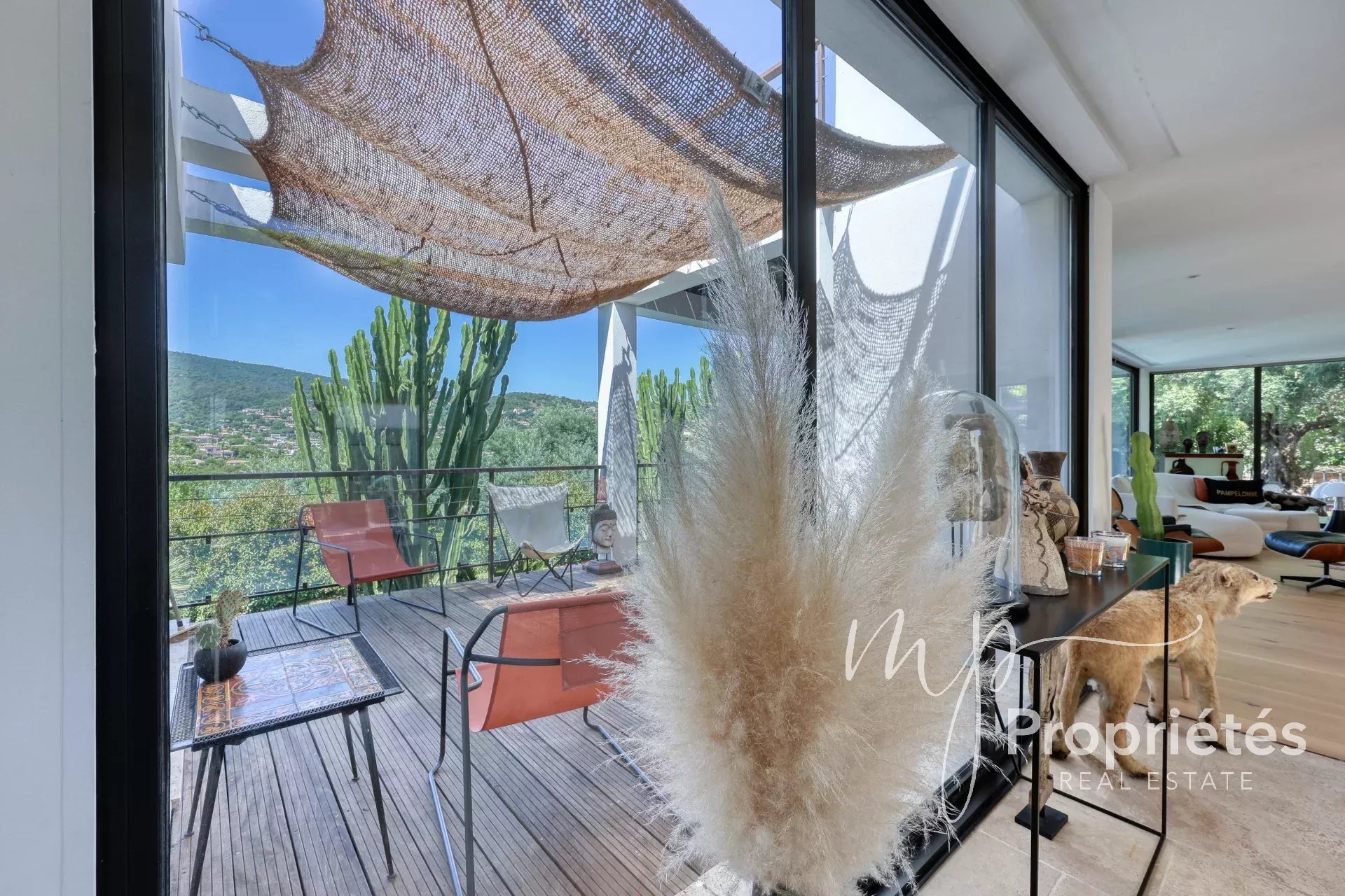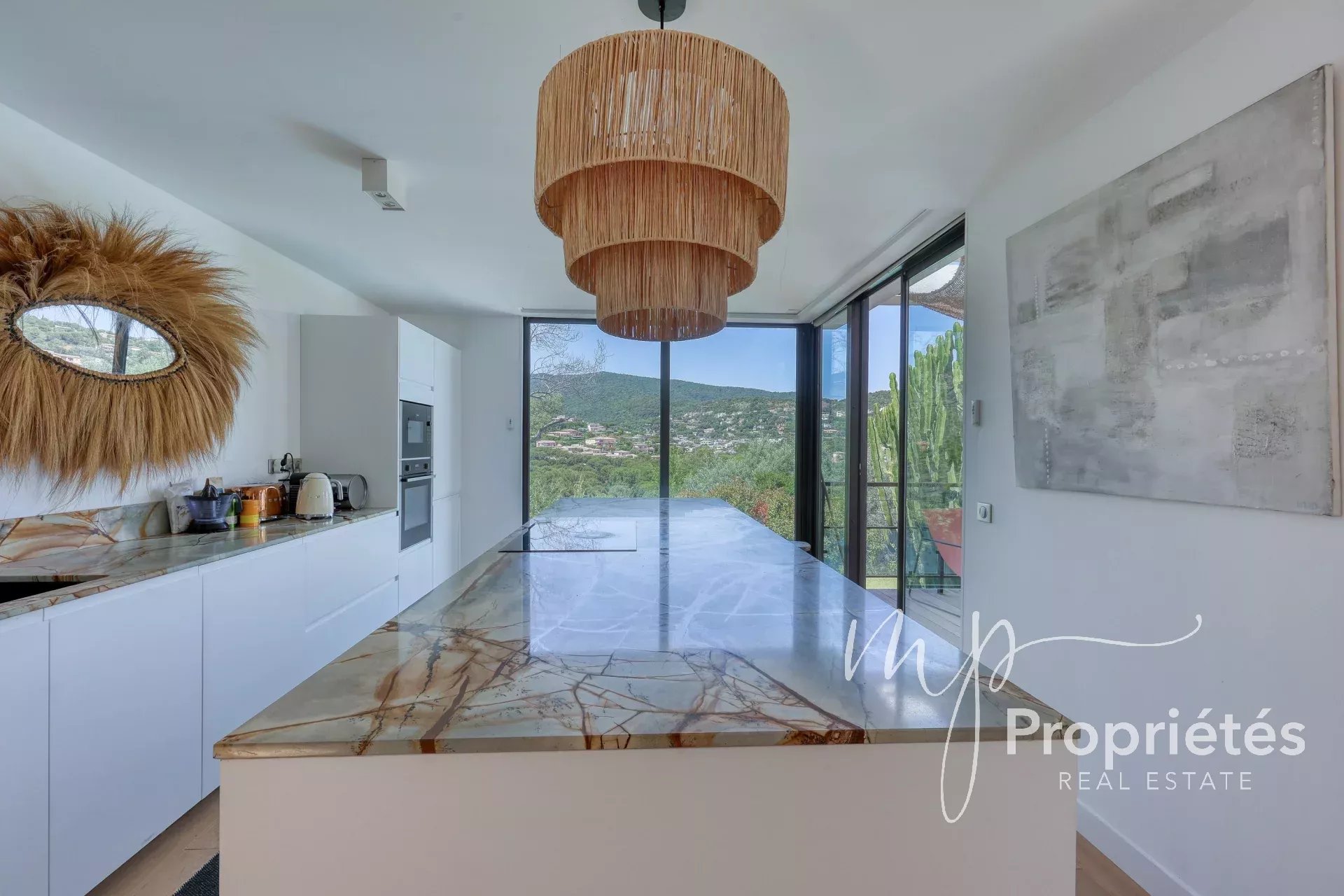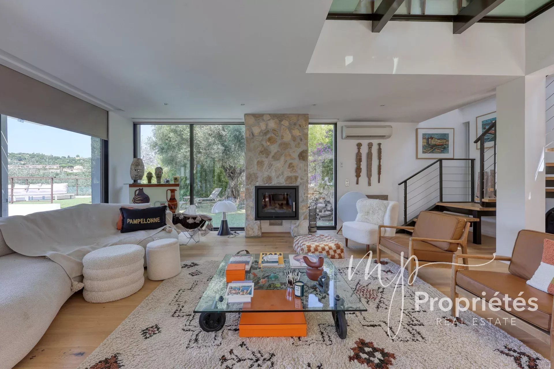 La villa dispose d’un vaste séjour-salle à manger de 65 m² avec cheminée et grandes baies vitrées, d’une cuisine entièrement équipée ouverte sur des terrasses ensoleillées, ainsi que d’une pièce polyvalente pouvant servir de bureau, rangement ou dressing.