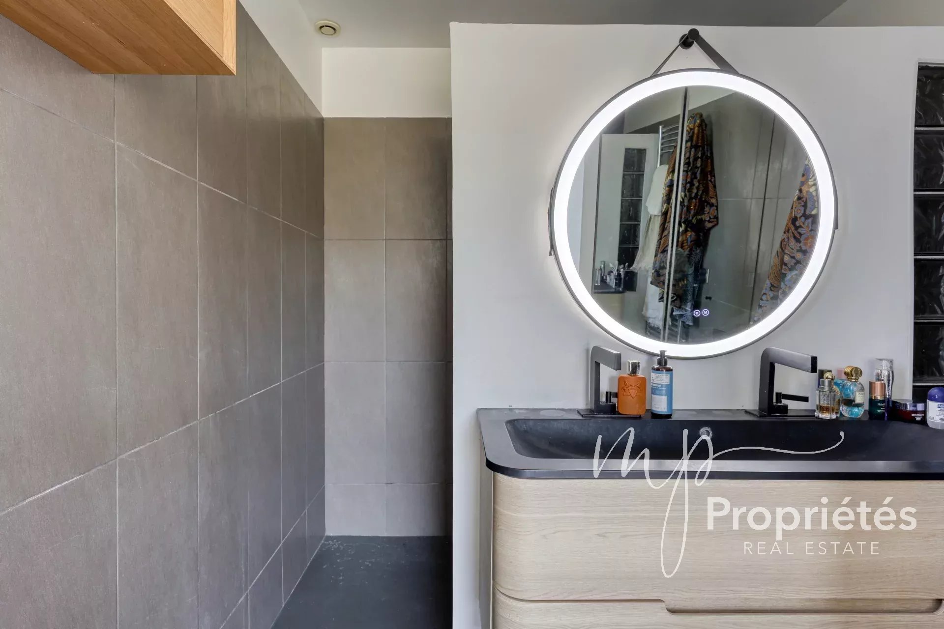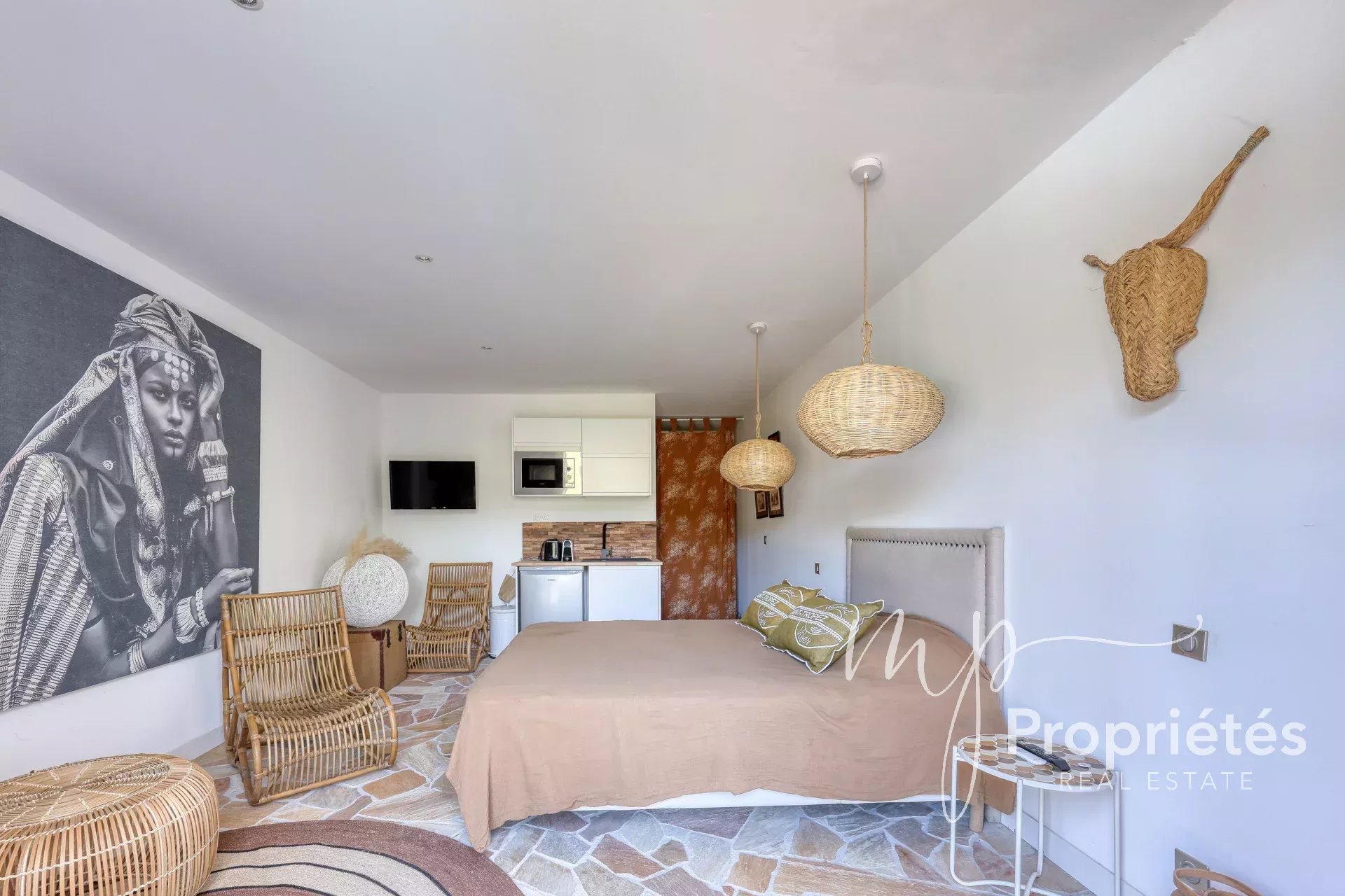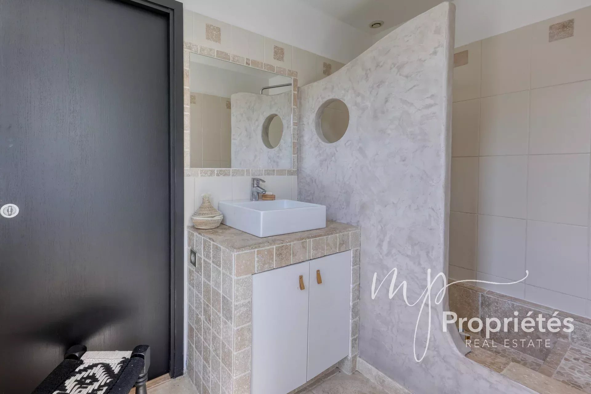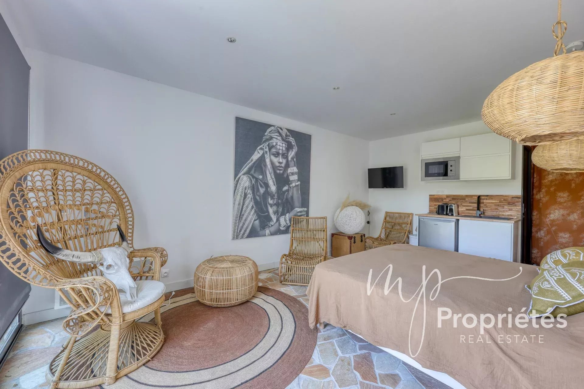Au rez-de-jardin, un studio indépendant avec kitchenette et salle de douche avec WC bénéficie d’un accès direct à la piscine, avec possibilité de recréer une interconnexion via un escalier.