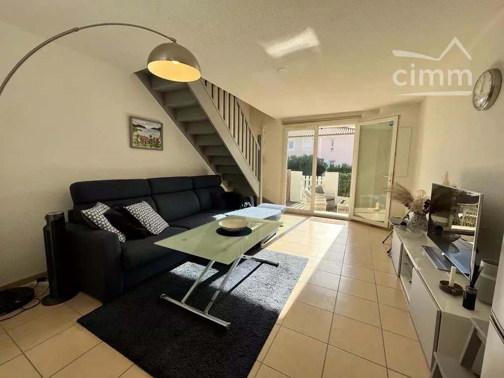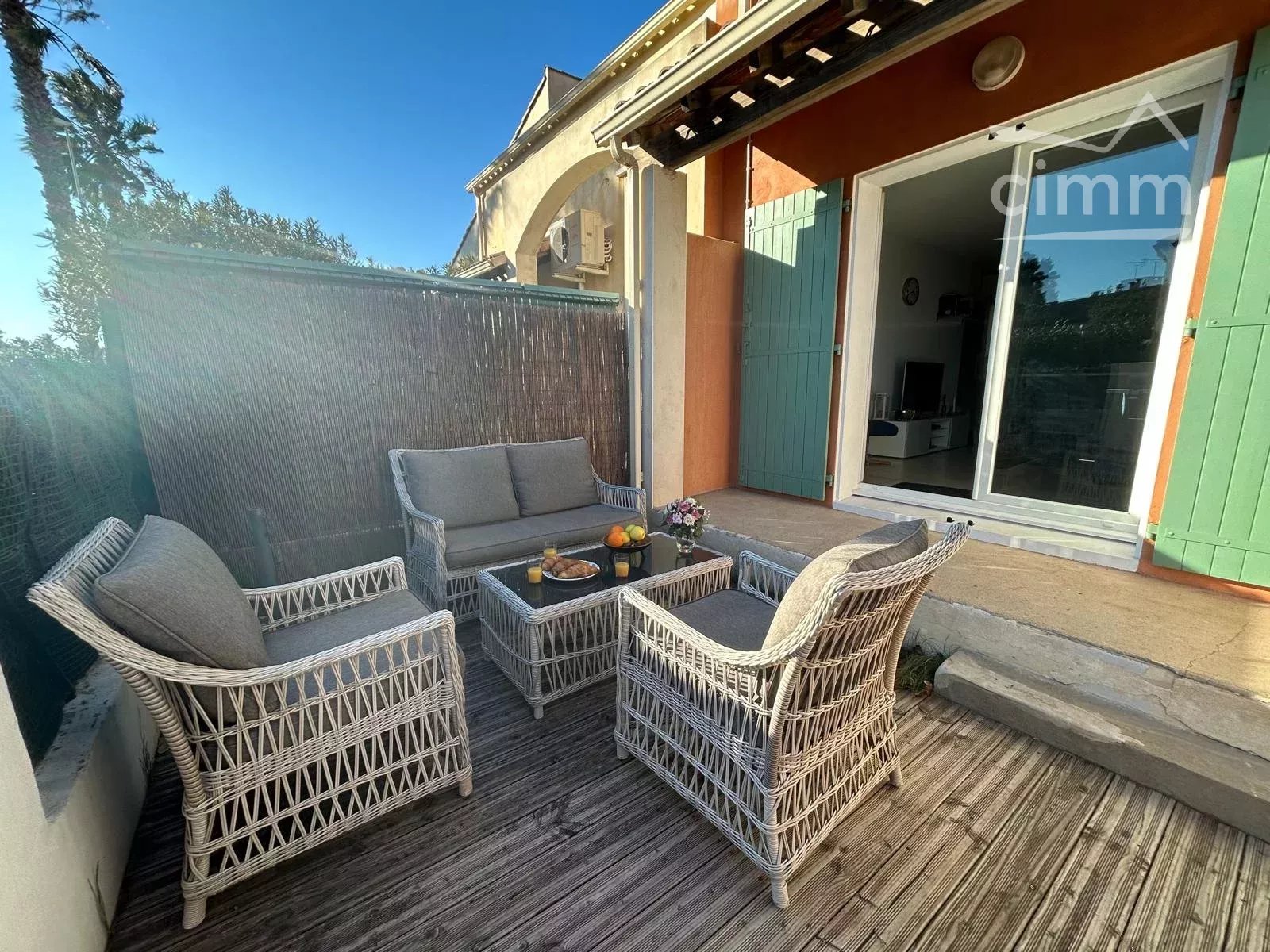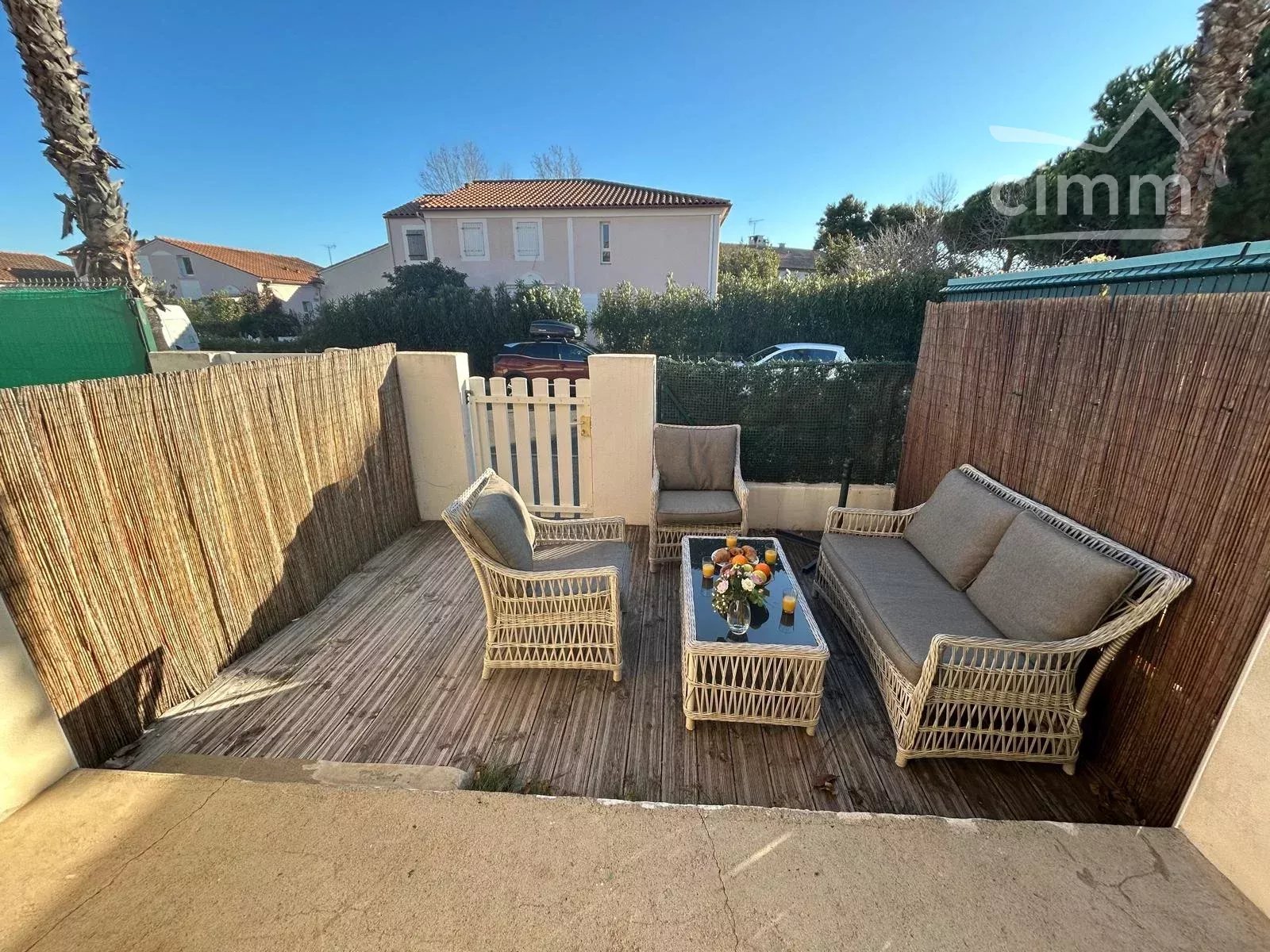 Joli pavillon conçu pour 6 personnes dans une résidence privée avec terrasse composé d'un salon séjour (canapé convertible) avec cuisine ouverte, un grand toilette (avec lave linge et évier), à l'étage deux chambres avec lit doubles (140) et une salle d'eau.