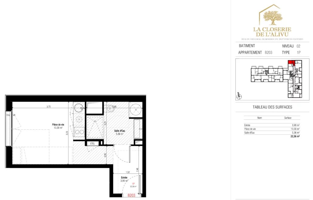 Appartement type T1 n°37 (portant le numéro B203 des plans des appartements) de 22,56 m2 habitable situé au 2ème étage de la résidence LA CLOSERIE DE L’ALIVU, rue générale de Boissoudy, 20137 PORTO-VECCHIO. En détail : Le logement comprend une entrée (3,90 m2), une pièce de vie (13,30 m2), une Salle d’Eau/sanitaire (5,36 m2). Le logement comprend également un parking intérieur n°88 non clos d'une surface de 12.50 m2 du bâtiment, escalier A, portant le N°A43 des plans.