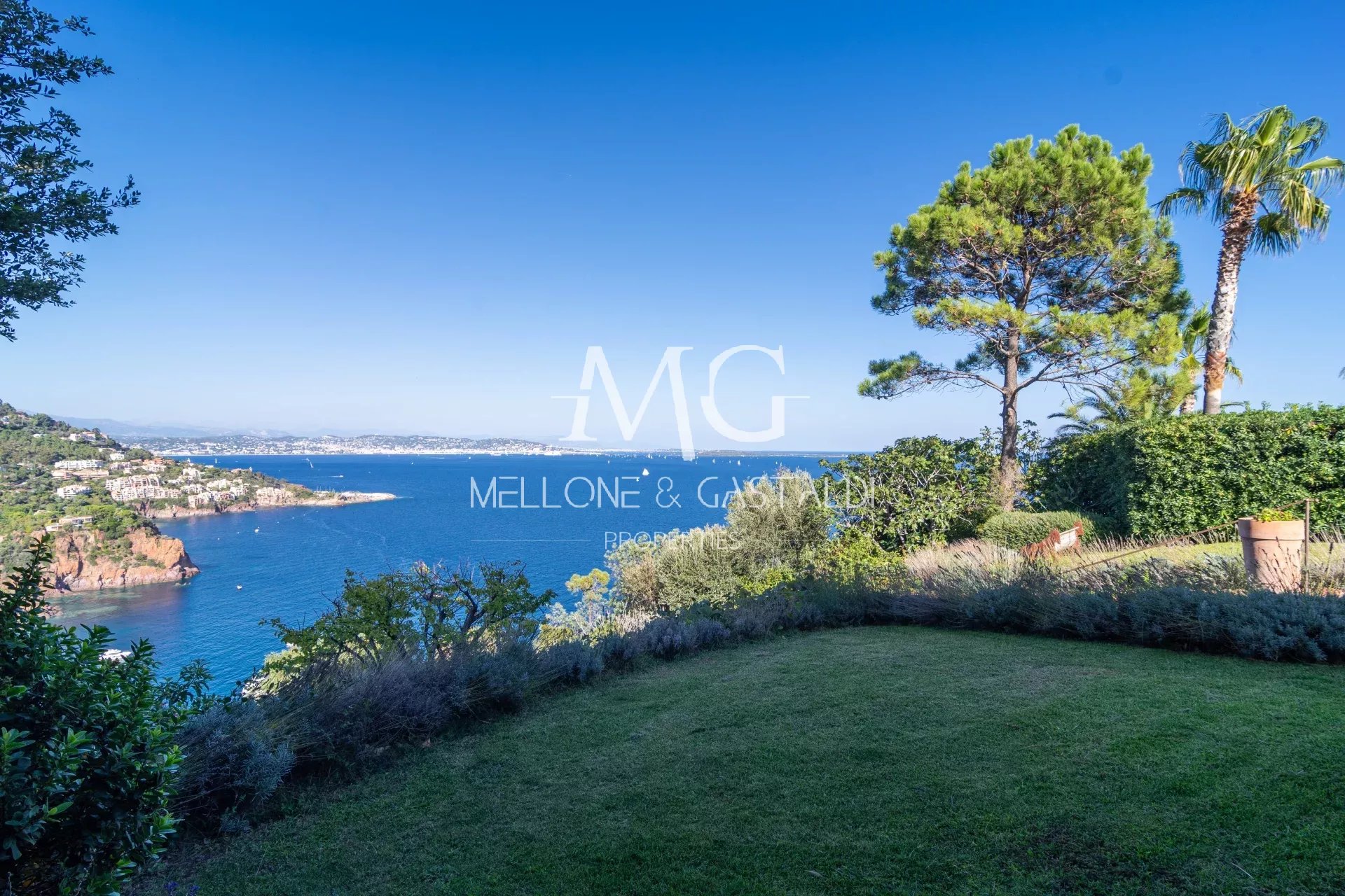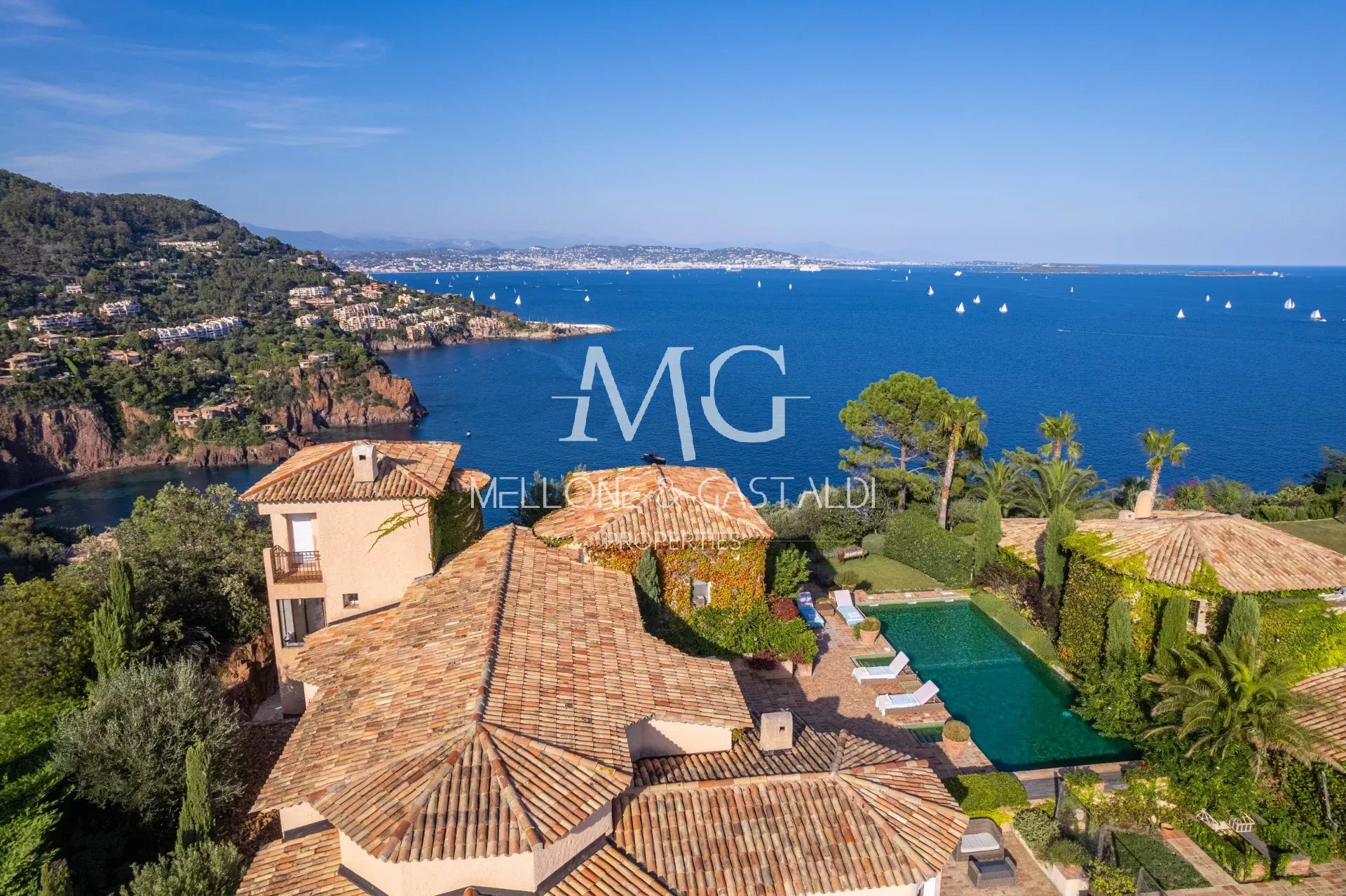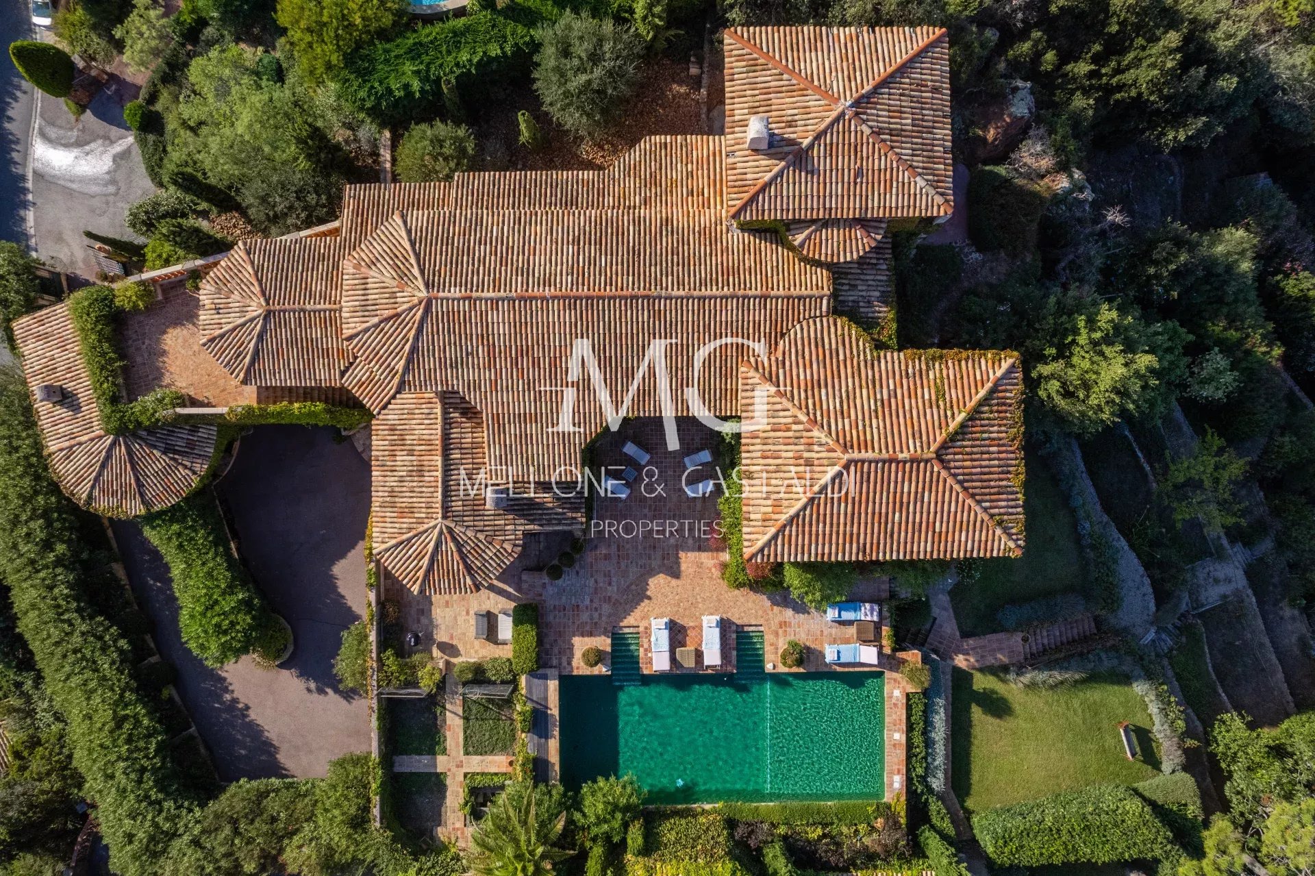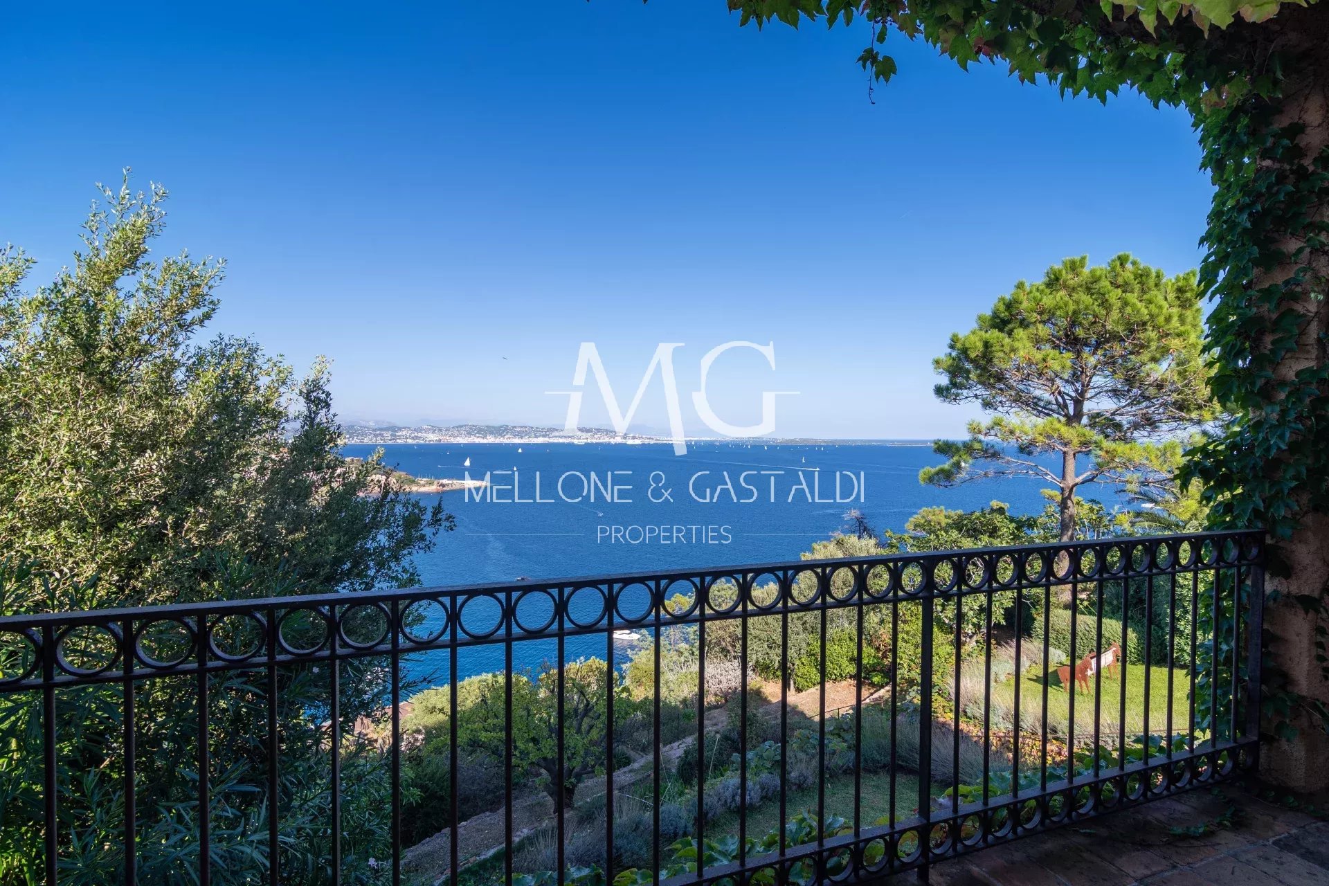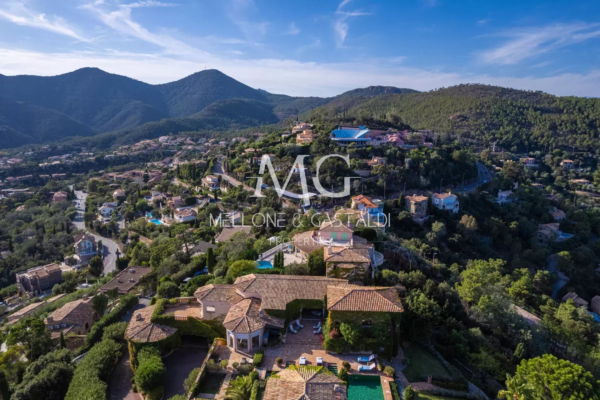 Propriété rare et exceptionnelle à 20 mins de Cannes et quelques mins de la mer, dans un cadre idyllique, magnifique villa de 430m2 édifiée sur un terrain de 3400 m² bénéficiant d'une vue imprenable et panoramique sur la Mer. La villa se compose d'un double séjour avec cheminée donnant sur une terrasse et la piscine chauffée, un espace bureau, un bar, une cuisine aménagée et équipée ainsi qu'une salle à manger ouvrant sur une grande terrasse à l'Ouest. La villa comprend 5 chambres en suite et toutes les pièces bénéficient d'une vue sur la mer. La maison de gardien comprend 2 chambres. Parking couvert pour 4 véhicules, Très rare à la vente, à visiter au plus vite,