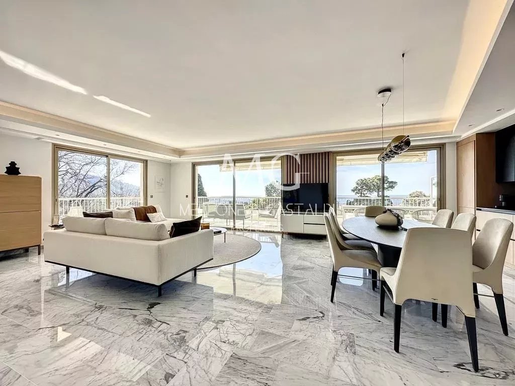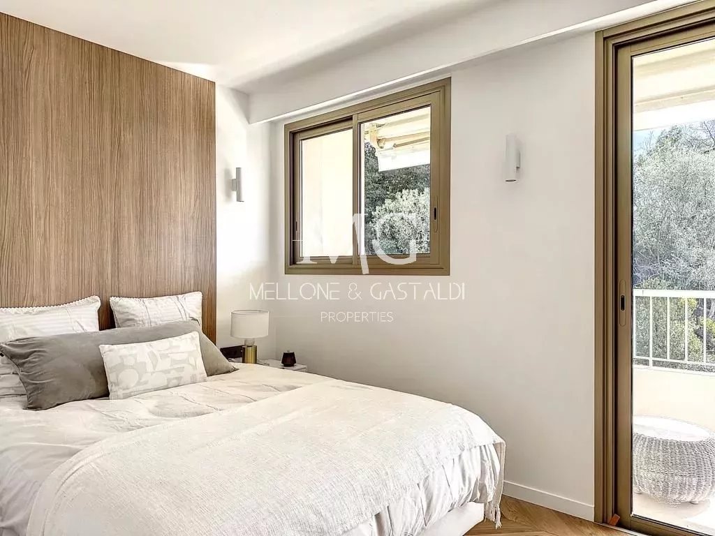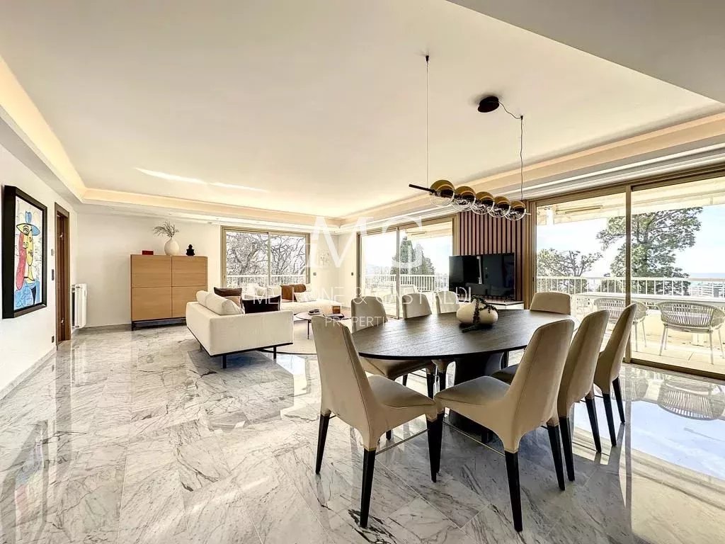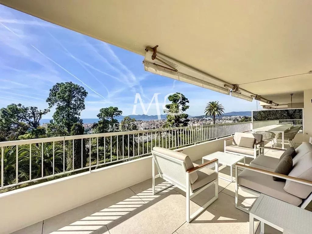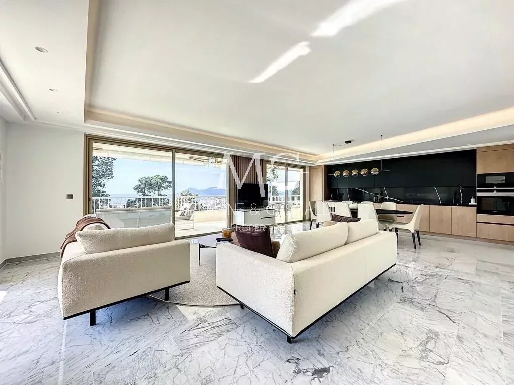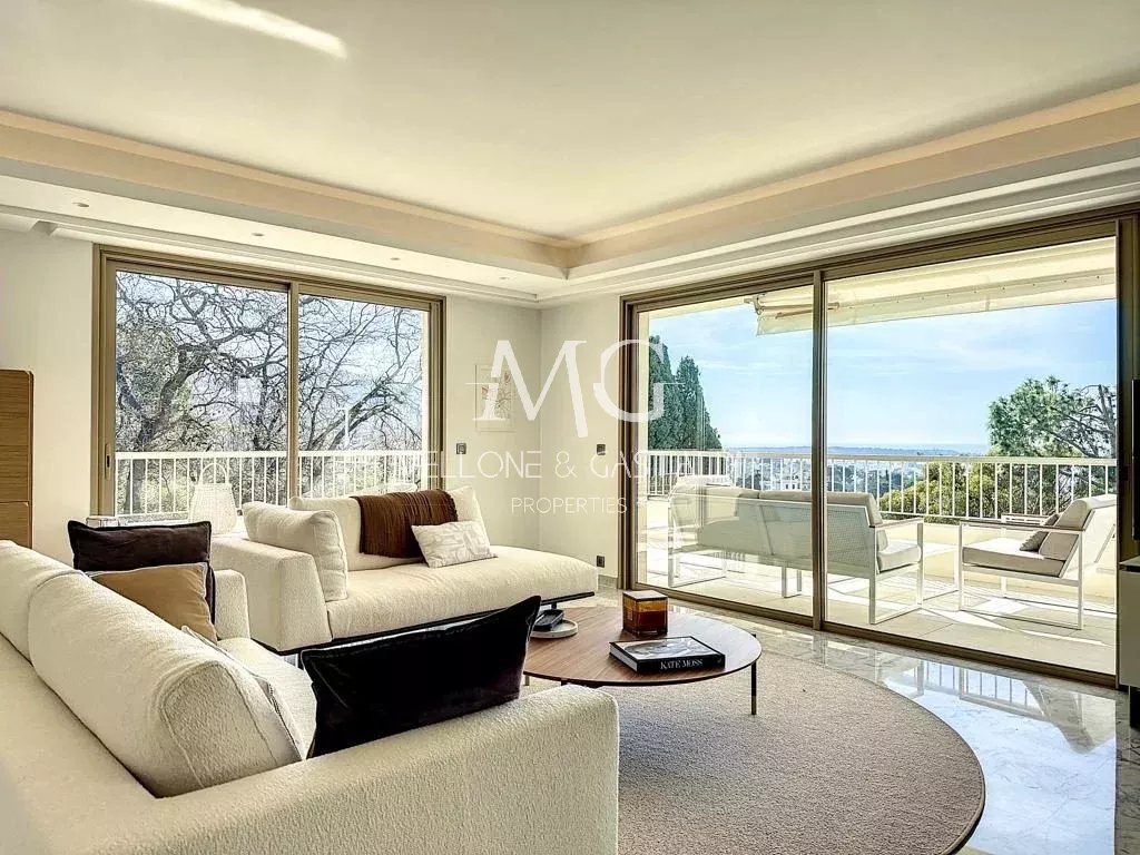 Secteur Moyenne Californie, au sein d'une résidence de standing, magnifique 5 pièces entièrement refait à neuf de 128m2 incluant un studio de 13m2 avec terrasse d'angle de 51m2 bénéficiant d'une vue panoramique sur la baie de Cannes et les îles de Lérins. Il se compose d'un spacieux séjour donnant sur une terrasse exposée Sud. Une cuisine ouverte aménagée et équipée et 3 chambres en suite + le Studio avec salle d'eau. L'appartement est entièrement rénové avec des matériaux de standing. Un garage et une cave complètent ce magnifique appartement à visiter rapidement,