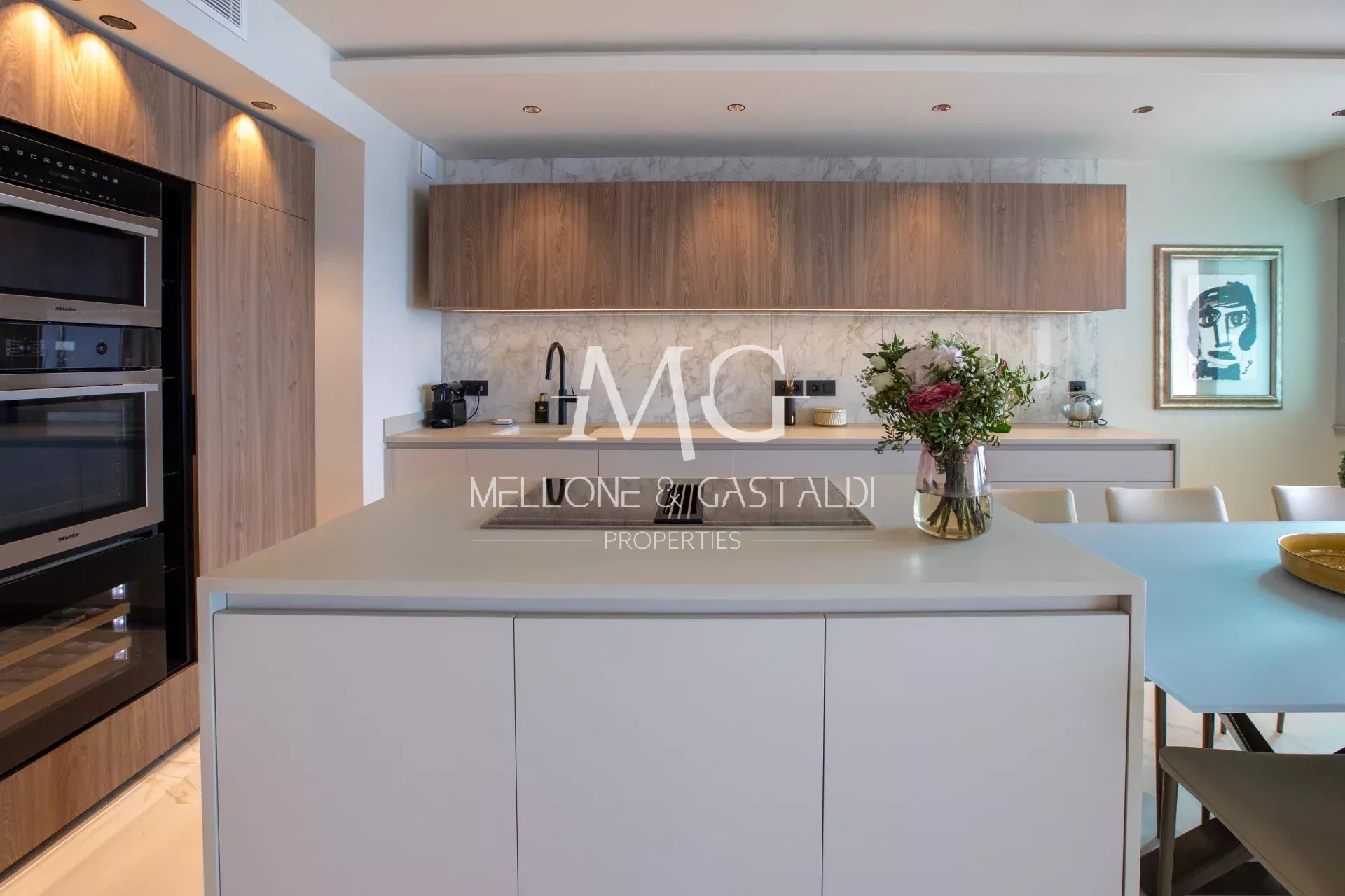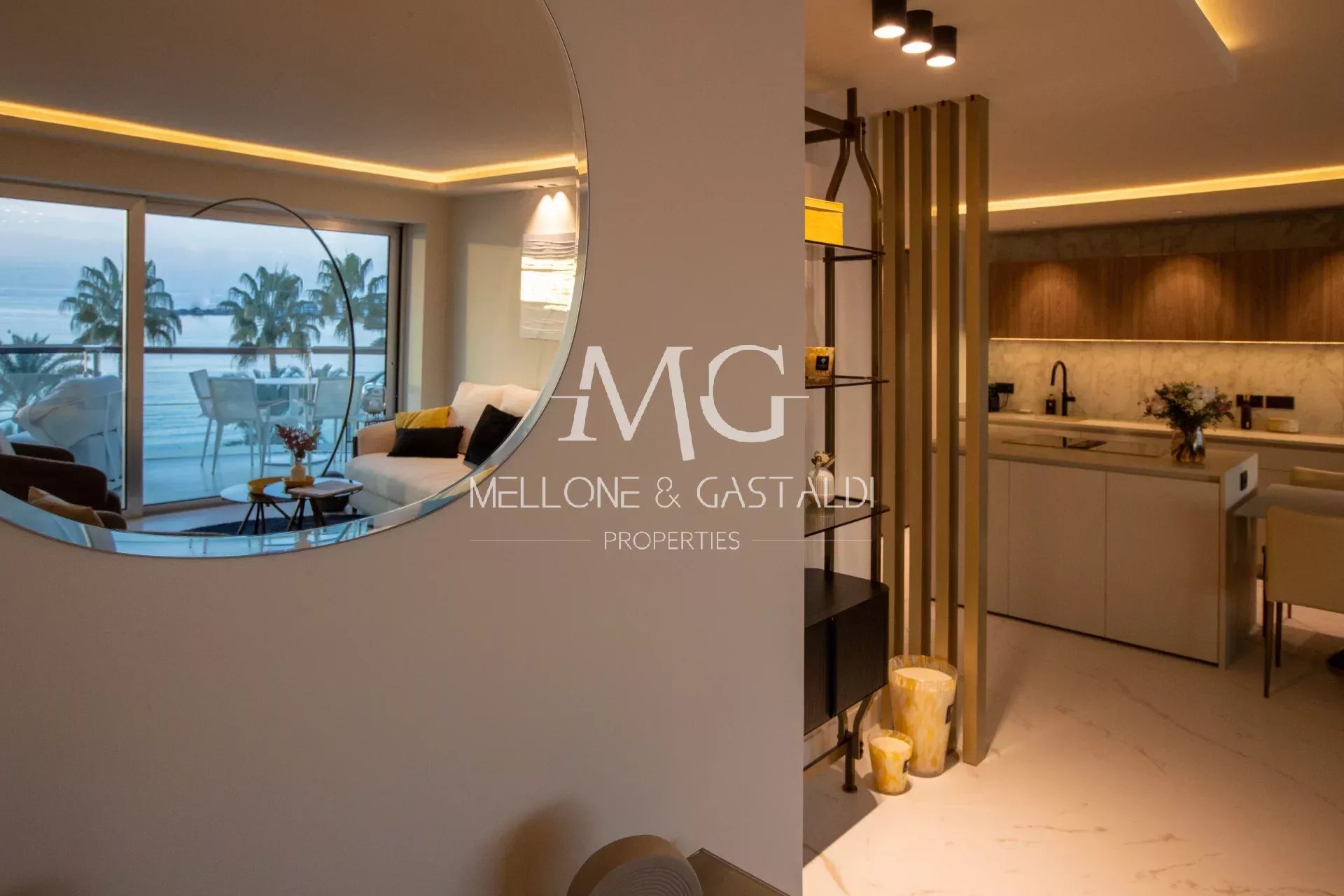 Cannes | Croisette, au sein d'une belle résidence sécurisée avec gardien, magnifique 3 pièces neuf, traversant, en étage élevé d'environ 90m2 avec terrasse de 11m2 exposée Sud et bénéficiant d'une vue mer panoramique du Palm Beach au Suquet ainsi que sur les collines de l'Esterel. L'appartement rénové avec des matériaux de qualité se compose d'un salon avec cuisine ouverte lumineux, de 2 chambres et de 2 salles de douches. Les charges de copropriété inclus l'eau chaude et le chauffage. 1 parking et une cave complètent ce bien exceptionnel,