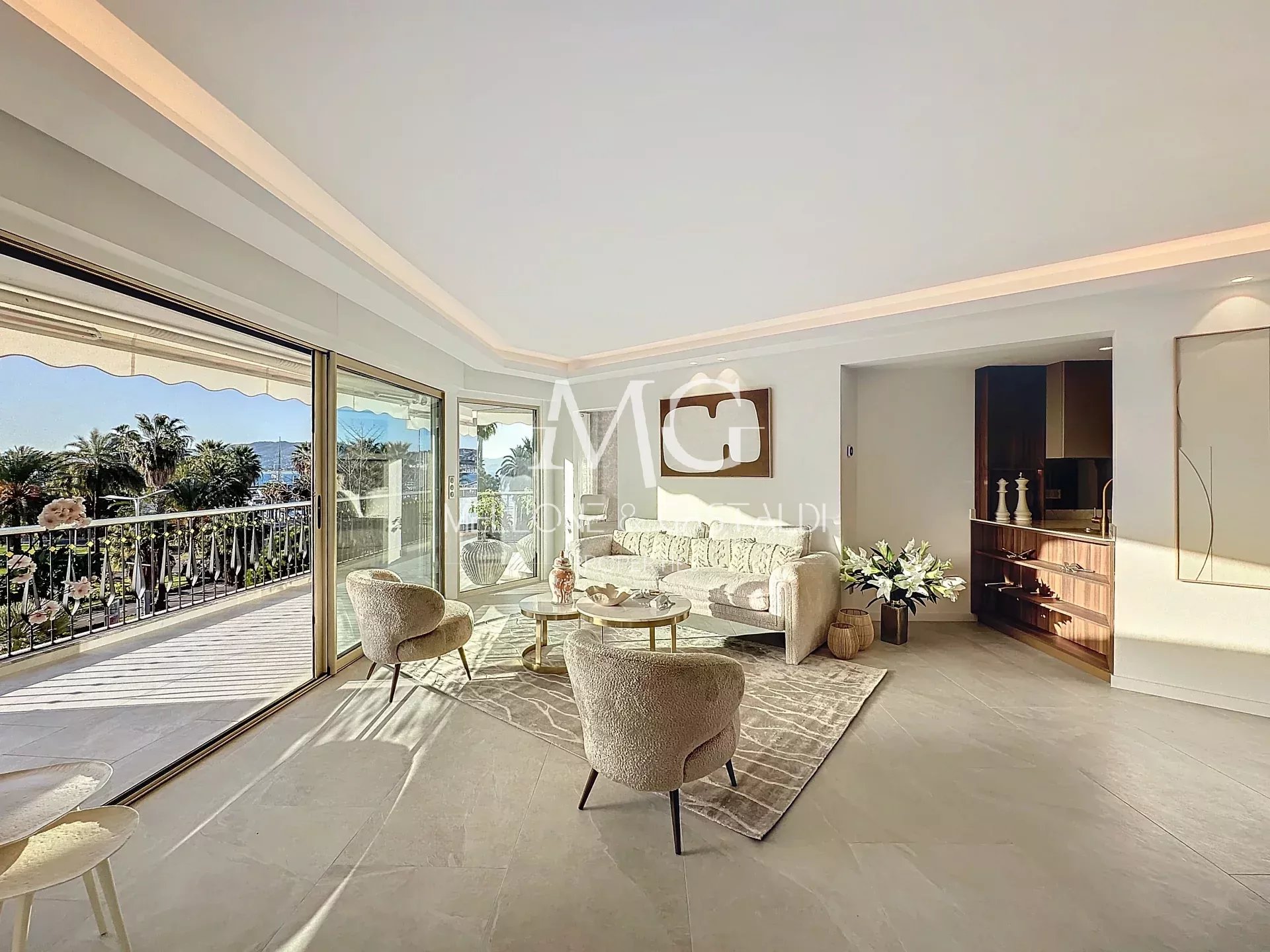 [SOUS OFFRE] Cannes La Croisette, proche port Canto, superbe appartement traversant de 3 pièces avec terrasse de 18m2 avec belle vue dominante sur la mer et la baie de Cannes. Entièrement neuf avec des prestations haut de gamme raffinées. Entrée. Cuisine ouverte équipée. Séjour donnant sur grande terrasse Sud-Ouest vue mer. 2 chambres avec salle d'eau et wc dont une master avec terrasse vue mer. Cave. VD