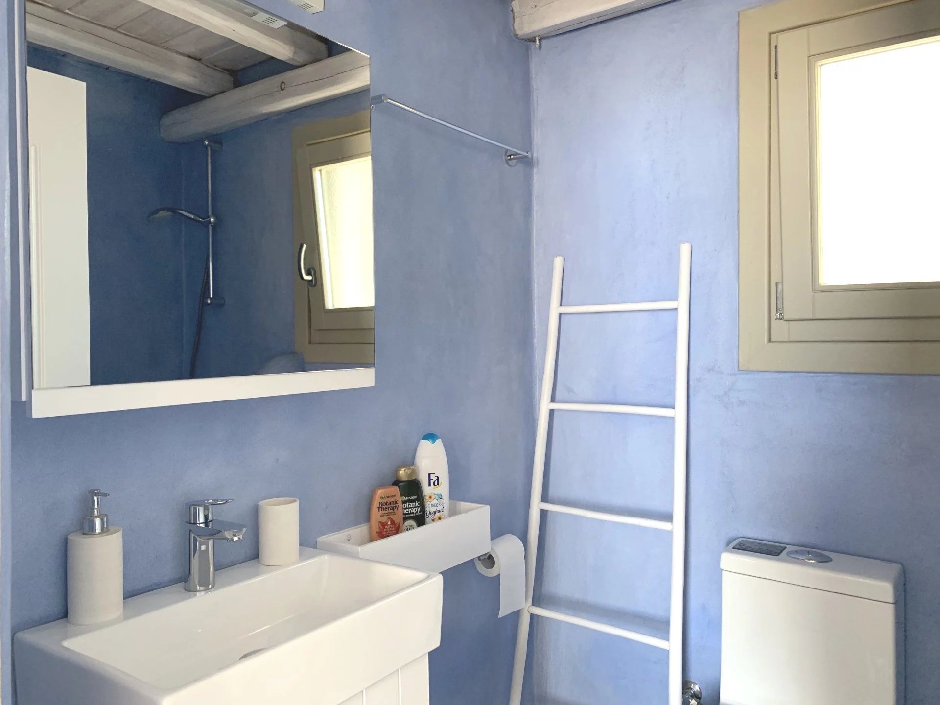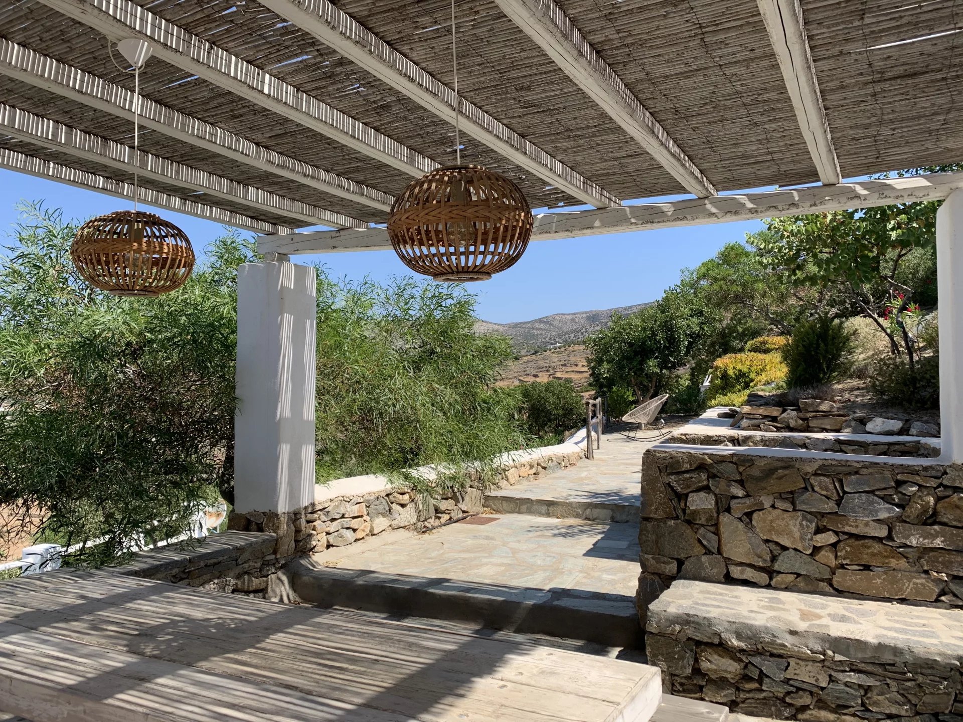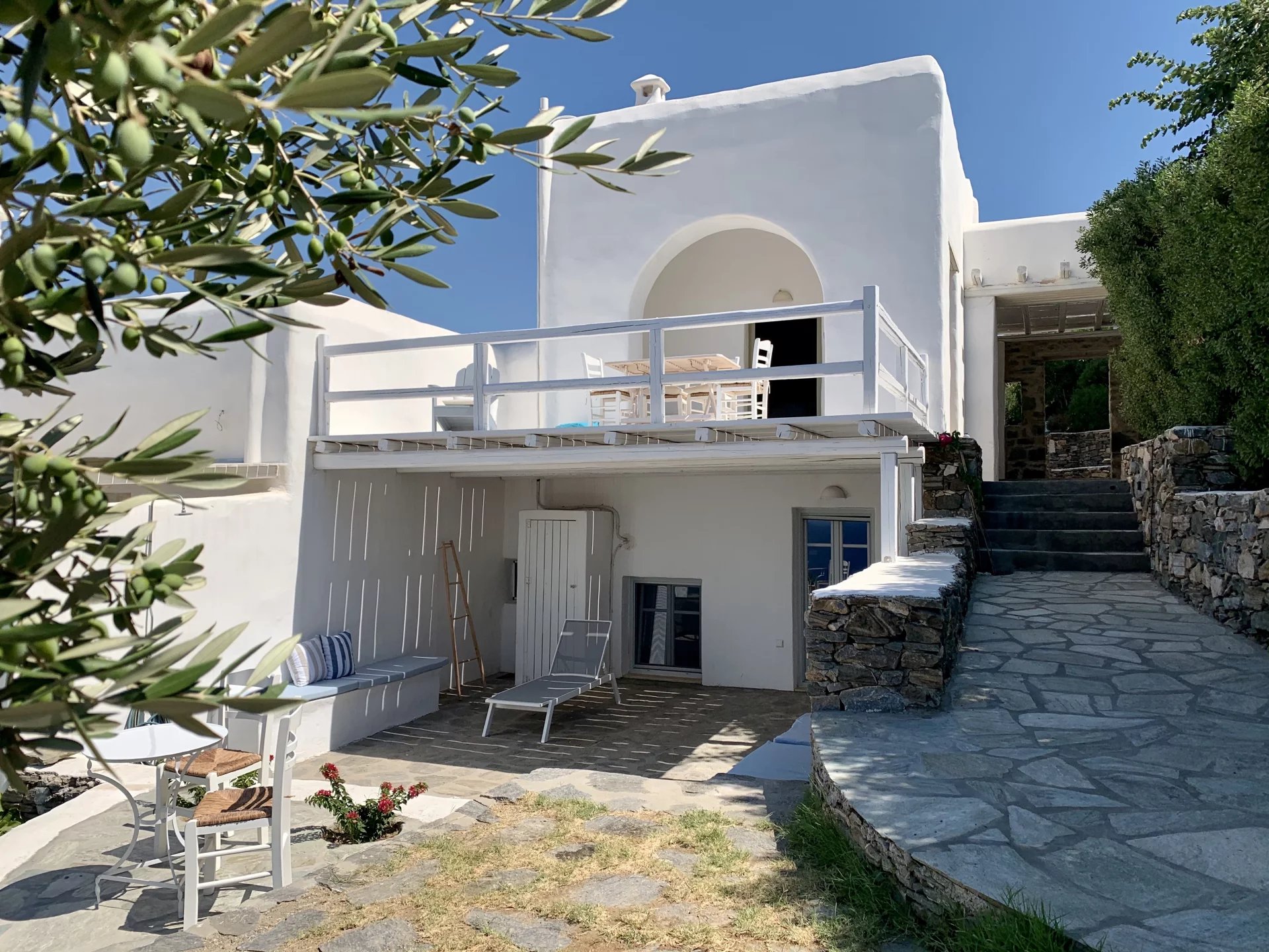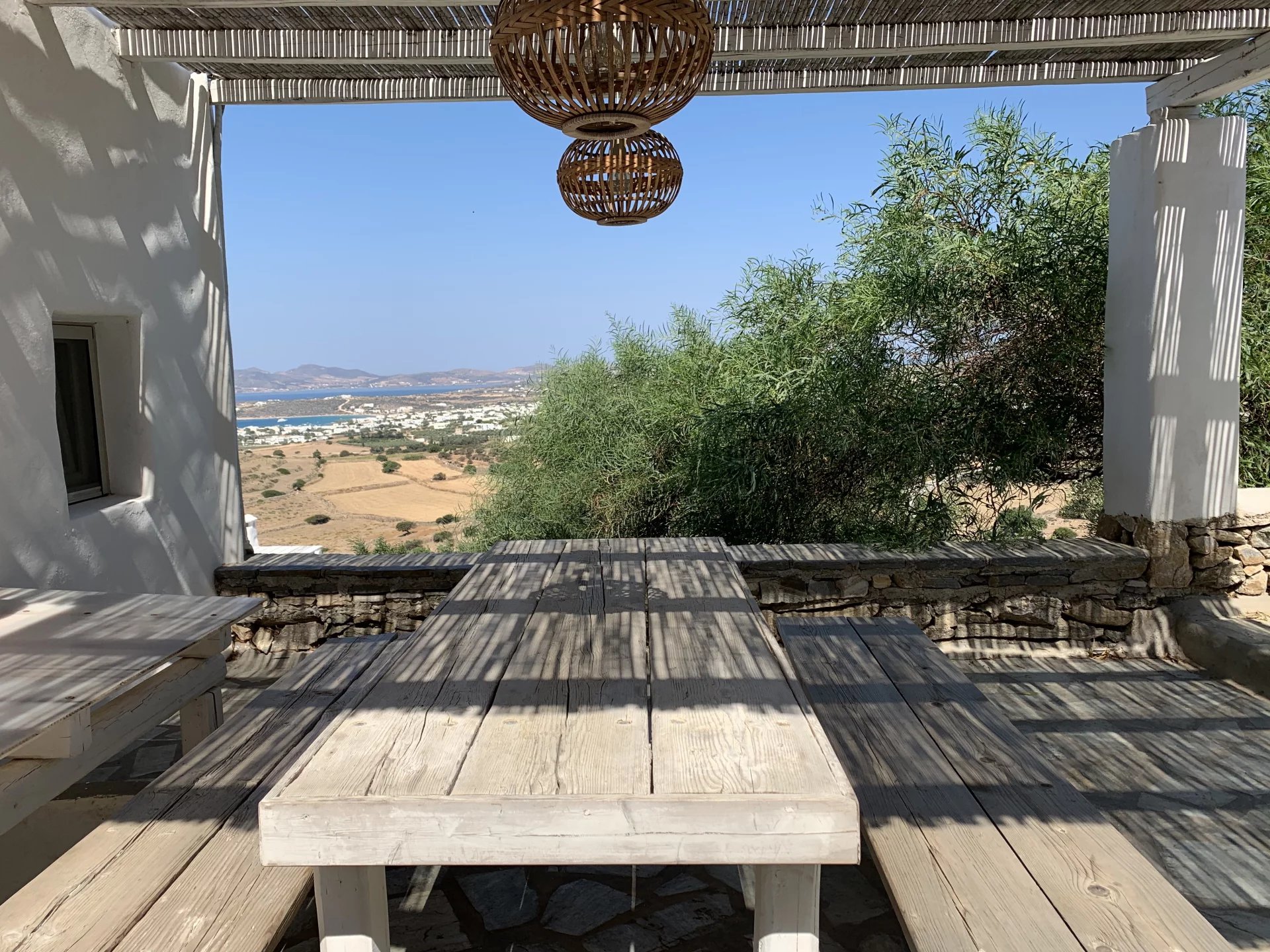 Dans un petit domaine, à moins d'1 kilomètre d'une des plages les plus convoitées de l'île, maison de style cycladique avec une vue imprenable sur la mer et les collines. Salon avec cheminée, cuisine ouverte aménagée et équipée (réfrigérateur, plaques de cuisson, four, lave vaisselle, bouilloire, machine à café), 2 chambres + 1 chambre en mezzanine, 2 salles de douche, 2 wc. Air conditionné et machine à laver le linge. Un joli jardin et différentes terrasses vous permettent de bénéficier des plus belles vues de l’île tout au long de la journée. Décoration soignée. Prix : Entre 1595€ et 2795€ par semaine selon la saison.