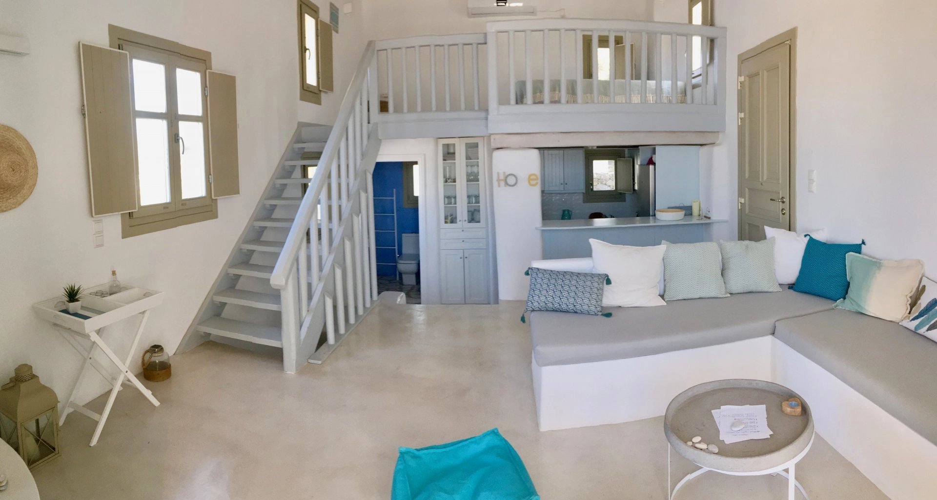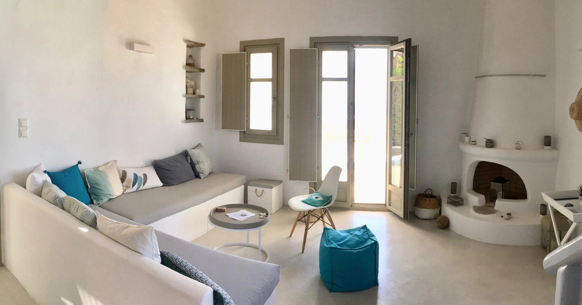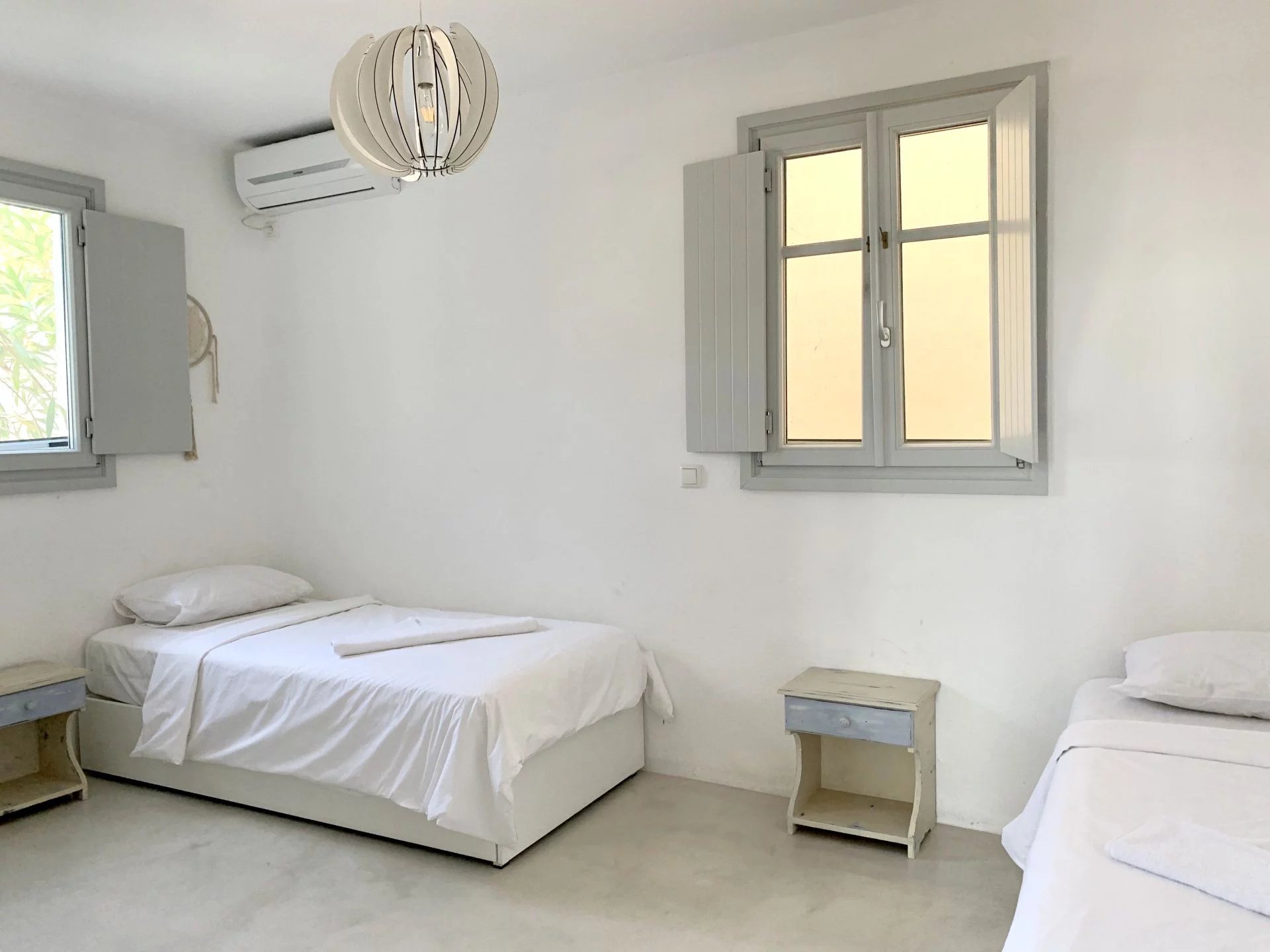Dans un petit domaine, à moins d'1 kilomètre d'une des plages les plus convoitées de l'île, maison de style cycladique avec une vue imprenable sur la mer et les collines. Salon avec cheminée, cuisine ouverte aménagée et équipée (réfrigérateur, plaques de cuisson, four, lave vaisselle, bouilloire, machine à café), 2 chambres + 1 chambre en mezzanine, 2 salles de douche, 2 wc. Air conditionné et machine à laver le linge. Un joli jardin et différentes terrasses vous permettent de bénéficier des plus belles vues de l’île tout au long de la journée. Décoration soignée. Prix : Entre 1595€ et 2795€ par semaine selon la saison.