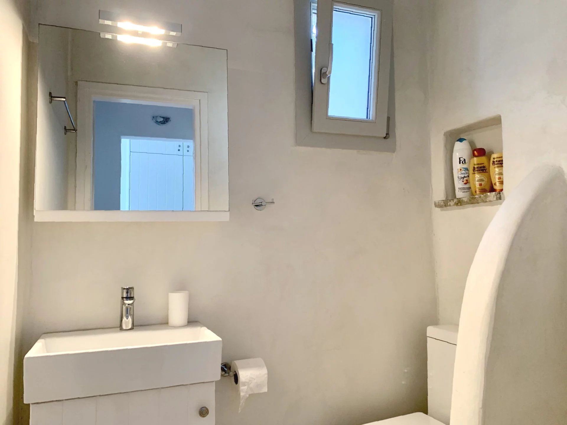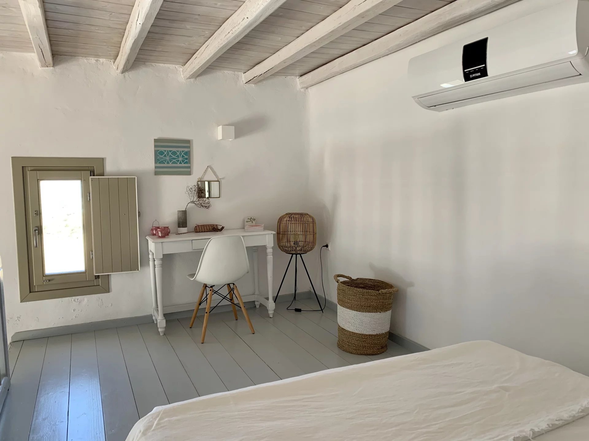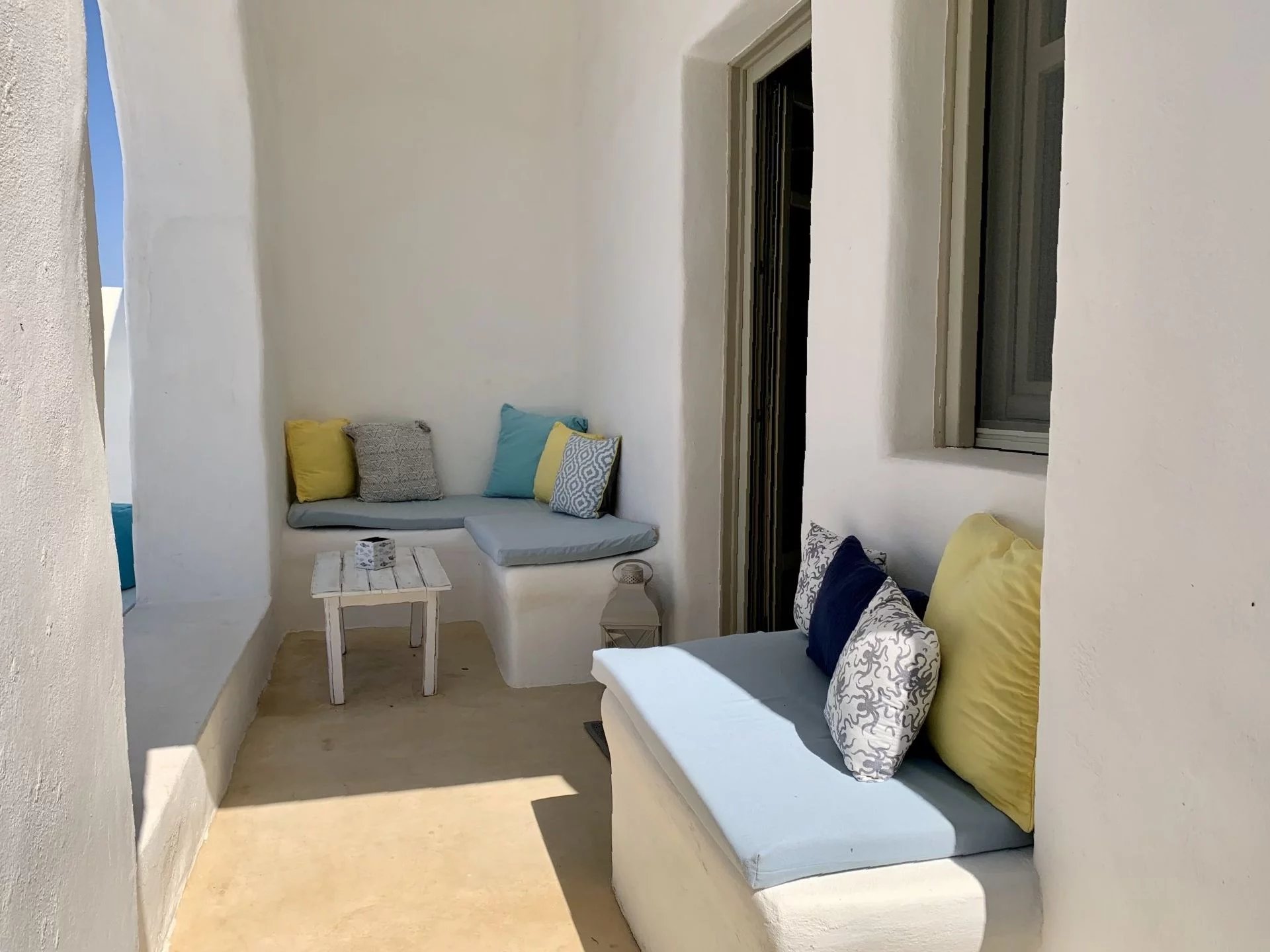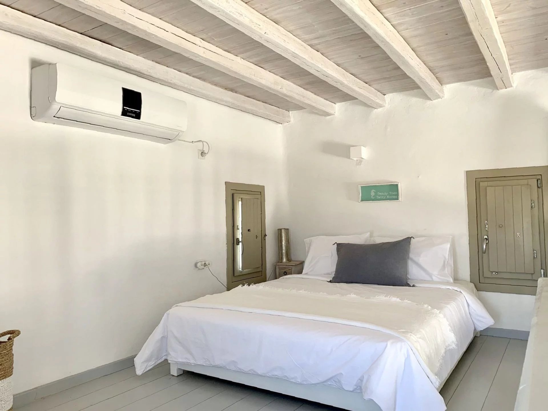 Dans un petit domaine, à moins d'1 kilomètre d'une des plages les plus convoitées de l'île, maison de style cycladique avec une vue imprenable sur la mer et les collines. Salon avec cheminée, cuisine ouverte aménagée et équipée (réfrigérateur, plaques de cuisson, four, lave vaisselle, bouilloire, machine à café), 2 chambres + 1 chambre en mezzanine, 2 salles de douche, 2 wc. Air conditionné et machine à laver le linge. Un joli jardin et différentes terrasses vous permettent de bénéficier des plus belles vues de l’île tout au long de la journée. Décoration soignée. Prix : Entre 1595€ et 2795€ par semaine selon la saison.