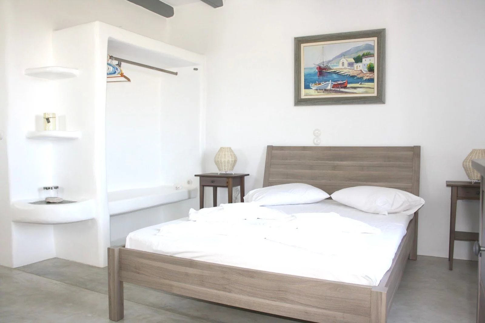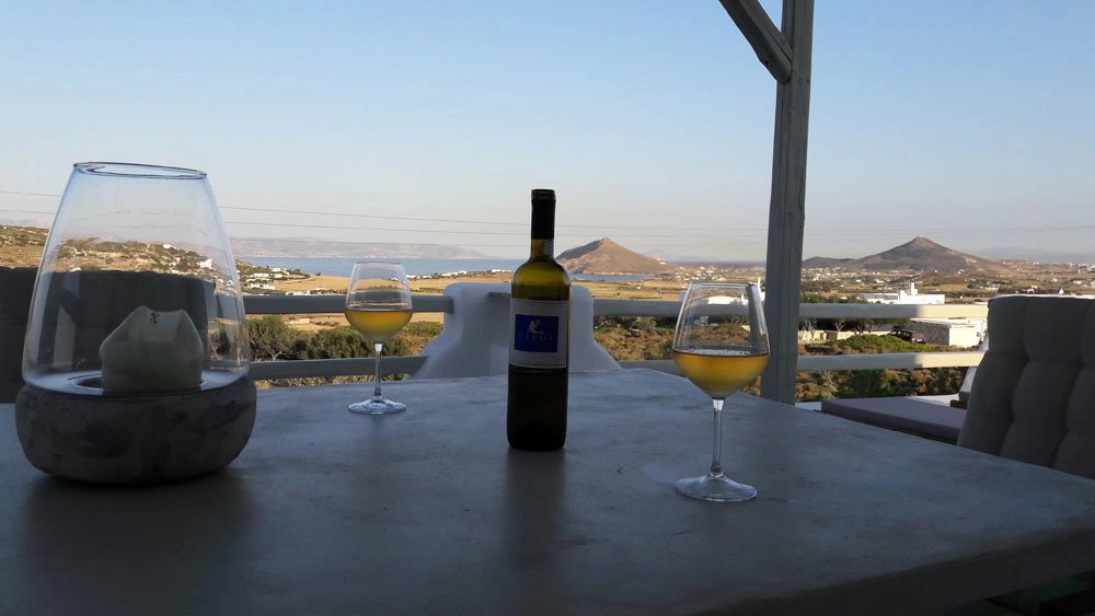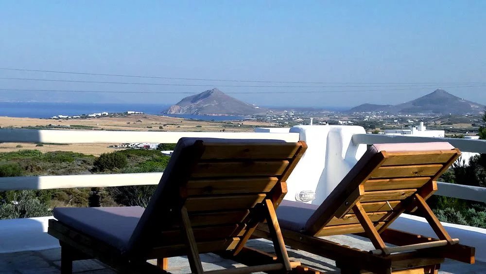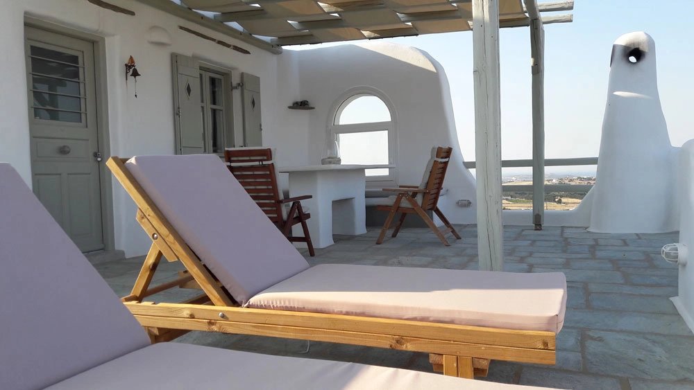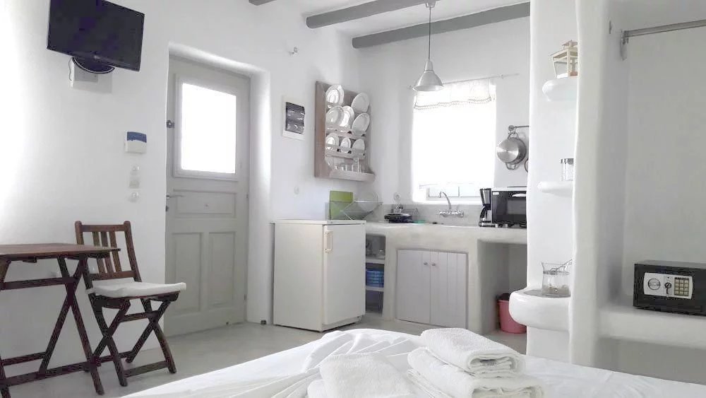 Paros - Isterni, à 2 km de Naoussa, dans un complexe de cinq maisons. Situé dans une zone rurale avec une vue imprenable sur la mer, Naxos et MYKONOS. Le studio de 32m², au premier étage avec sa grande terrasse privée avec vue dégagée et imprenable sur mer. Le studio est lumineux, composé d'une chambre, d'une salle de douche/wc, entièrement meublé, avec sa kitchenette équipée, alarme, Wi-Fi, parking ouvert. Ménage et changement draps et serviettes tous les 3 jours. Lit bébé et chaise haute sont disponibles sur demande. Tarif pour 2 personnes (35€/jour en plus pour toute personne supplémentaire) selon la saison entre 605€ et 1210€ la semaine TTC
