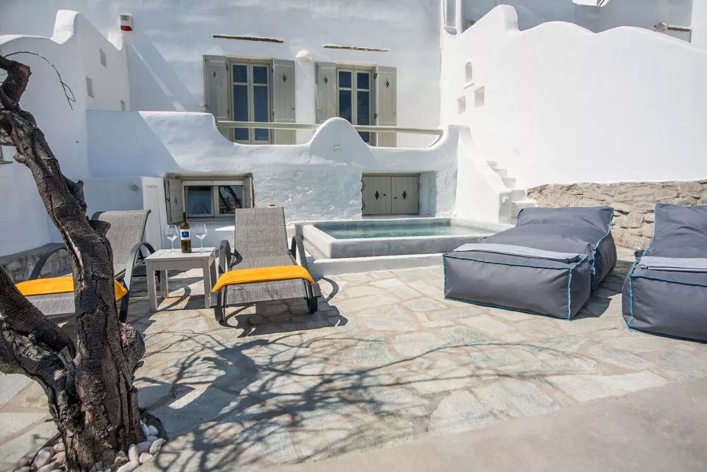 • Terrasse avec jacuzzi, salon de jardin, poufs et transats