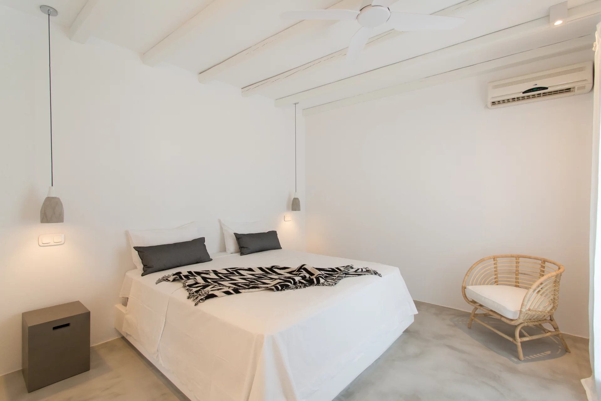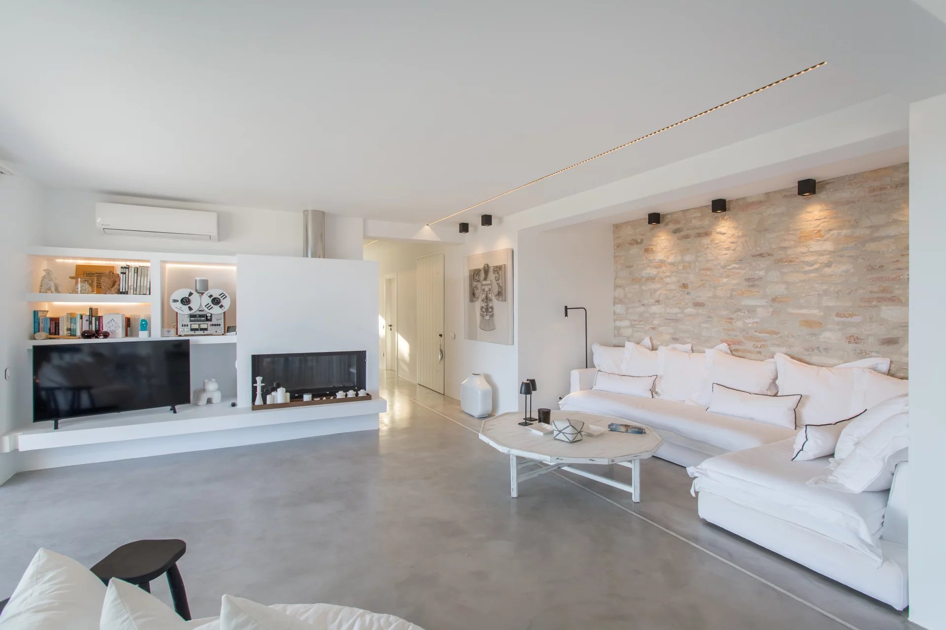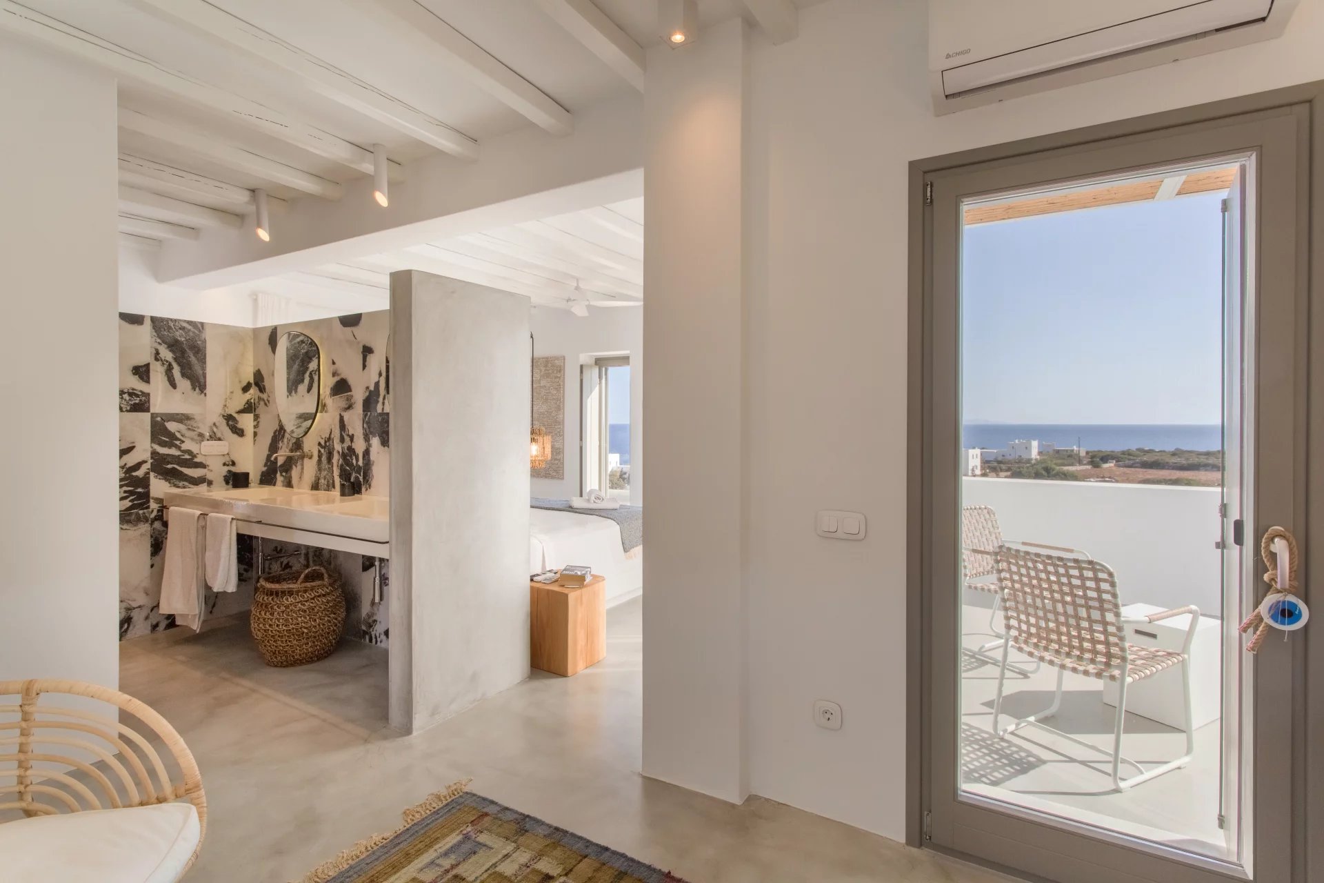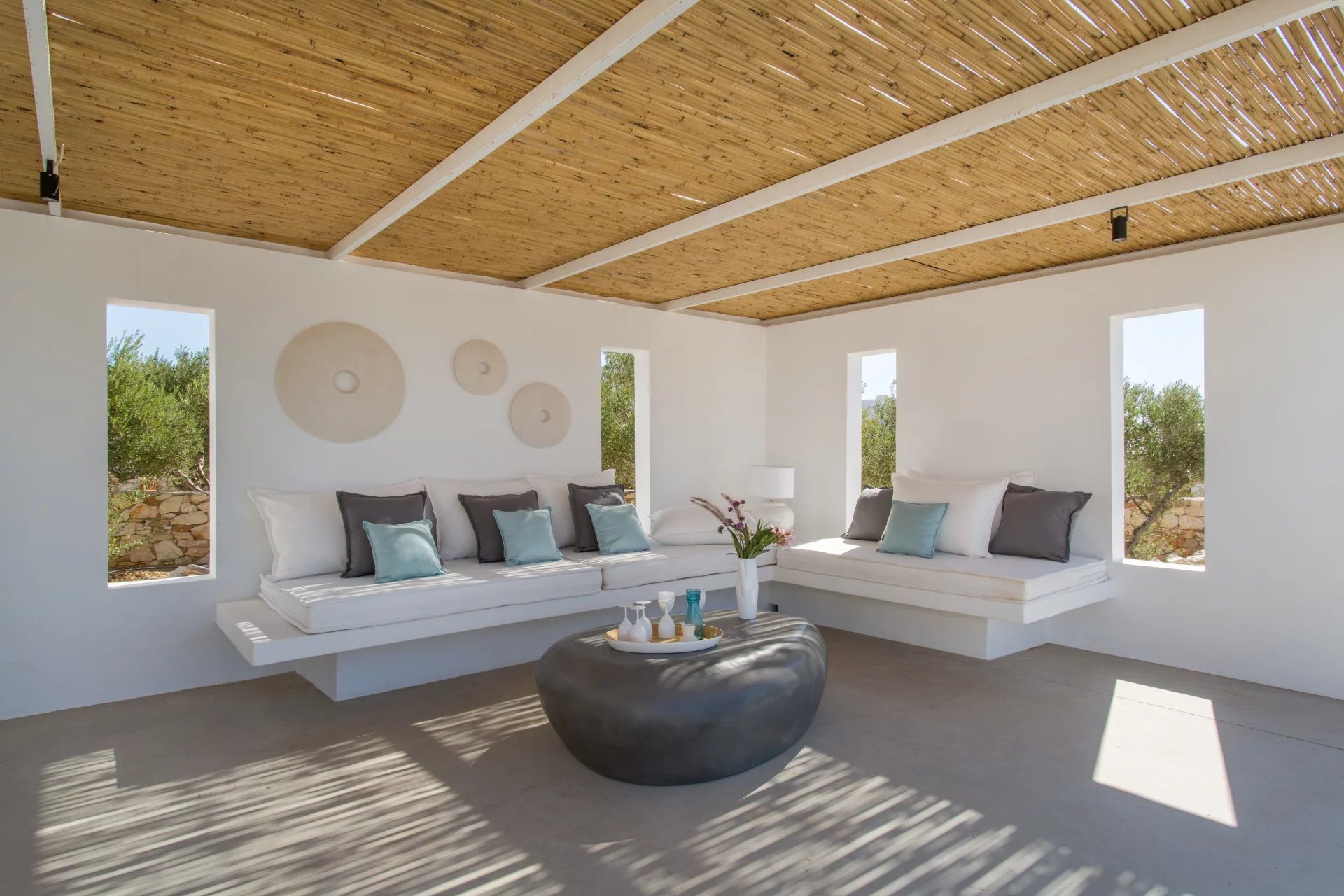 La villa est répartie sur deux niveaux et comprend un espace de vie ouvert vers l'extérieur, créant ainsi un vaste espace de détente en plein air, quatre chambres spacieuses avec chacune leur salle de bains et terrasse, et un studio indépendant, tous équipés de mobilier design et d'appareils électroménagers de première qualité.