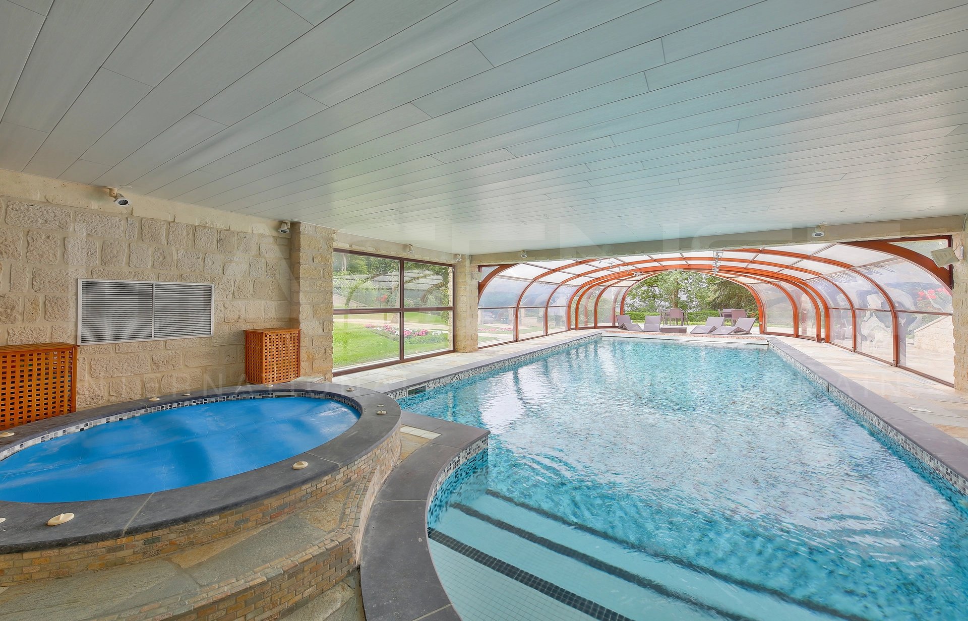 Dans le hall d'entrée, un bel escalier mène à 4 chambres à l’étage et au sous-sol à une piscine intérieure et extérieure avec coin jacuzzi ouvrant sur une vaste terrasse donnant sur un beau jardin paysager de 6000 m² clos et sans vis à vis. L'entrée dessert également une grande salle de cinéma, un bureau privé et sécurisé, un bar. Plus loin, l'espace de vie principal comprend un grand salon avec sa cheminée, une salle à manger et une cuisine superbement équipée.