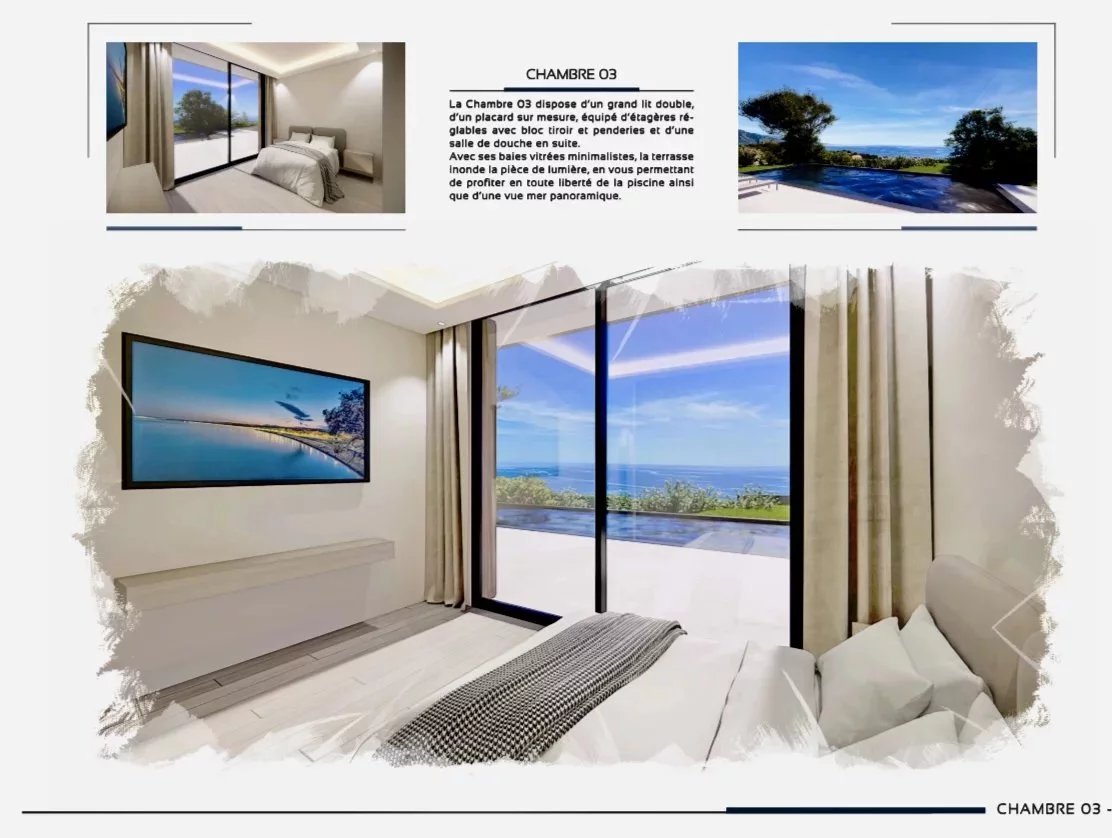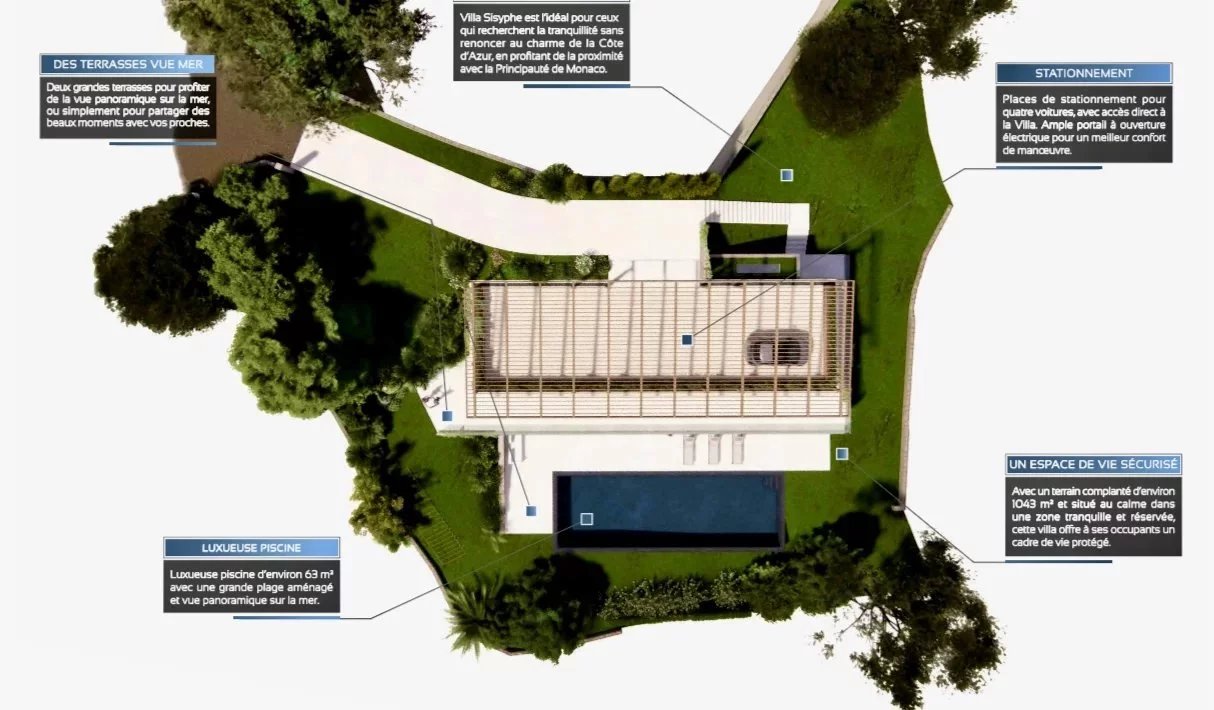 Arroccato sulle colline più ambite di Roquebrune-Cap-Martin, a pochi minuti dalla prestigiosa Principauté de Monaco, scopri questo raro terreno di 1.043 m², venduto con permesso di costruire approvato per una villa contemporanea di 270 m². Un progetto immerso in un contesto esclusivo e tranquillo, con una vista mozzafiato sul Mar Mediterraneo. Villa Sisyphe, concepita come una vera opera d’arte architettonica, incarna l’eleganza francese attraverso la luce, lo spazio e la raffinatezza. Vanta una vista panoramica spettacolare sul mare azzurro, a pochi passi da palazzi rinomati, ristoranti stellati Michelin e dagli eventi iconici della Costa Azzurra. Una villa d’eccezione pensata per un comfort assoluto Distribuita su due livelli, la villa offre ampi spazi e finiture di pregio: • Terrazza sul tetto con parcheggio privato per 4 veicoli • Piano giardino (156 m²): soggiorno e sala da pranzo spaziosi e luminosi, cucina di design completamente attrezzata, dispensa/lavanderia, due camere da letto con bagno privato, toilette per gli ospiti, ampia terrazza, piscina e giardino paesaggistico • Piano superiore (114 m²): ingresso maestoso, suite padronale con cabina armadio e bagno privato, due ulteriori camere da letto en suite, toilette per gli ospiti, terrazza panoramica Lusso, serenità e arte di vivere Ogni dettaglio è stato studiato con cura per creare un ambiente abitativo al tempo stesso lussuoso e intimo, in perfetta armonia con la natura circostante e la vista sul Mediterraneo. Villa Sisyphe è una promessa di pace e serenità, a pochi passi dal dinamismo e dal glamour di Monaco. Questo terreno raro rappresenta un’opportunità unica sulla Costa Azzurra. Per una visita esclusiva o per maggiori informazioni, contattaci oggi stesso.