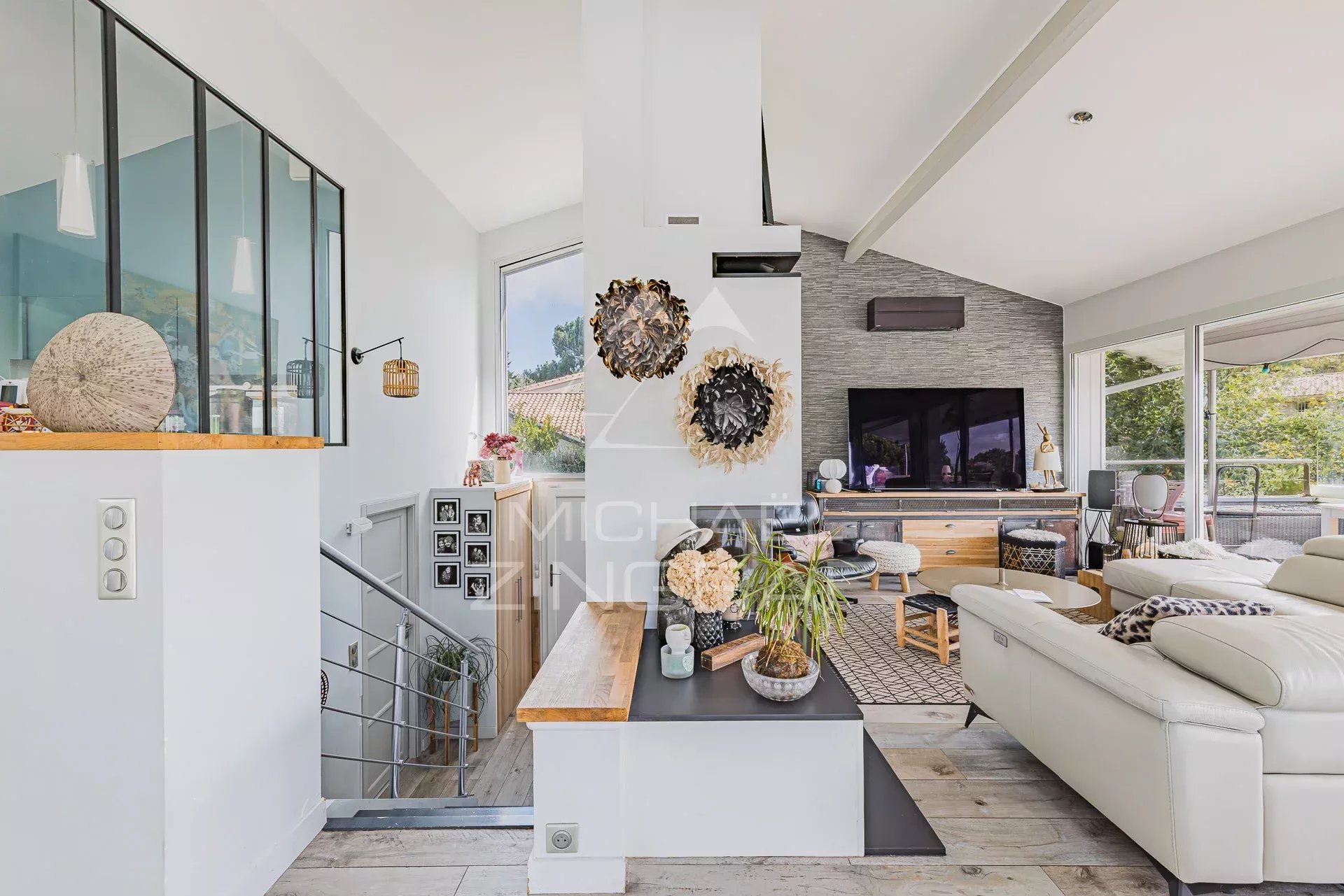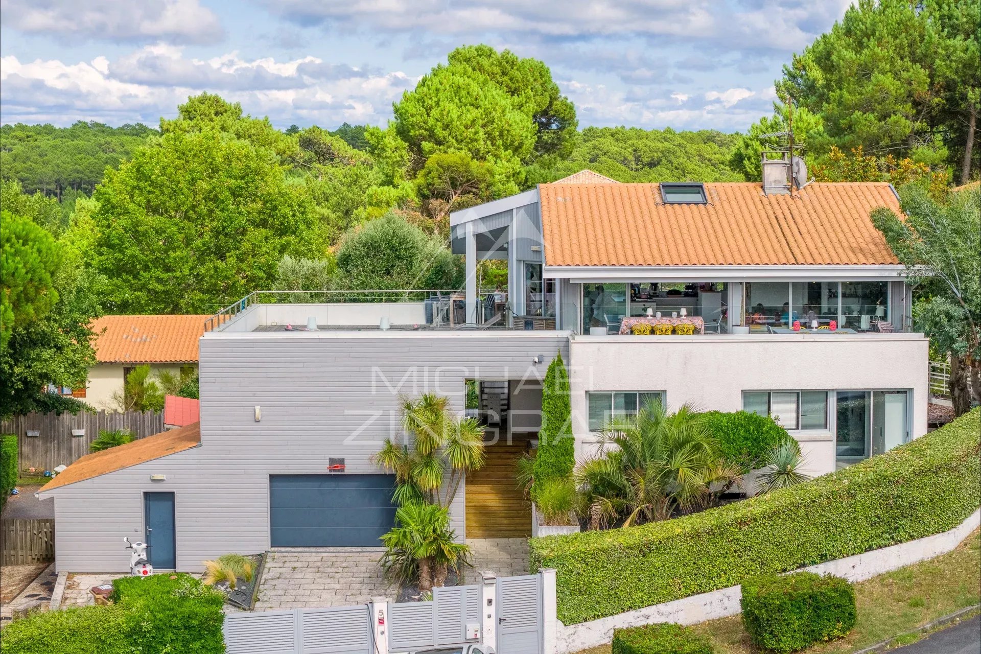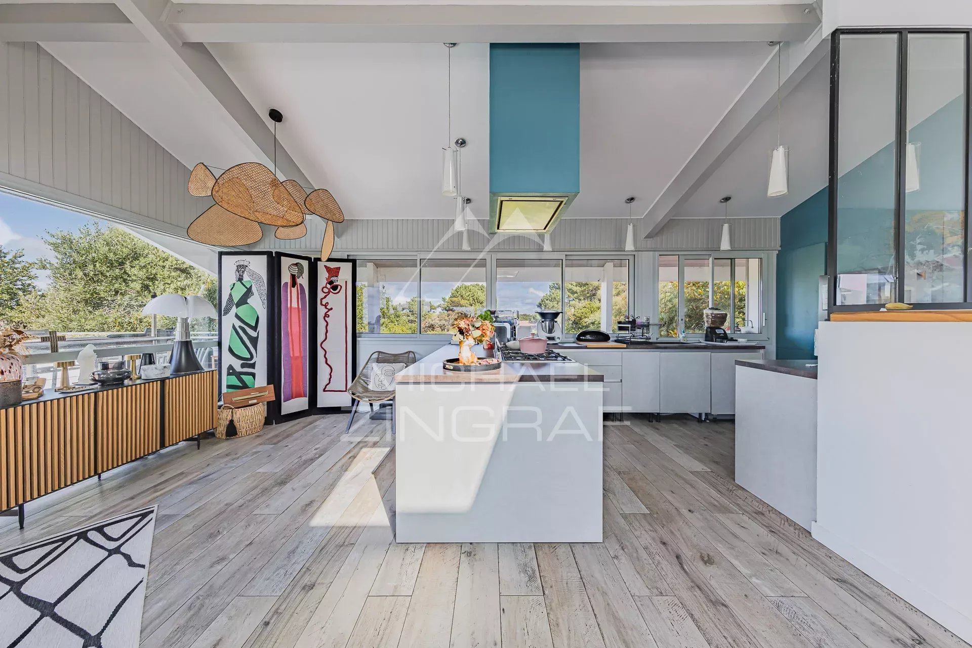 Michaël Zingraf Real Estate vous propose en exclusivité cette somptueuse villa contemporaine située au cœur de Pyla-sur-Mer, offrant un panorama exceptionnel sur le bassin d’Arcachon, l’océan et le célèbre phare du Cap Ferret. Cette propriété d’exception séduit par son architecture élégante, ses prestations haut de gamme et son atmosphère à la fois raffinée et conviviale. Dès l’entrée, vous découvrirez une vaste pièce de vie baignée de lumière grâce à de larges baies vitrées. L’espace salon, agrémenté d’une cheminée moderne, se prolonge par une cuisine ouverte parfaitement équipée, créant un lieu idéal pour partager des moments uniques en famille ou entre amis. L’ensemble s’ouvre sur une terrasse généreuse offrant un cadre spectaculaire, complété par une piscine invitant à la détente face à une vue à couper le souffle. La villa dispose de trois chambres spacieuses, chacune avec sa propre salle d’eau, garantissant confort et intimité à ses occupants. Un studio indépendant, aménagé en chambre d’amis, constitue un véritable avantage pour accueillir vos proches en toute autonomie. Un vaste garage complète ce bien rare, offrant à la fois un espace de stationnement sécurisé et de nombreuses possibilités de rangement.