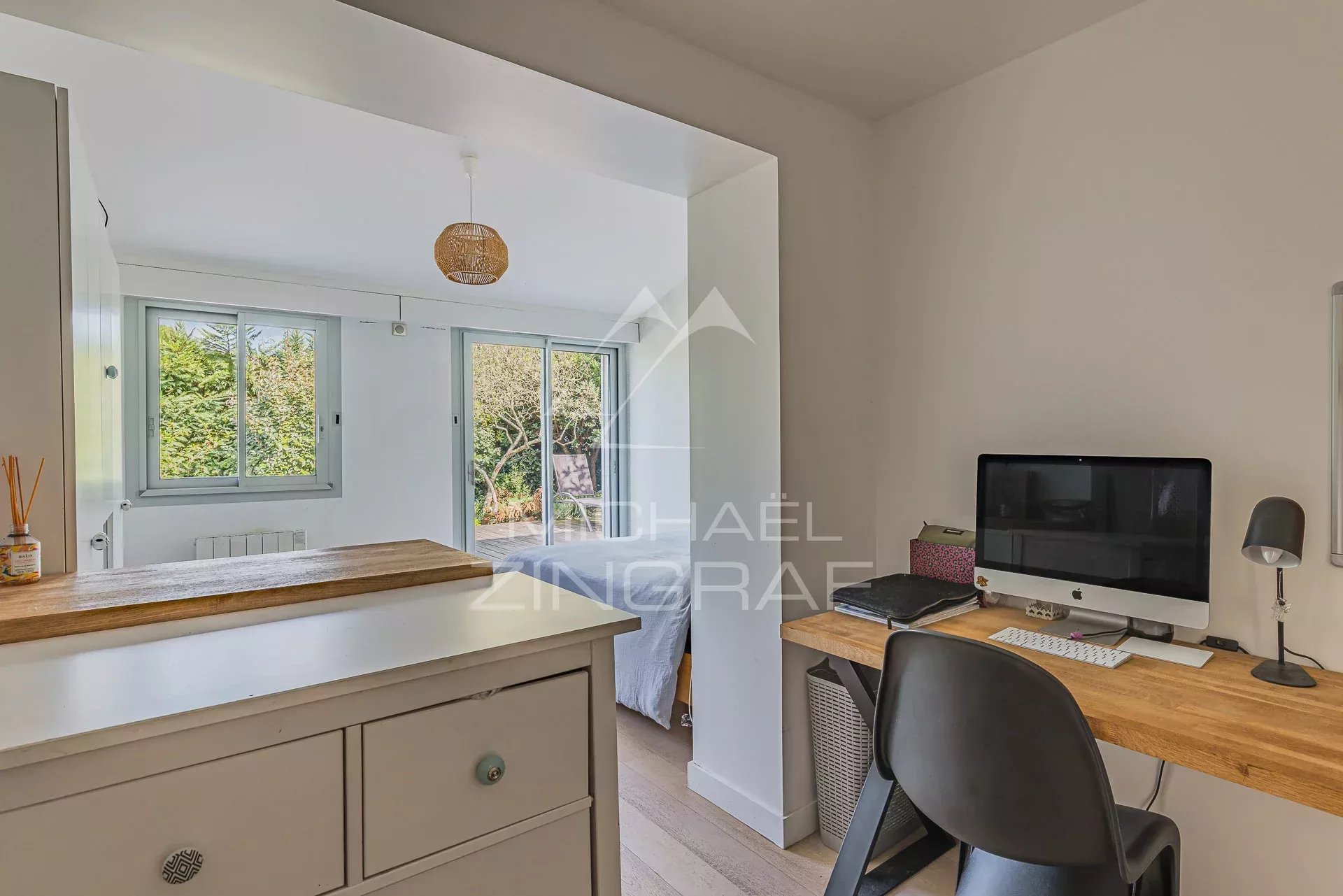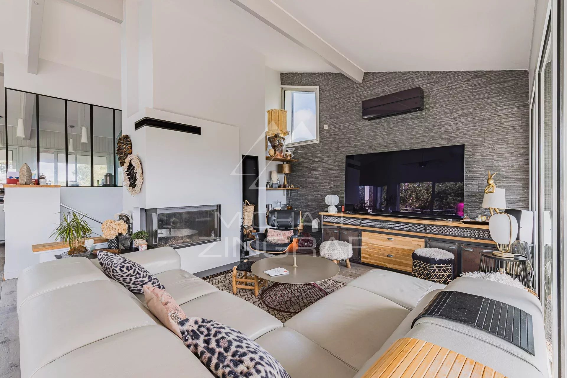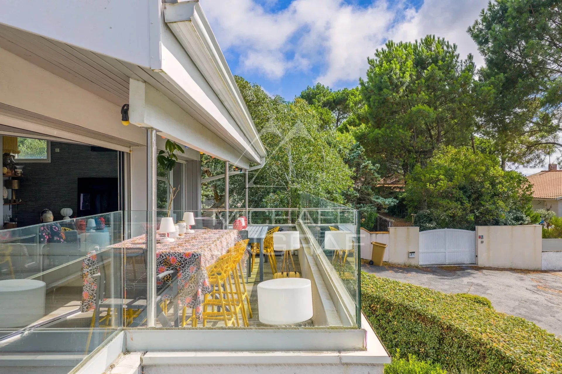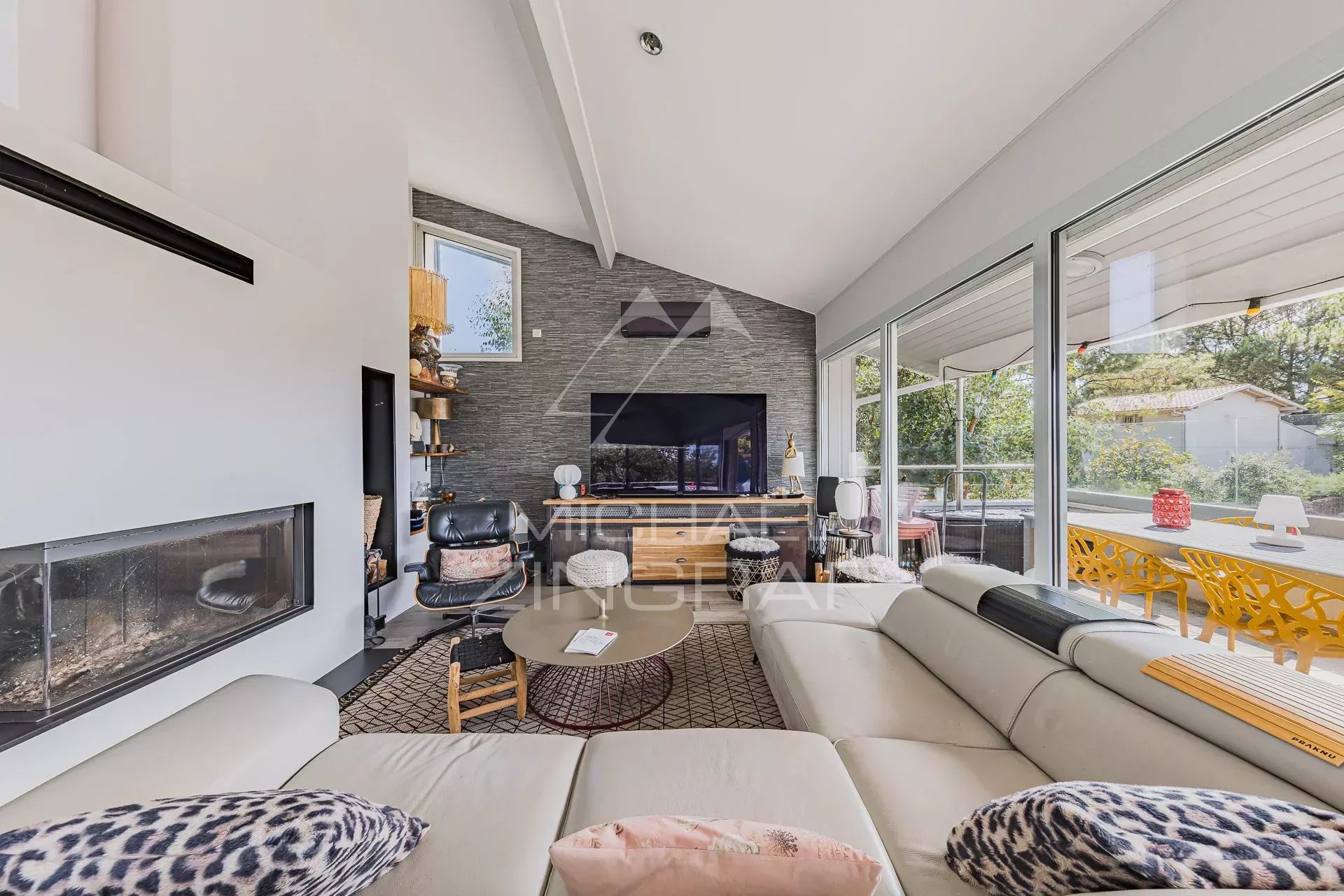 Michaël Zingraf Real Estate vous propose en exclusivité cette somptueuse villa contemporaine située au cœur de Pyla-sur-Mer, offrant un panorama exceptionnel sur le bassin d’Arcachon, l’océan et le célèbre phare du Cap Ferret. Cette propriété d’exception séduit par son architecture élégante, ses prestations haut de gamme et son atmosphère à la fois raffinée et conviviale. Dès l’entrée, vous découvrirez une vaste pièce de vie baignée de lumière grâce à de larges baies vitrées. L’espace salon, agrémenté d’une cheminée moderne, se prolonge par une cuisine ouverte parfaitement équipée, créant un lieu idéal pour partager des moments uniques en famille ou entre amis. L’ensemble s’ouvre sur une terrasse généreuse offrant un cadre spectaculaire, complété par une piscine invitant à la détente face à une vue à couper le souffle. La villa dispose de trois chambres spacieuses, chacune avec sa propre salle d’eau, garantissant confort et intimité à ses occupants. Un studio indépendant, aménagé en chambre d’amis, constitue un véritable avantage pour accueillir vos proches en toute autonomie. Un vaste garage complète ce bien rare, offrant à la fois un espace de stationnement sécurisé et de nombreuses possibilités de rangement.