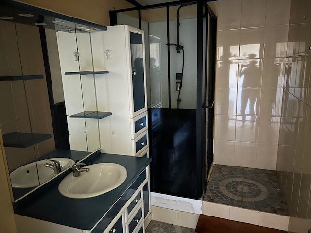 Un dégagement de 2,26 m2 dessert une salle d'eau de 4,69 m2 composée d'une douche et d'un meuble une vasque, une buanderie / lingerie de 7,40 m2 (sol béton) ainsi qu'une cave / cellier de 11,88 m2 (sol en terre battue).