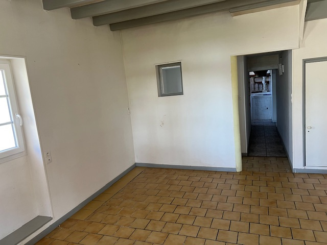 Un couloir de 2,78 m2 (sol carrelé) mène à un bureau de 6,50 m2, un WC indépendant avec lave-mains, ainsi qu'à une cuisine de 8,76 m2 aménagée avec des éléments en bois et partiellement équipée d'une hotte et d'une plaque de cuisson quatre feux au gaz.