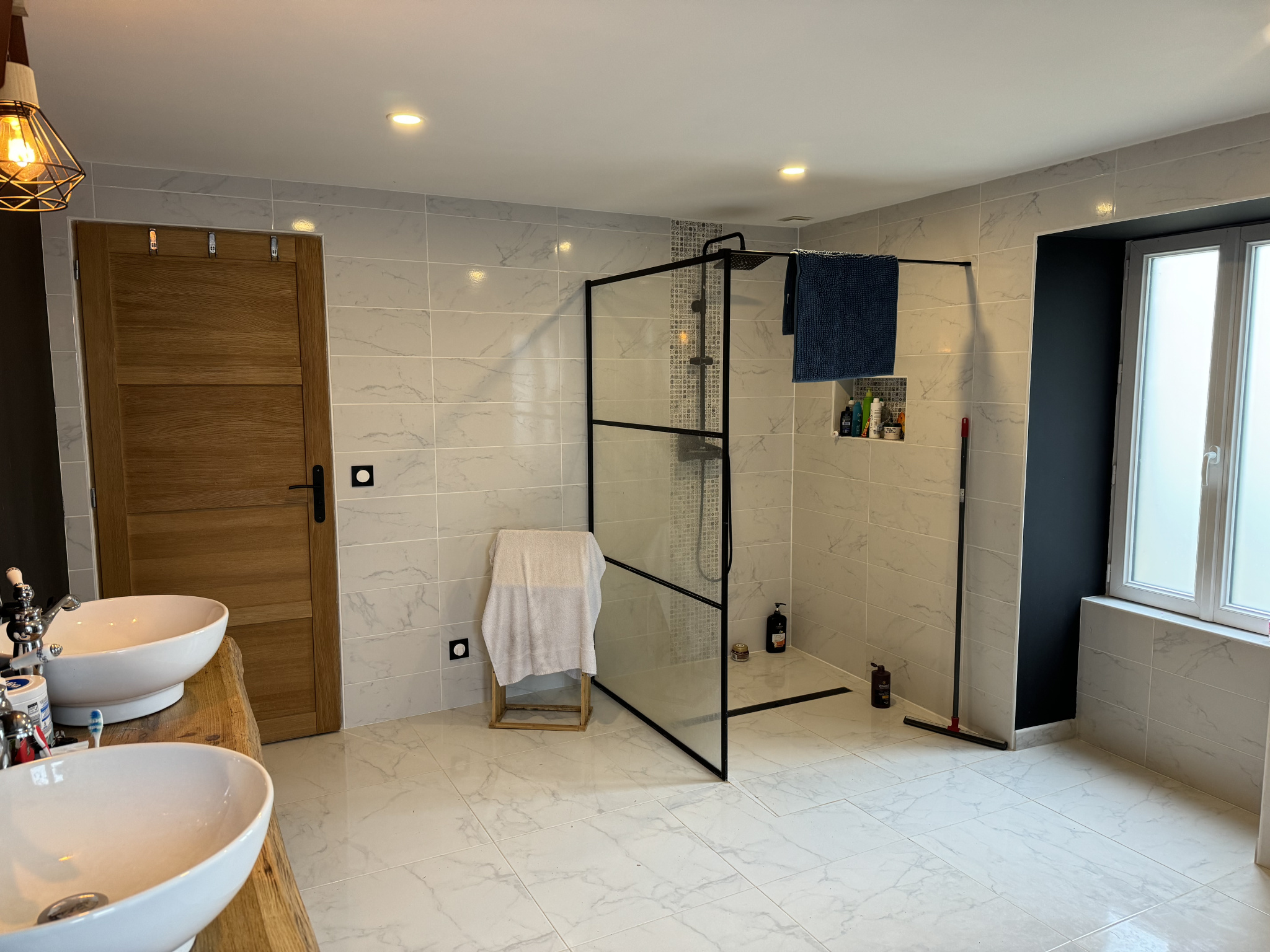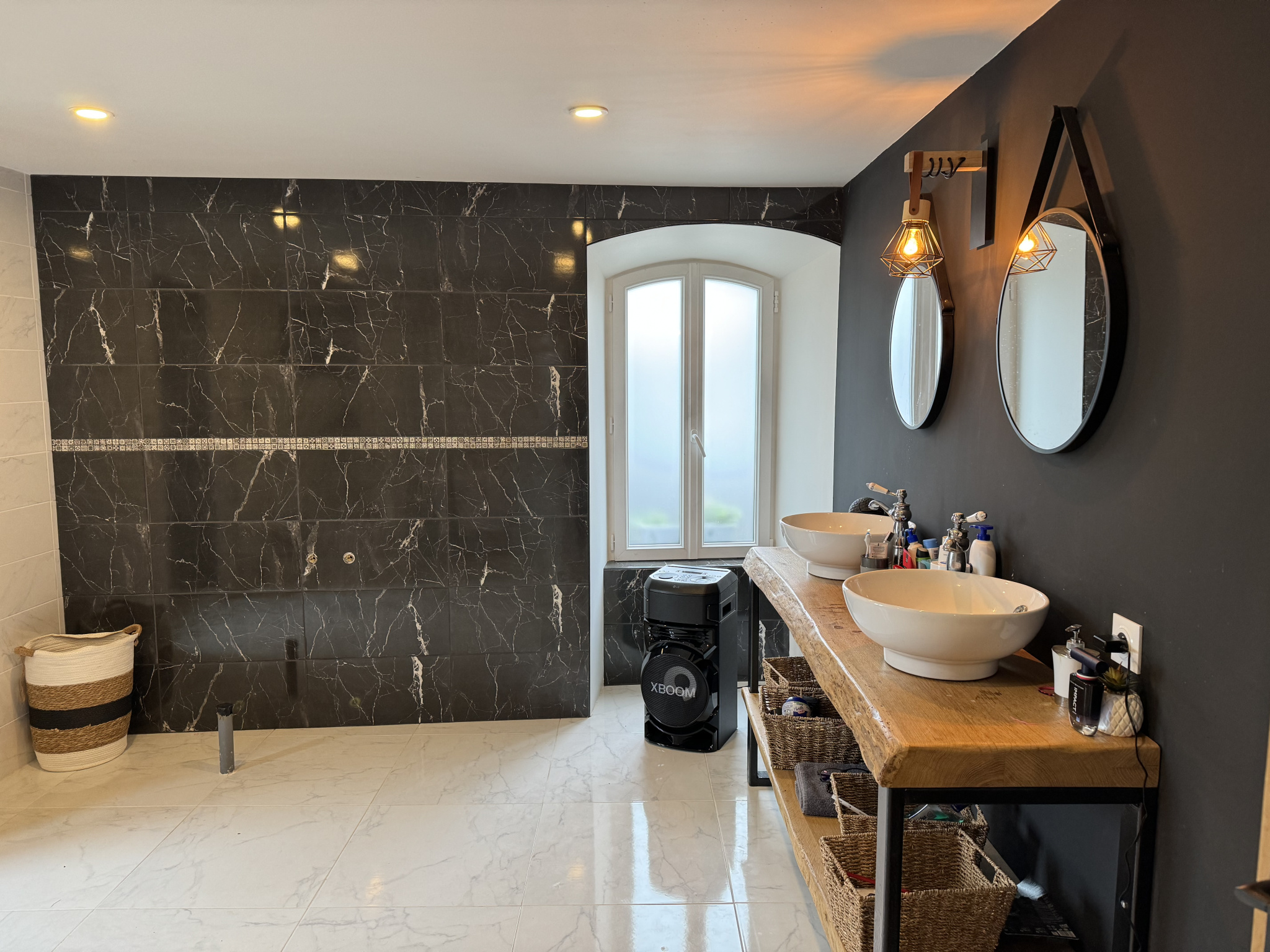 Rénovation de qualité, travertin, poutres apparentes, assainissement conforme, électricité neuve, menuiseries neuves...